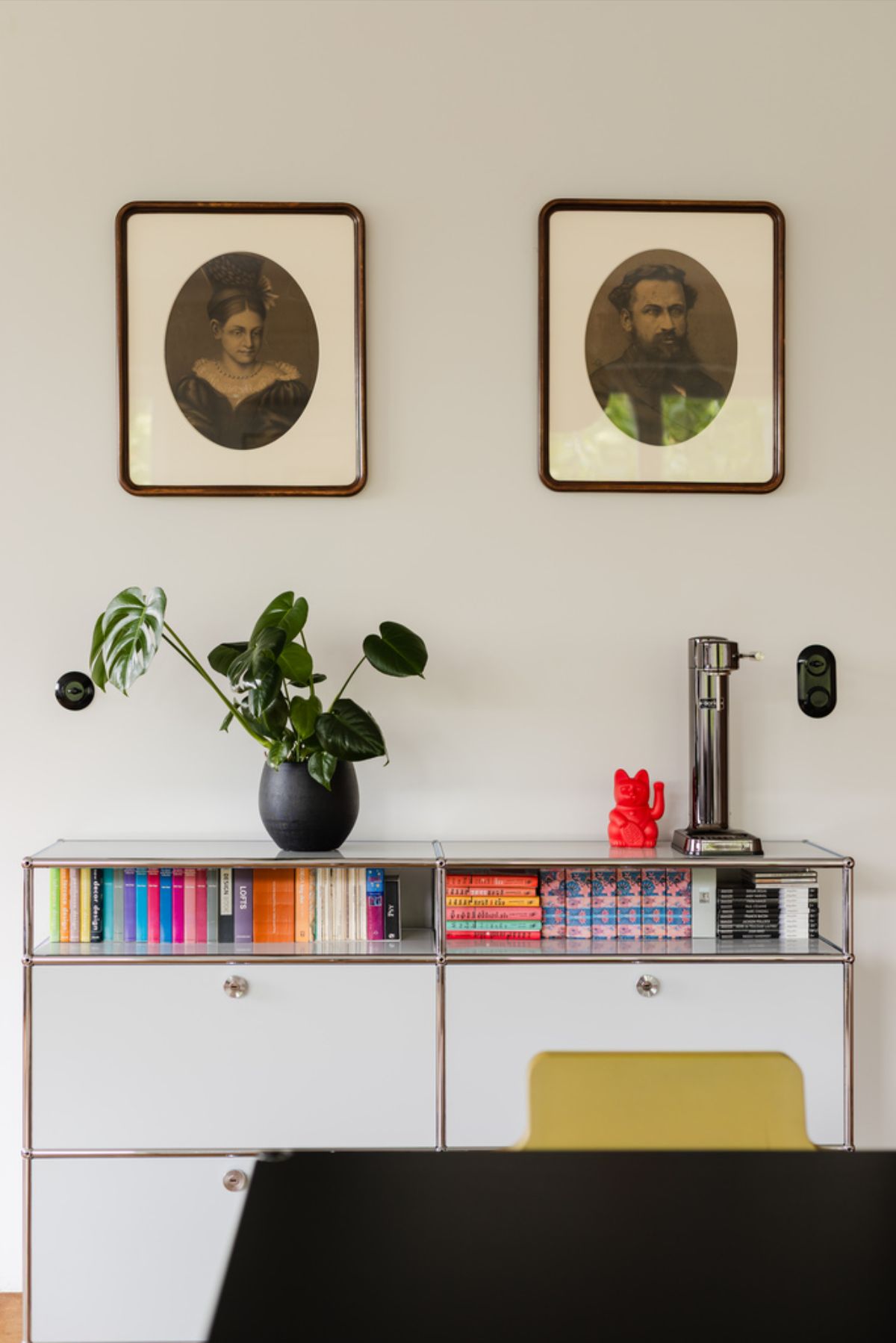 Widoczna od wejścia kuchnia zachwyca swoją lekkością: podwieszana biała zabudowa z ryflowanymi uchwytami, jasny, kamienny blat i srebrna, niemal niewidoczna armatura, sprawiają, że przestrzeń jest minimalistyczna, ale niepozbawiona charakteru. Niewątpliwie energii dodaje przestrzeni abstrakcyjny obraz Agnieszki Kicińskiej, stając się pierwszą wyraźną zapowiedzią artystycznych pasji właścicielki. Zachwyceni detalami przenieśmy wzrok na znajdują się obok strefą jadalnianą – miejsce spotkań z przyjaciółmi i rodziną. Tutaj główne skrzypce gra czarny designerski stół USM Haller otoczony geometrycznymi krzesłami w odcieniu limonkowej zieleni projektu Christophe’a Marchanda. Ten mocny kolorystyczny akcent wprowadza świeżość i lekkość do neutralnej bazy, a jednocześnie podkreśla charakter inwestorki, która świadomie łączy klasyczny design z wyrazistymi detalami. Całość wygląda spektakularnie, a to dopiero początek. Bo tuż obok odnajdujemy kolejną perełkę vintage – komodę USM Haller, dyskretnie przechowującą codzienne drobiazgi. Jej metaliczne elementy doskonale korespondują z metalowymi elementami pozostałych mebli i dodatków strefy wspólnej, jakby mimochodem tworząc powtarzający się motyw, który spaja całe wnętrze.