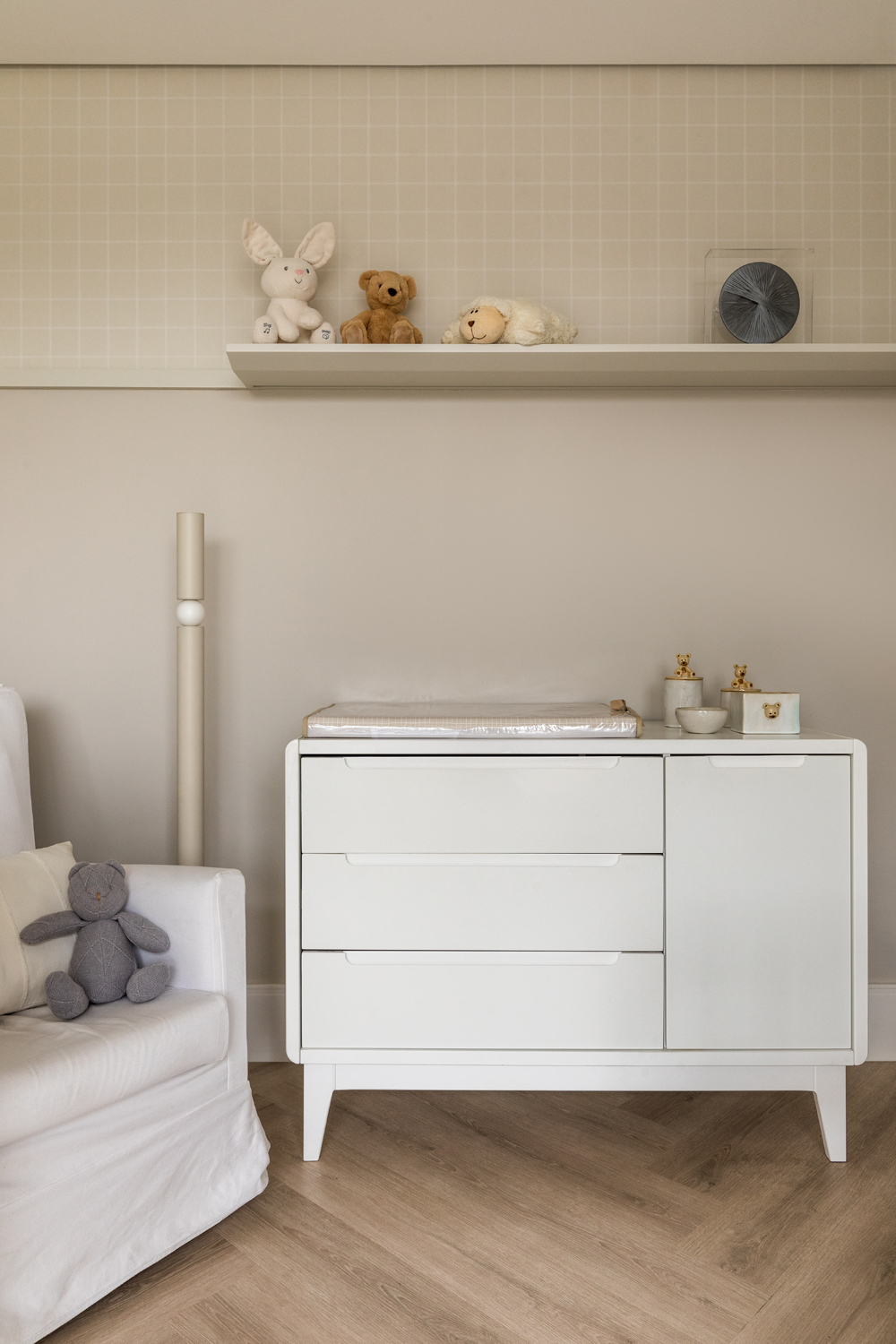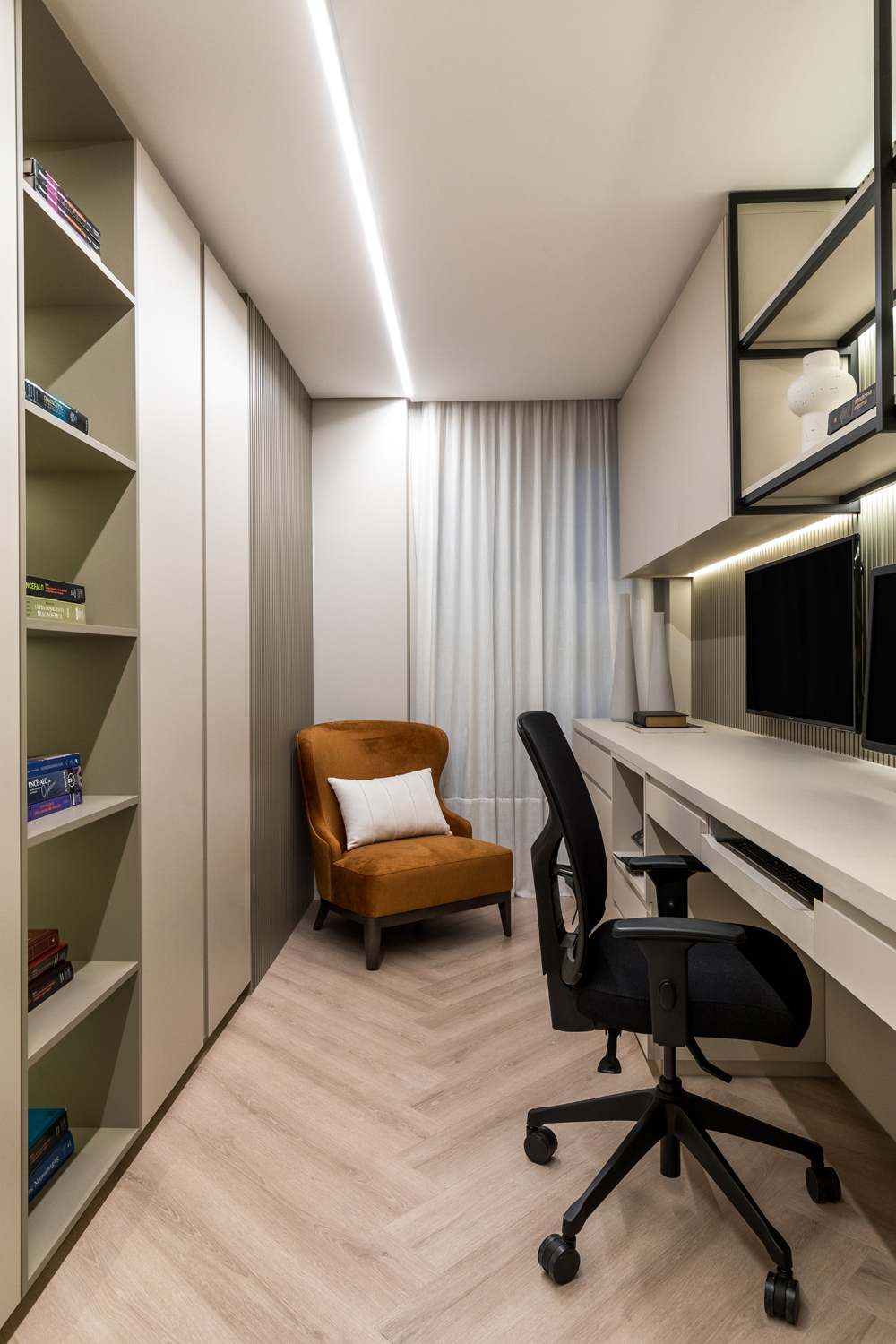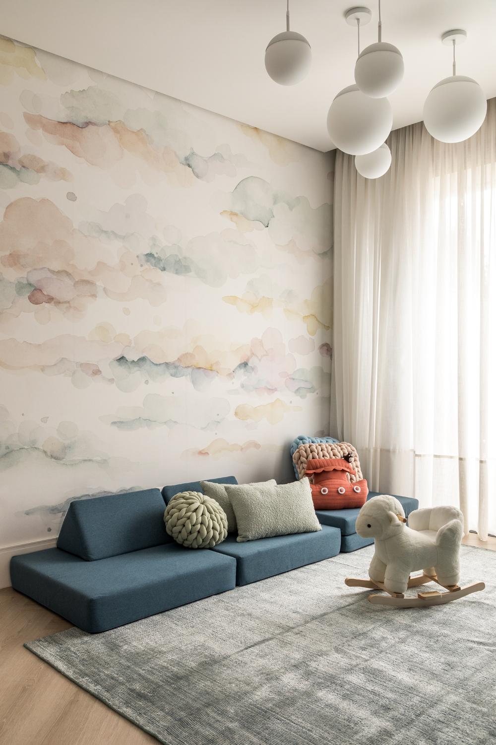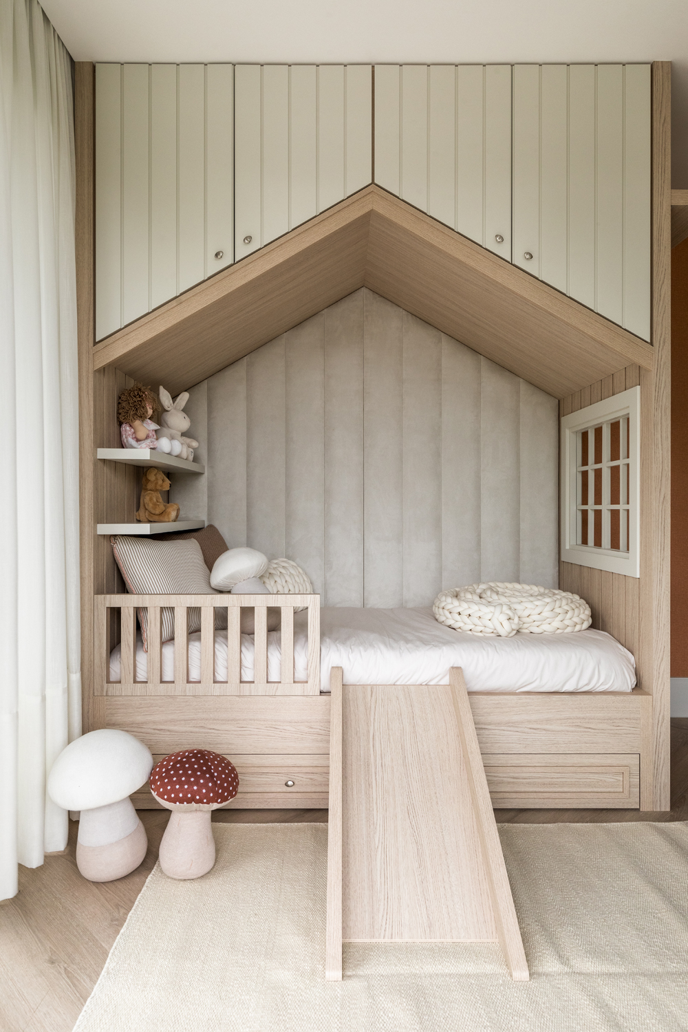 Domowe biuro pary zostało umieszczone obok rodzinnej strefy wypoczynku, zapewniając prywatność, a jednocześnie bliskość dzieci. Główna sypialnia obejmuje duży otwarty walk-in closet, natomiast pokoje dziecięce zaprojektowano w radosnej, zabawowej estetyce. Na parterze architektka stworzyła pokój zabaw w pobliżu stref wspólnych, dbając o praktyczność w codziennym życiu rodziny.