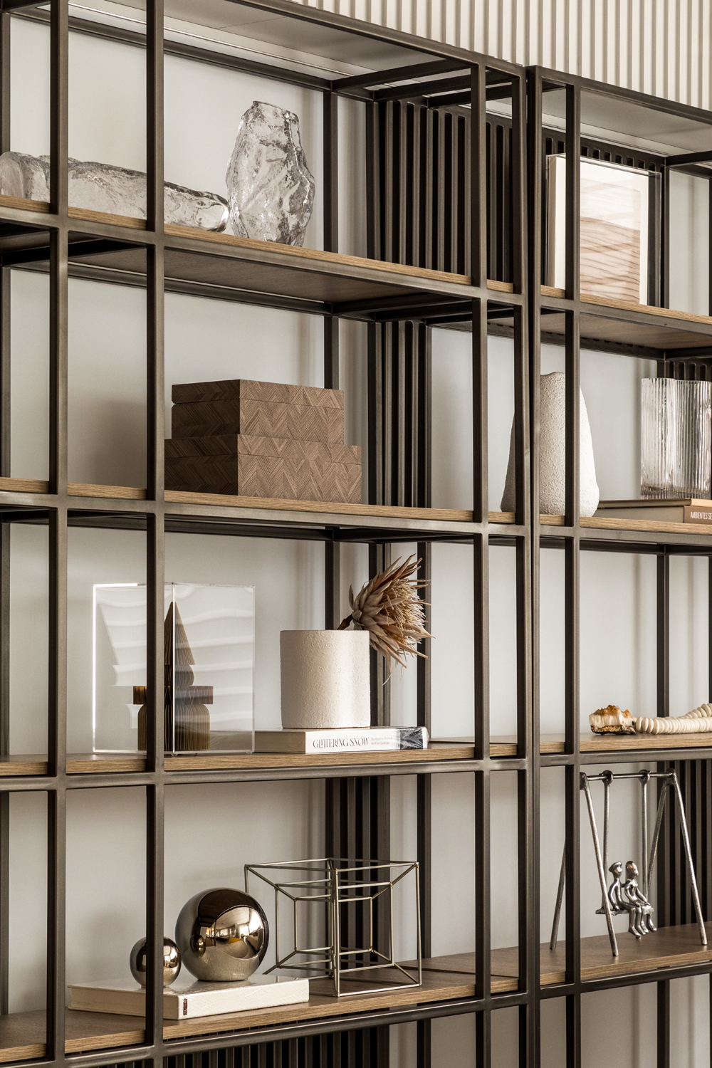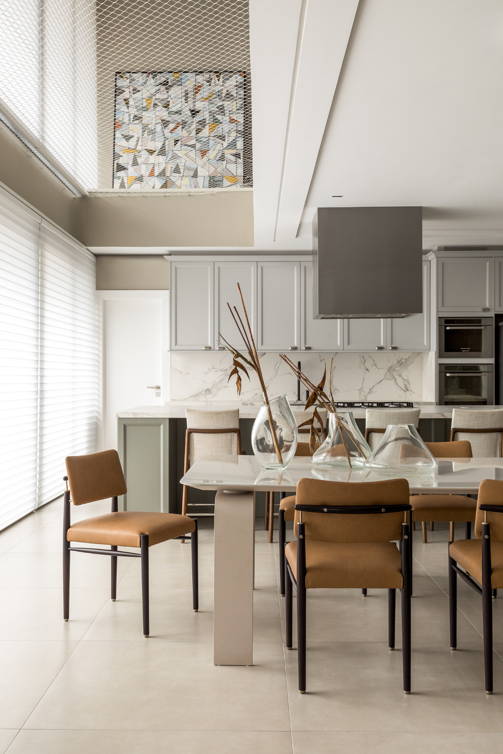 Projekt powstał na bazie pierwotnego układu mieszkania, co pozwoliło pracowni całkowicie przeprojektować propozycję dewelopera. Głównym wyzwaniem było powiększenie antresoli, aby pomieścić prywatną strefę wypoczynku dla rodziny, zintegrowaną z górnym poziomem. Rozwiązaniem było zastosowanie lekkiej konstrukcji metalowej, która umożliwiła zarówno redefinicję salonu – teraz bardziej przestronnego i połączonego – jak i stworzenie dużej, funkcjonalnej kuchni płynnie zintegrowanej z częścią dzienną. Wcześniej przestrzeń przeznaczona na kuchnię, jadalnię i pralnię miała podwójną wysokość, ale brakowało jej jasno określonej funkcji.