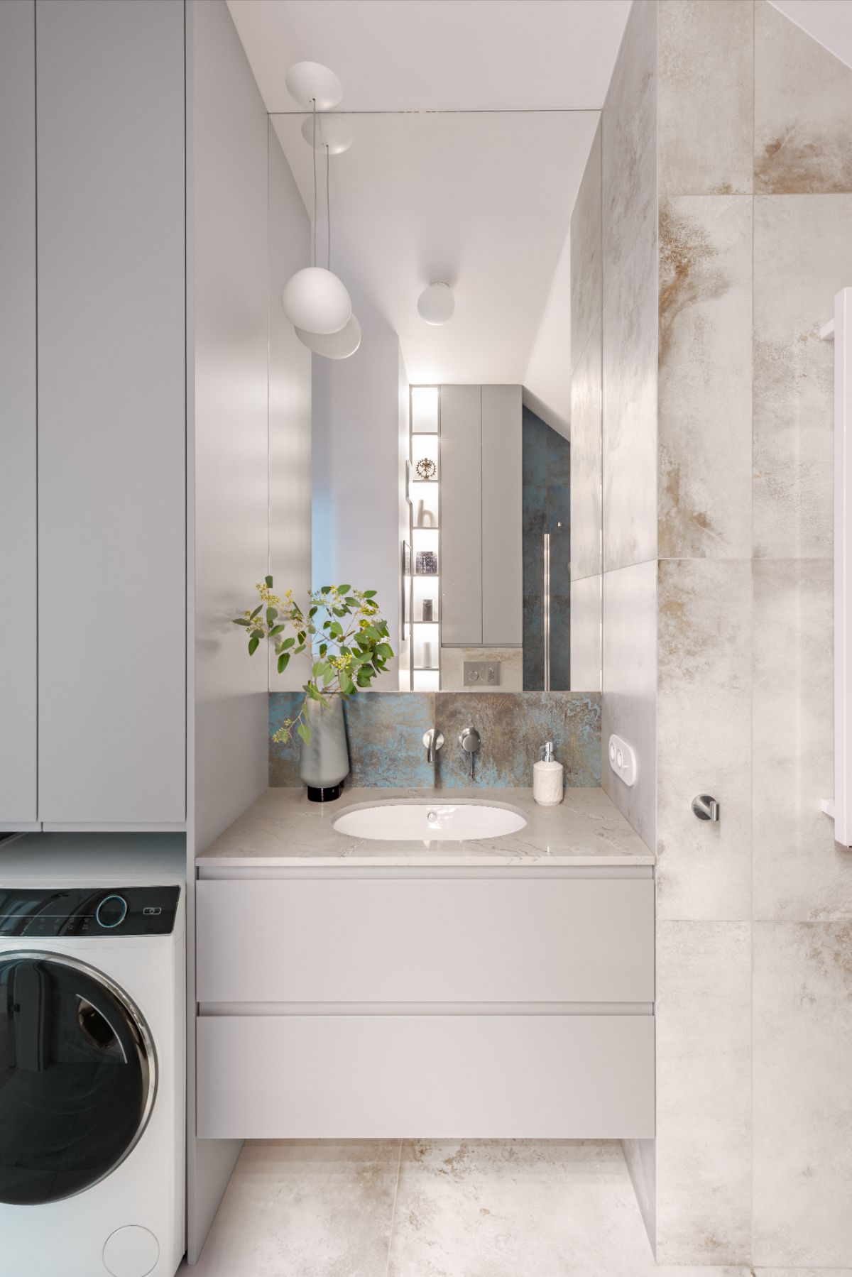 Przy okazji nowego projektu udało się ulepszyć niektóre wcześniejsze pomysły. Na przykład matowy spiek kwarcowy, użyty w poprzednim mieszkaniu, został zastąpiony bardziej wytrzymałym konglomeratem. Każdy element projektu był precyzyjnie dopasowany, mimo licznych wyzwań związanych z konstrukcją apartamentu – od licznych skosów i belek na różnych wysokościach, po niestandardową wysokość sufitu wahającą się od 2,59 m do prawie 5 m.