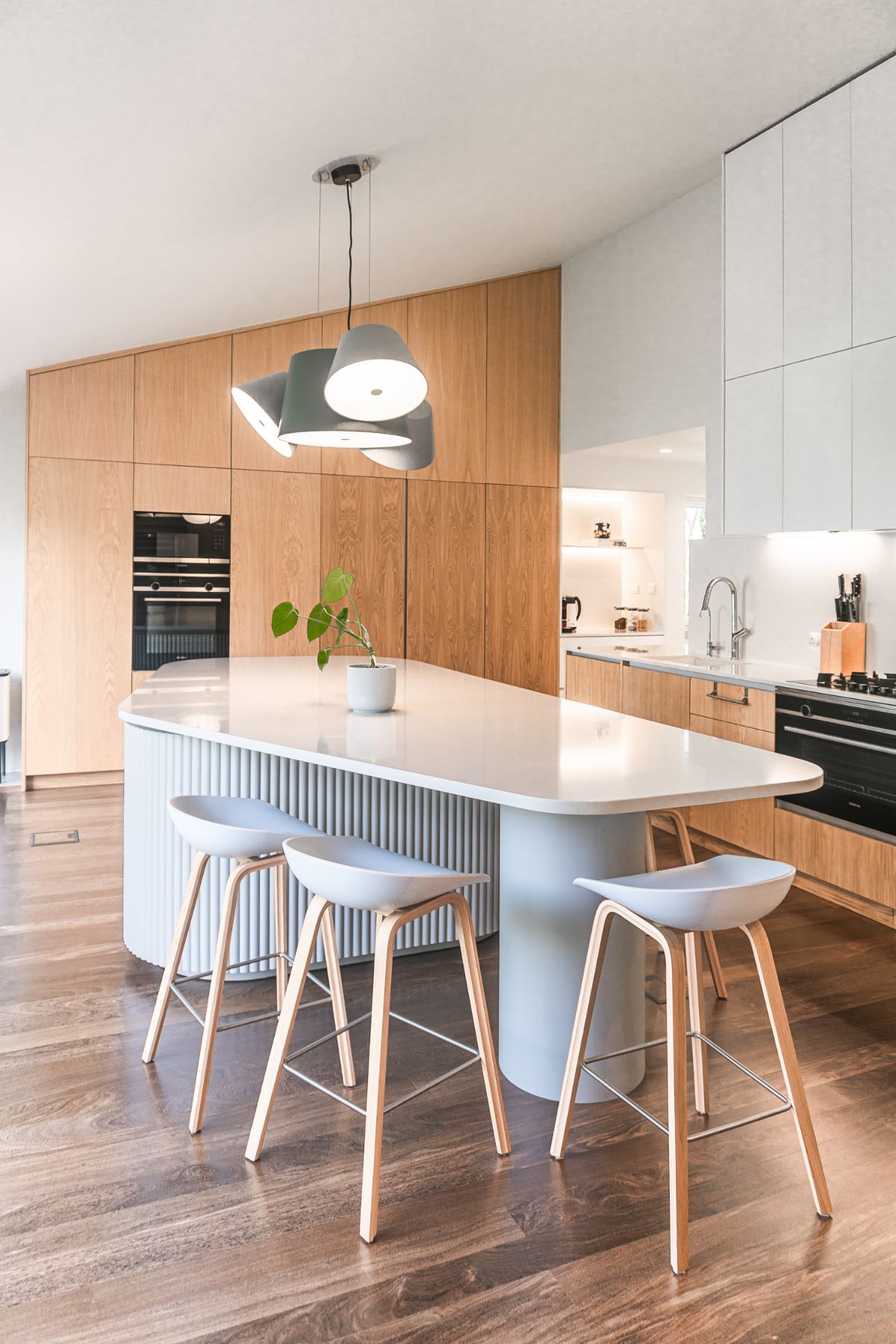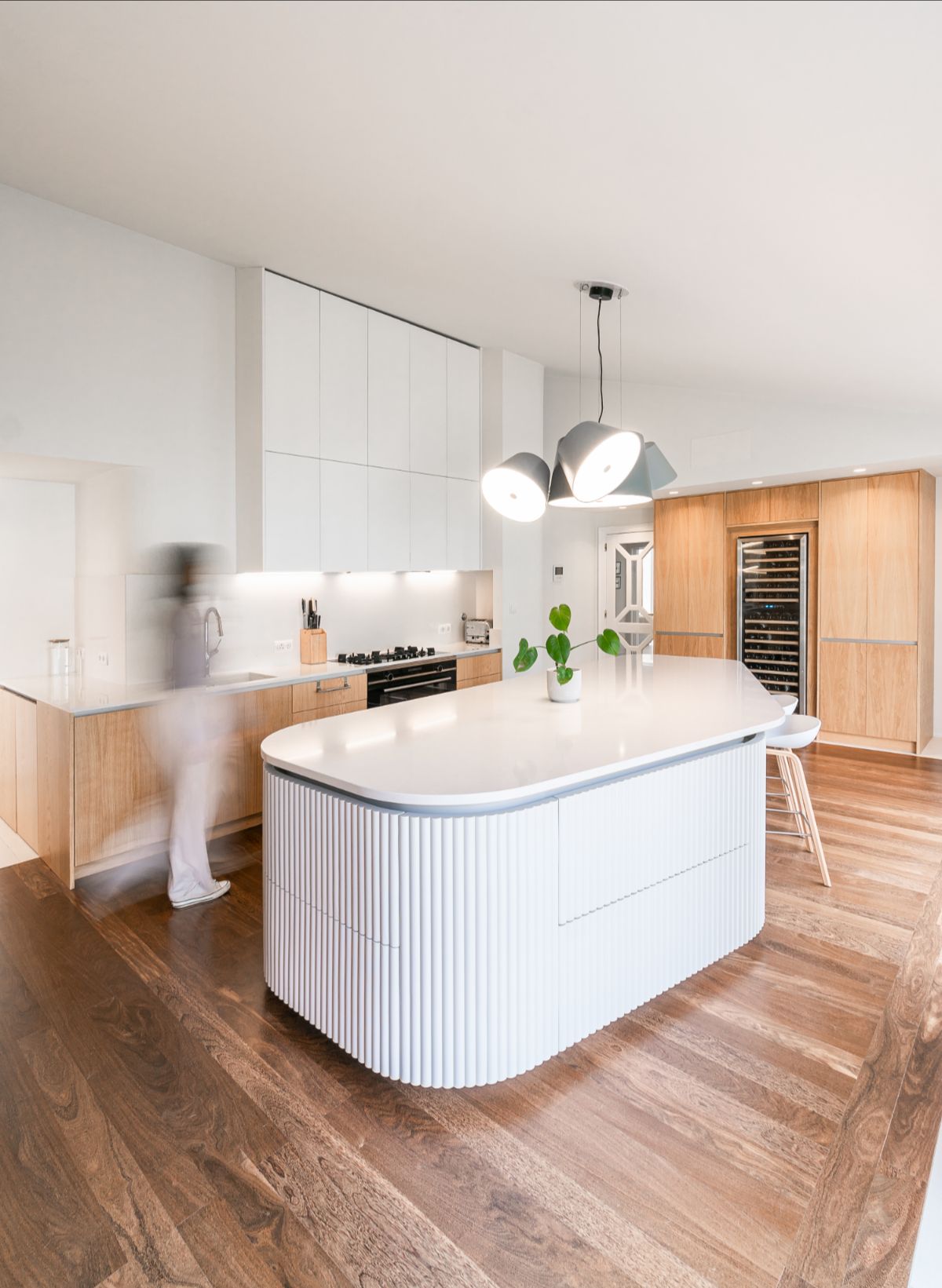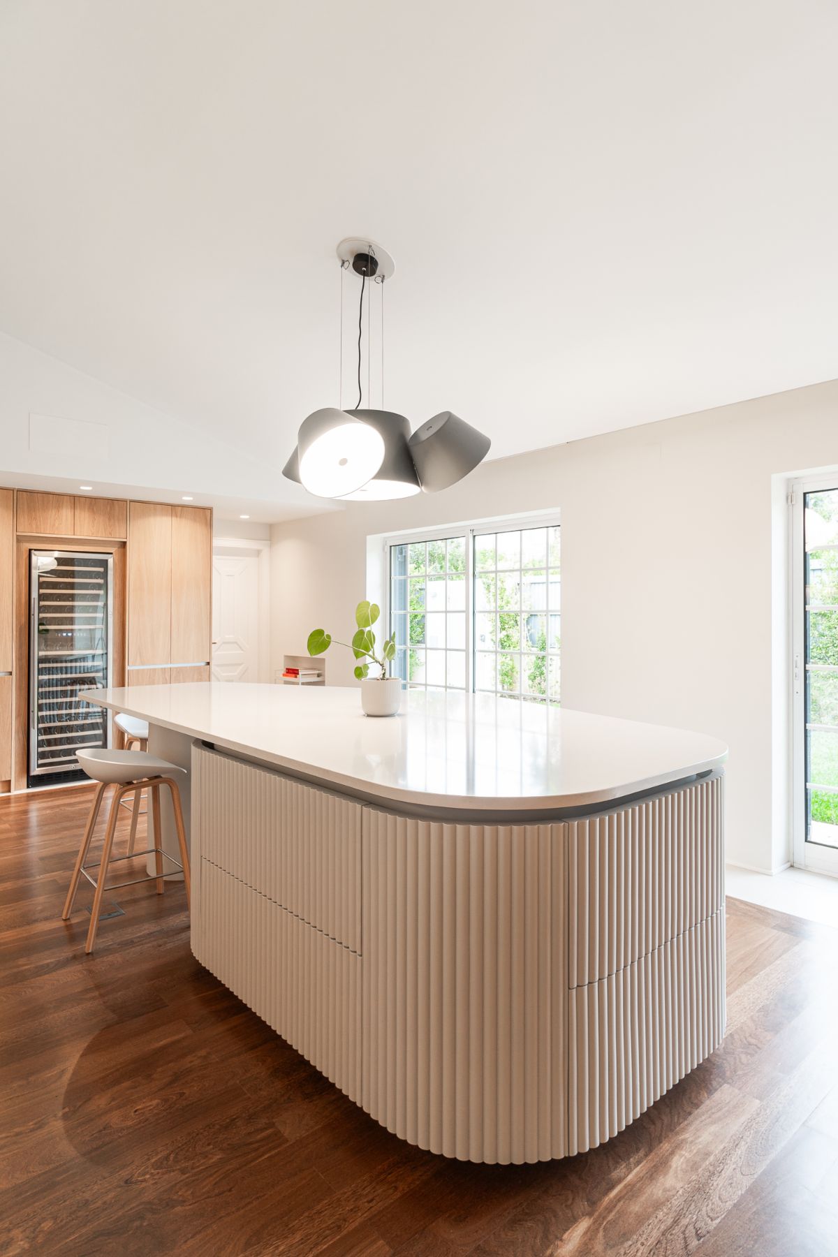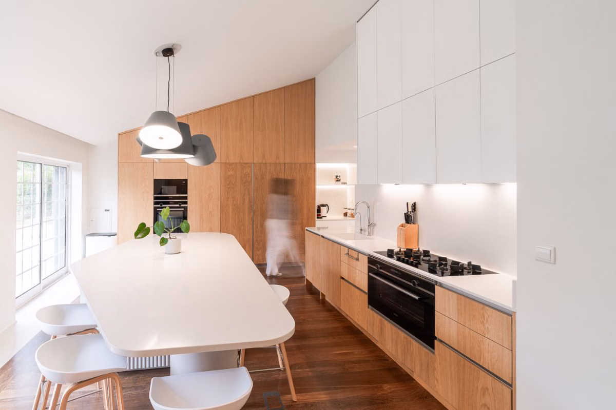 Wyspa kuchenna stanowi szczególny, wielofunkcyjny element we wnętrzu, posadowiony na istniejącej drewnianej podłodze.