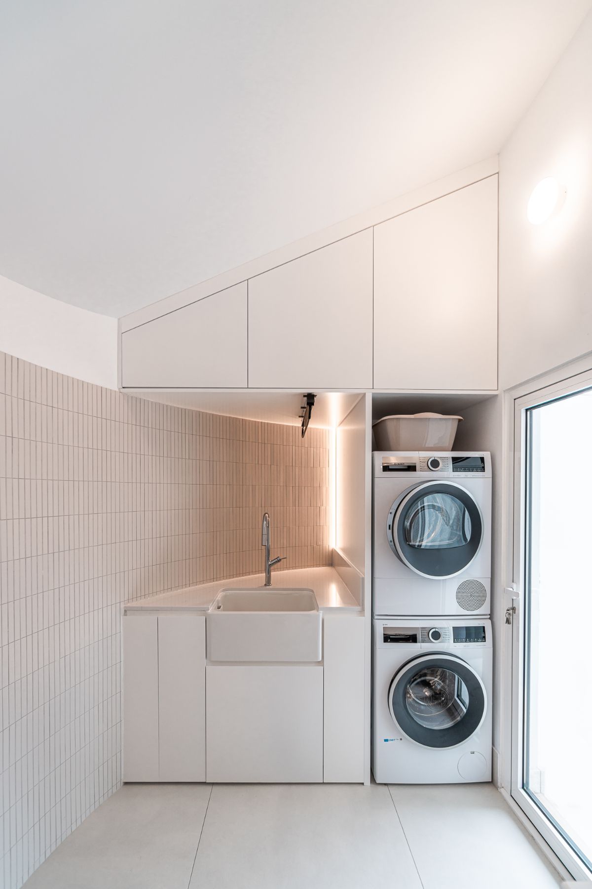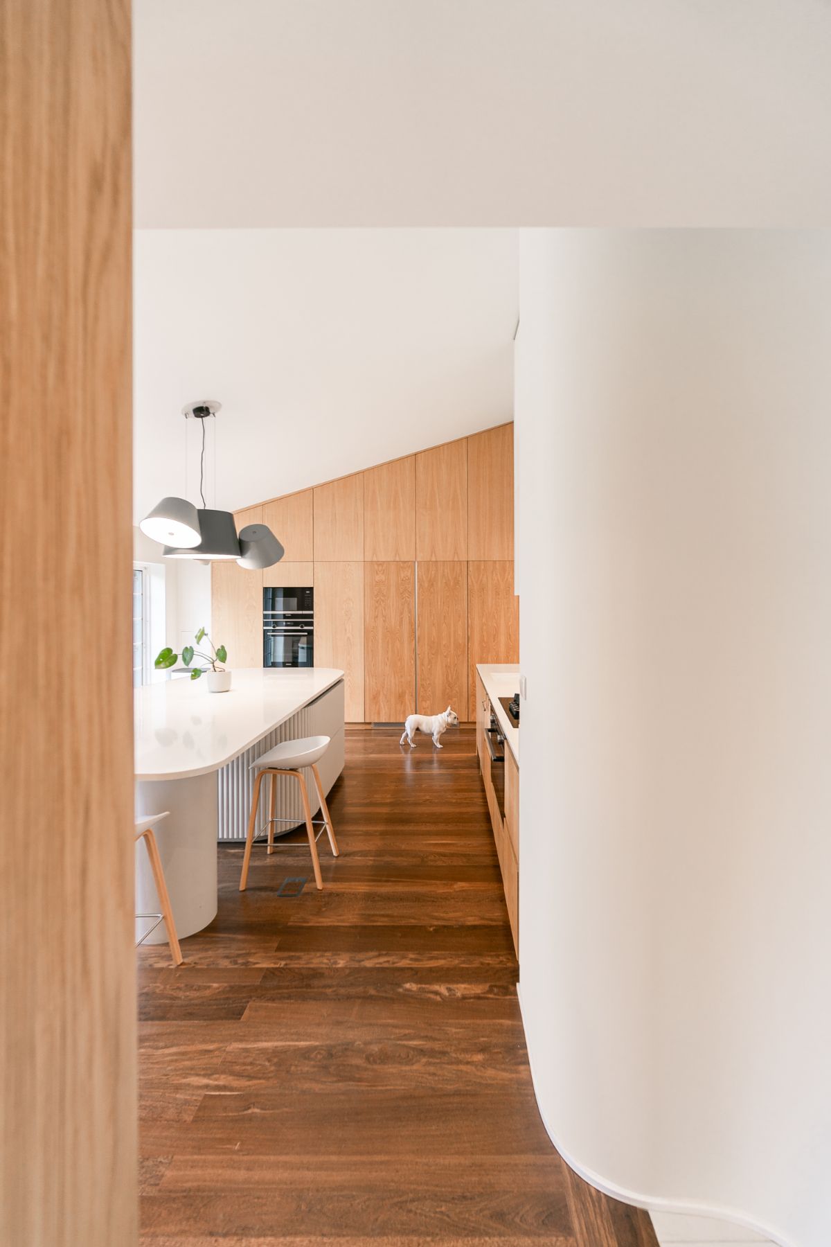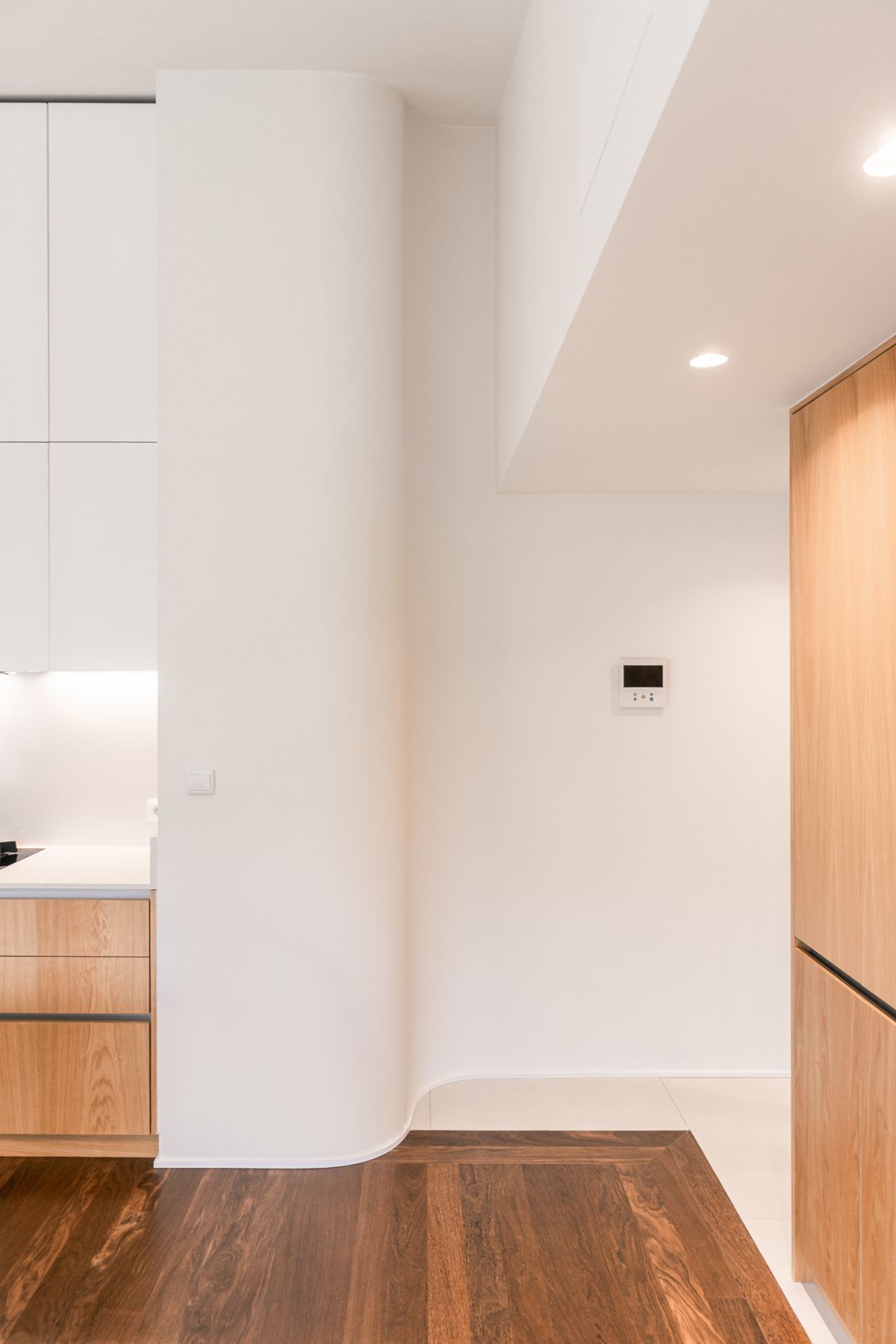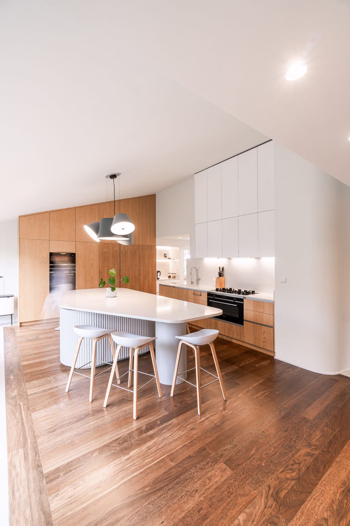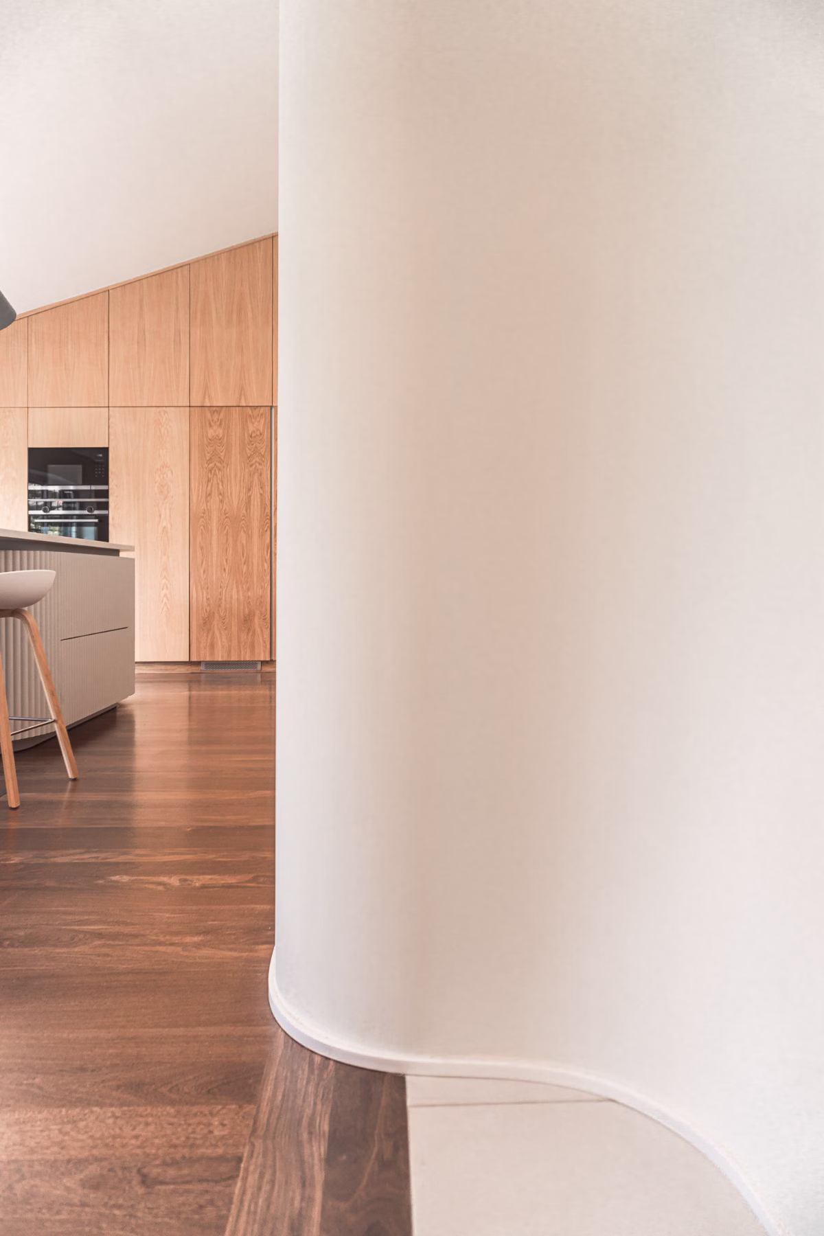 W nowo zaprojektowanych przestrzeniach zdecydowałyśmy się na wprowadzenie elementów zaokrąglonych, odnosząc się tym samym do eleganckiej bryły domu. Połączenie zaokrąglonych i kubicznych form architektonicznych oferuje wyjątkową estetykę. Falista geometria nadaje dynamiki i ruchu kompozycji przestrzeni, czyniąc ją mocniejszą, a jednocześnie bardziej funkcjonalną.