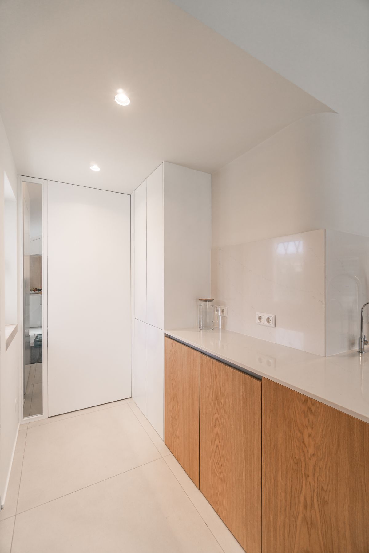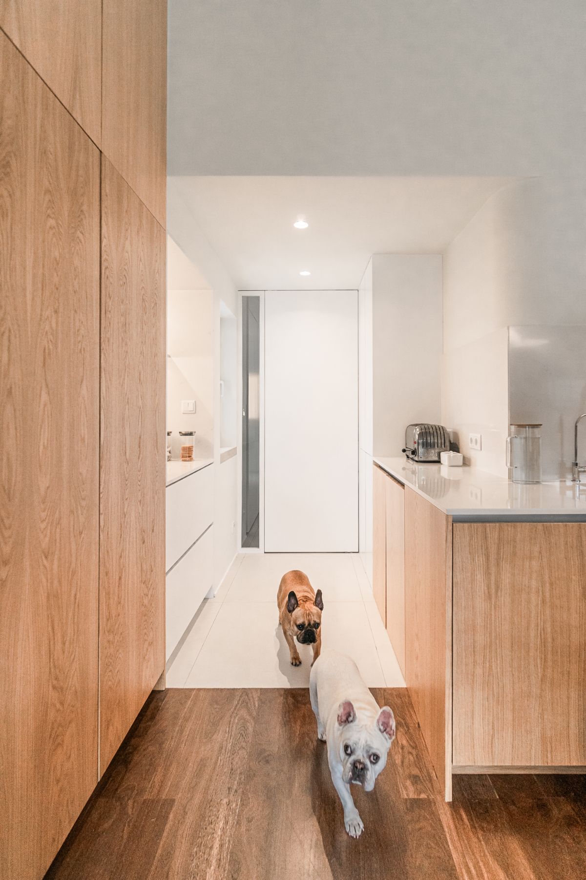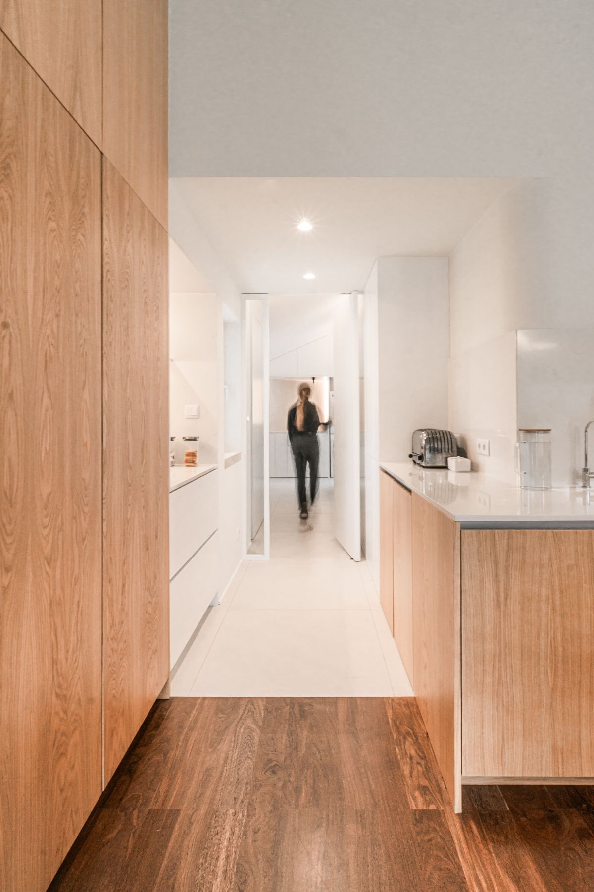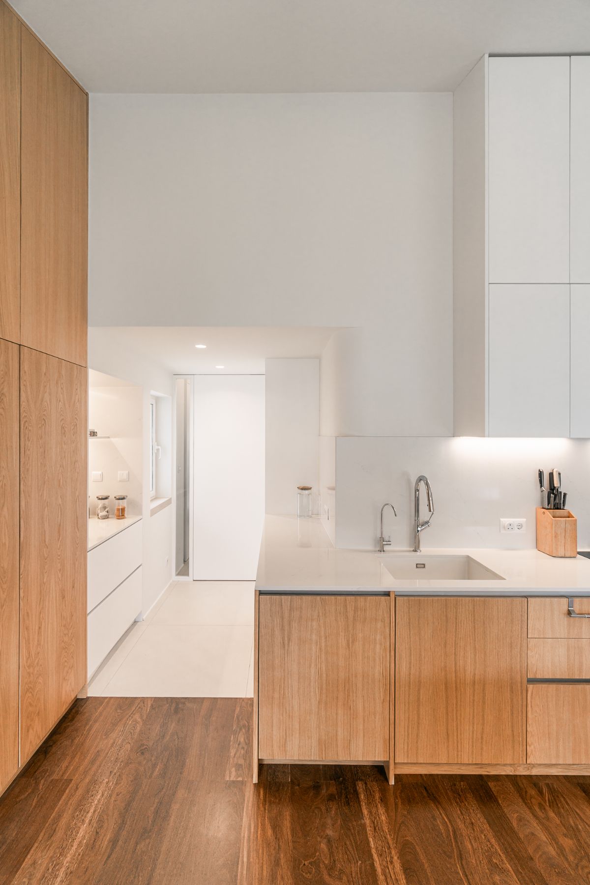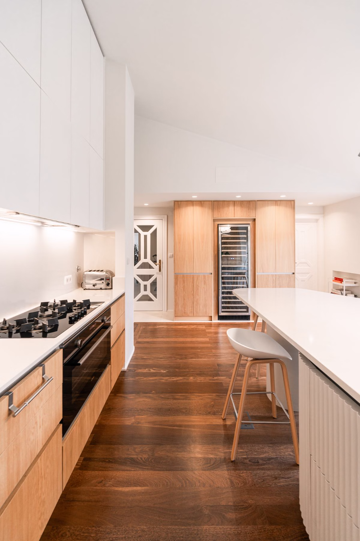 Głównym założeniem tego projektu była reorganizacja przestrzeni i przebudowa kuchni, pralni i sąsiednich sypialni, w celu stworzenia bardziej przestronnych pomieszczeń z dobrym dostępem do naturalnego światła, bez interwencji w istniejącą strukturę budynku. Innymi słowy, przed Wami projekt przebudowy wnętrz w domu zaprojektowanym przez architekta Nuno Leónidasa w 1985 roku.