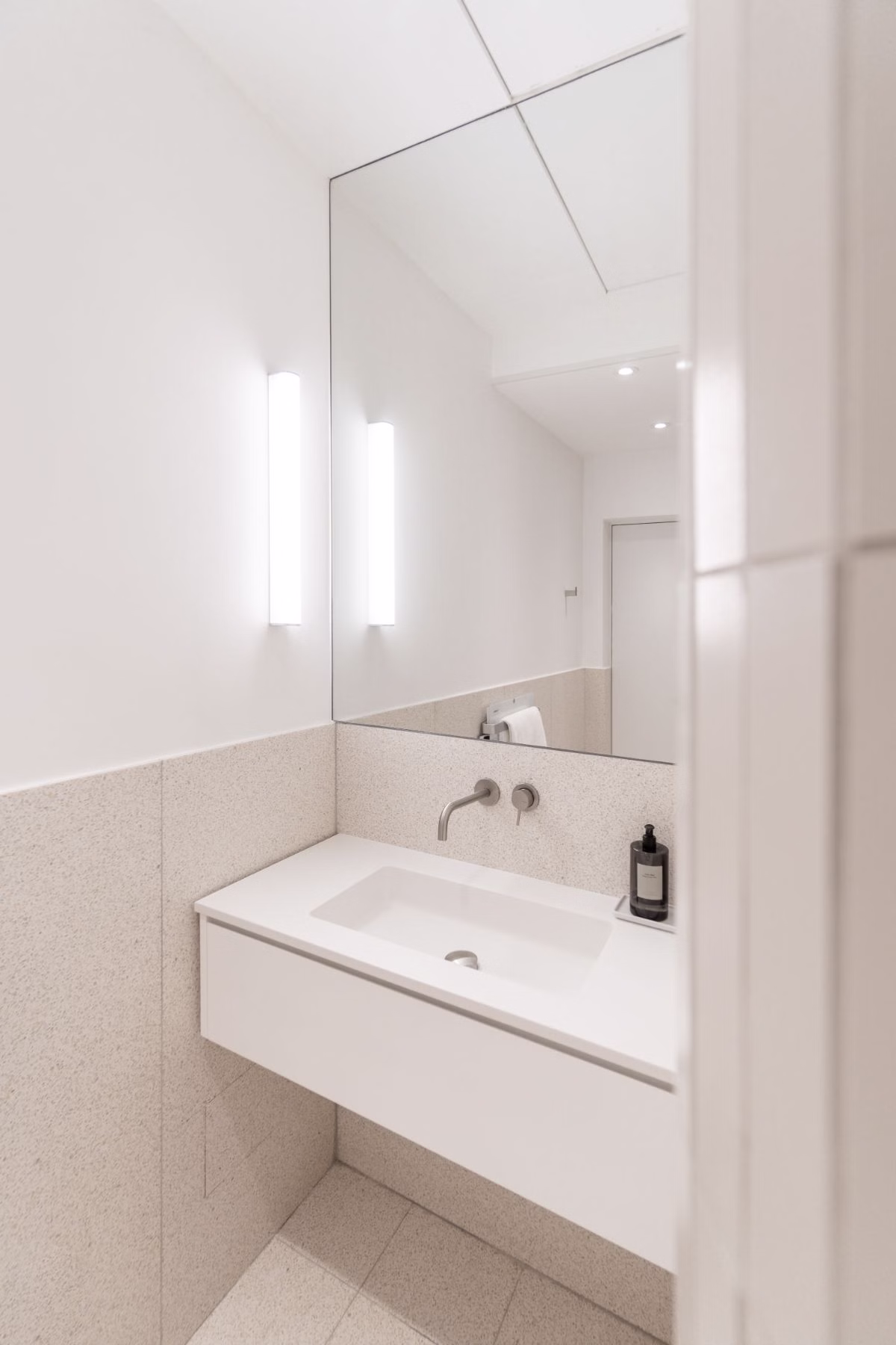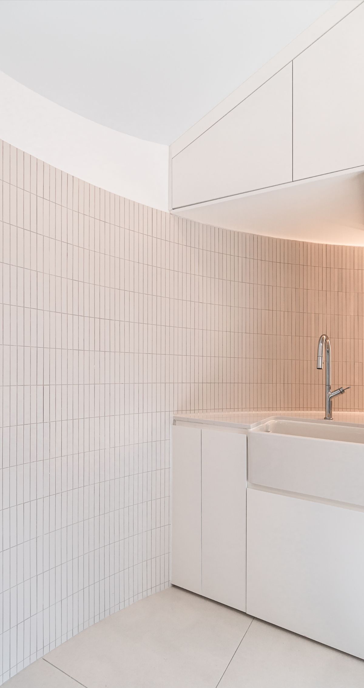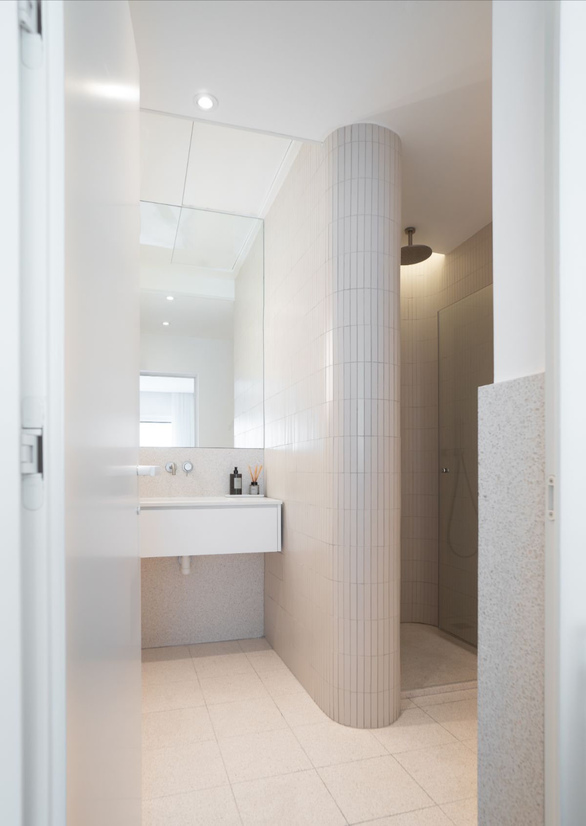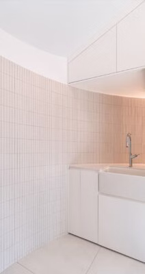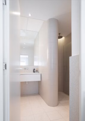 Głównym celem projektu łazienek było stworzenie komfortowej przestrzeni. Efekt ten został osiągnięty dzięki zastosowaniu jasnych i delikatnych kolorów, dopełnionych zaokrąglonymi formami. Zaokrąglenia te zostały dodatkowo wydobyte poprzez zastosowanie światła pośredniego oraz dużych wbudowanych tafli luster, które rozświetliły wnętrze.