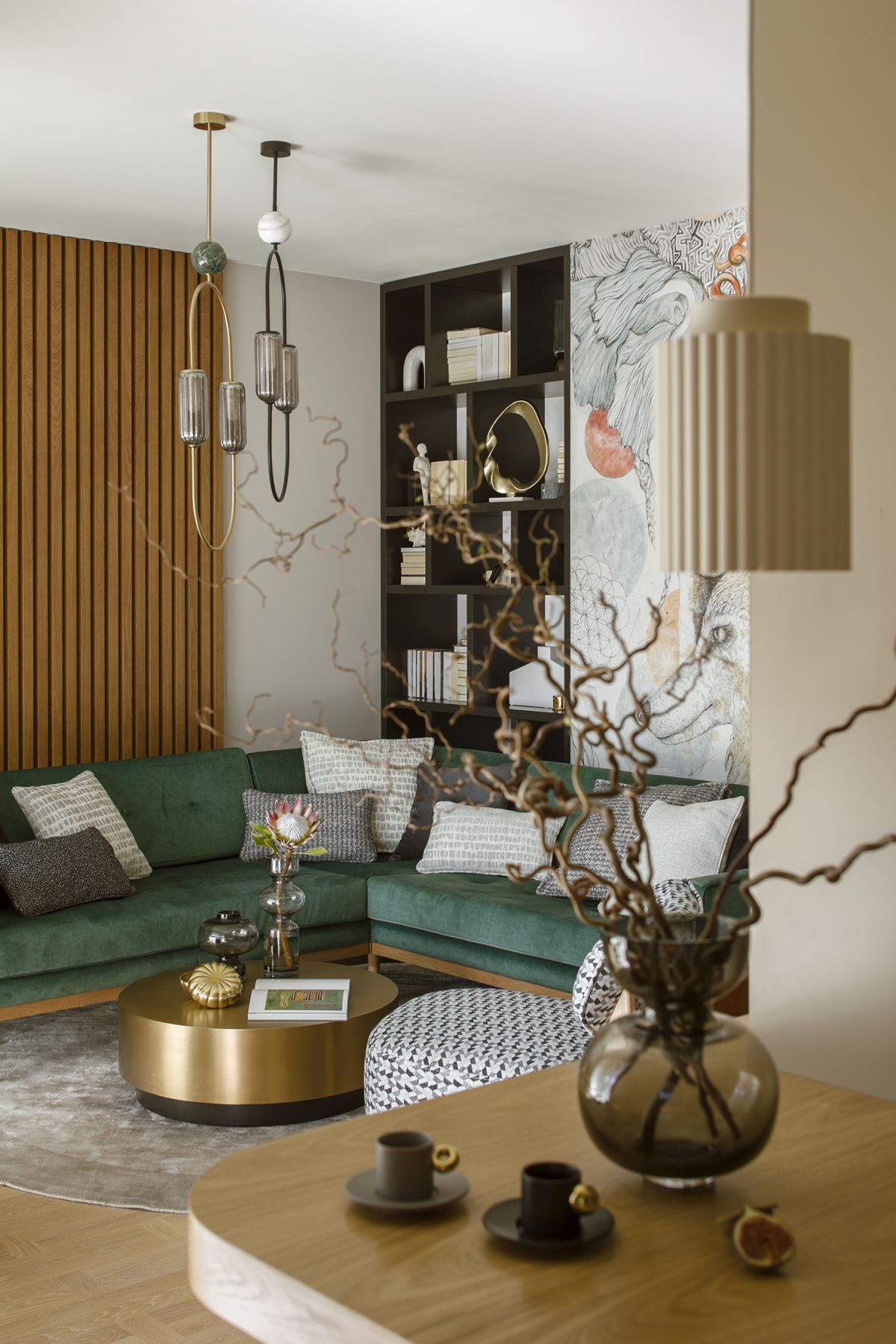 Projekt wnętrza został oparty na wyraźnych preferencjach inwestorki. Jednym z pierwszych życzeń była welurowa sofa w butelkowej zieleni – mebel, który zdeterminował paletę całego mieszkania. Zielenie, złamane beże, ciepłe drewno i złote akcenty wypełniają przestrzeń, budując atmosferę nowoczesnej elegancji z duszą. Sercem salonu jest autorska tapeta, czyli artystyczna grafika Justyny Stoszek, nawiązująca do symboliki siły, wolności i harmonii. To nie tylko element dekoracyjny, ale też wyraz osobowości właścicielki, świadomej siebie, ale głęboko zakorzenionej w naturze.