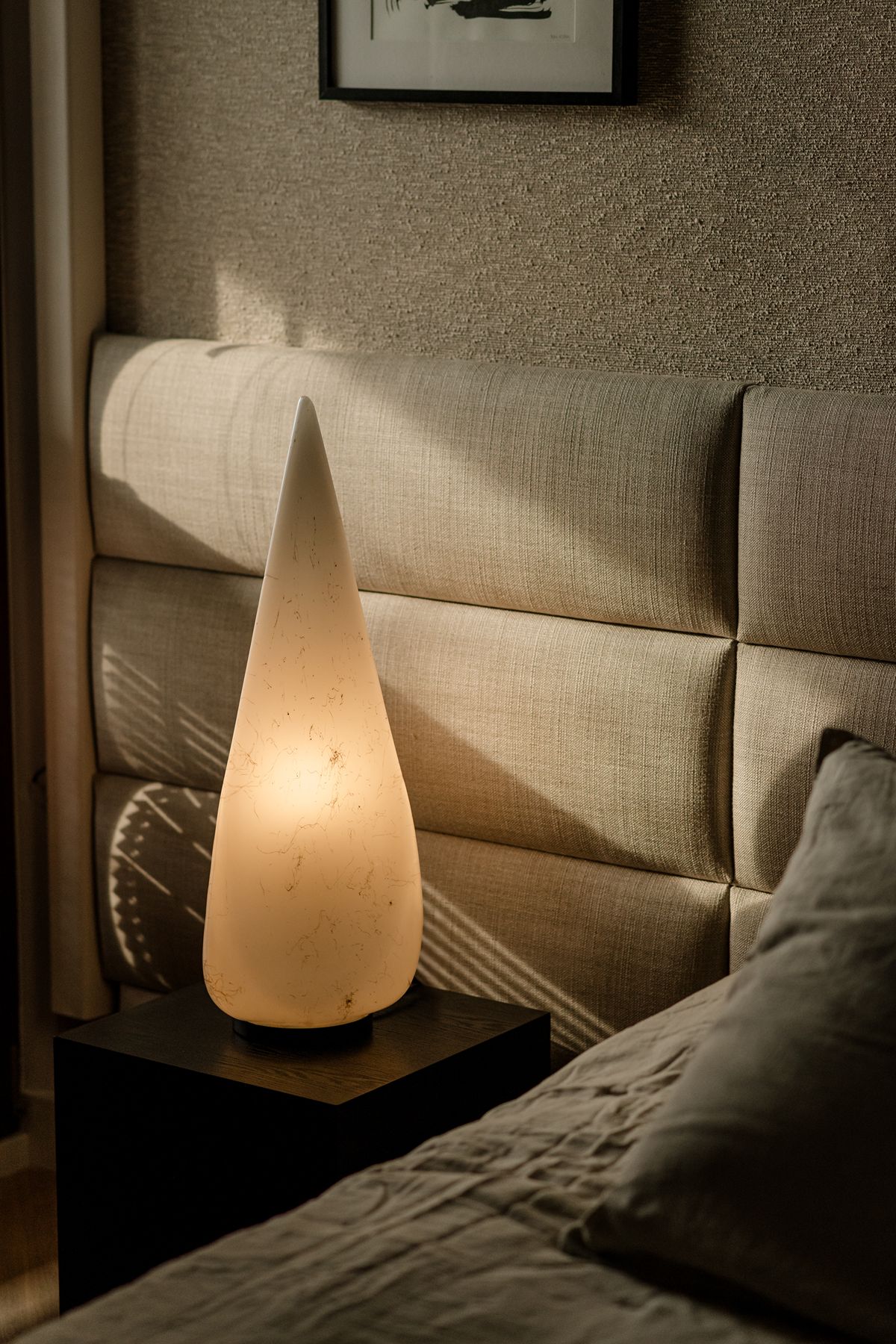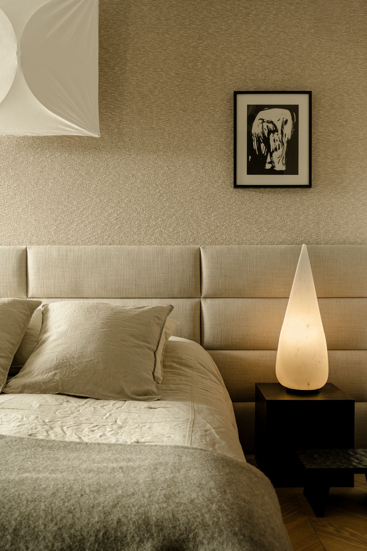 Łazienka została wykończona białym marmurem i kontrastującymi, czarnymi zabudowami stolarskimi, tworząc elegancką, spokojną przestrzeń. Sypialnia to ukłon w stronę japońskiej estetyki: tapeta z naturalnego lnu, wysokie wezgłowie, tekstylia w stonowanej kolorystyce i minimalistyczna zabudowa garderoby z palonego drewna. Nad łóżkiem zawisła tkaninowa ikona – lampa „Ariette” od FLOS. W roli lampki nocnej występuje włoska „Glass Pyramid Lamp” ze szkła Murano, zaprojektowana przez Lino Tagliapietrę.