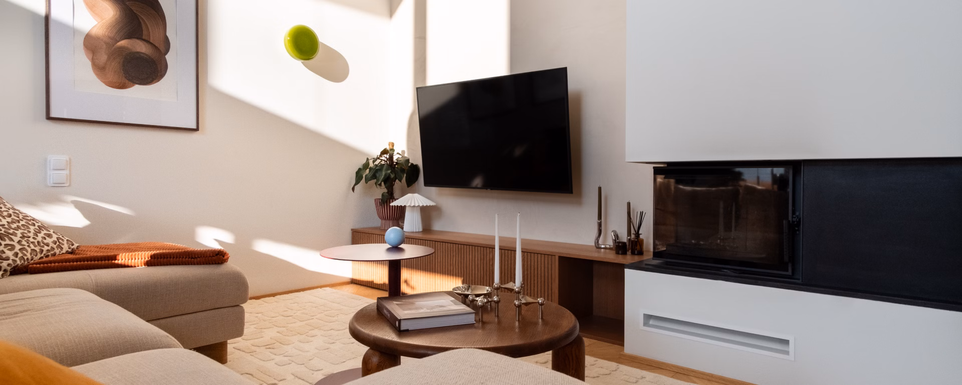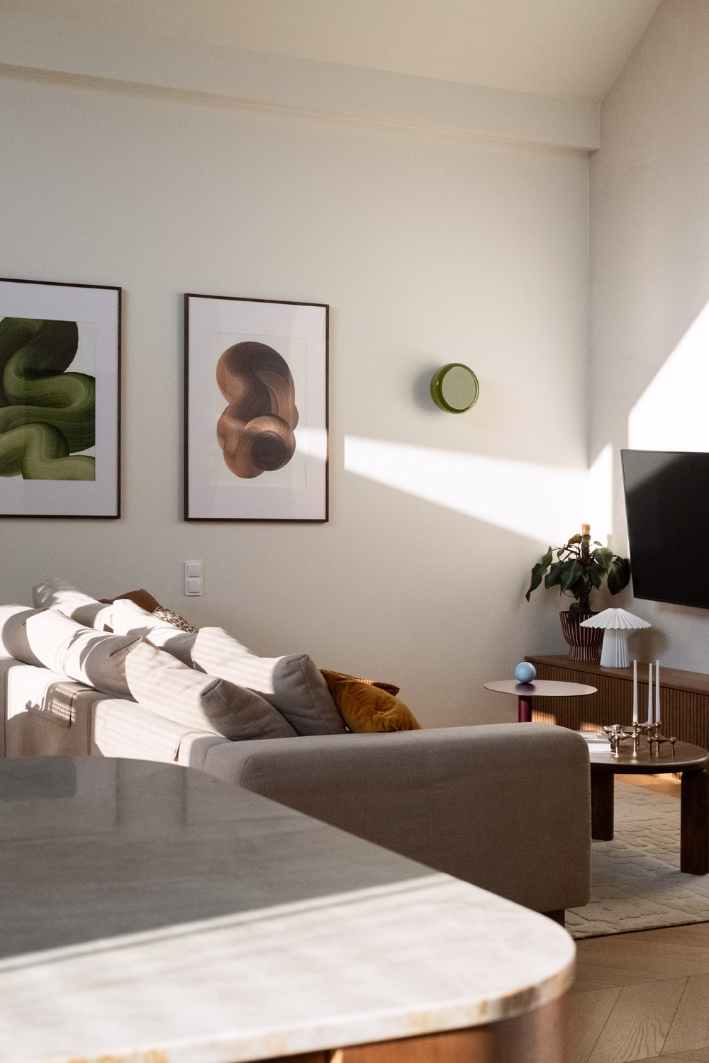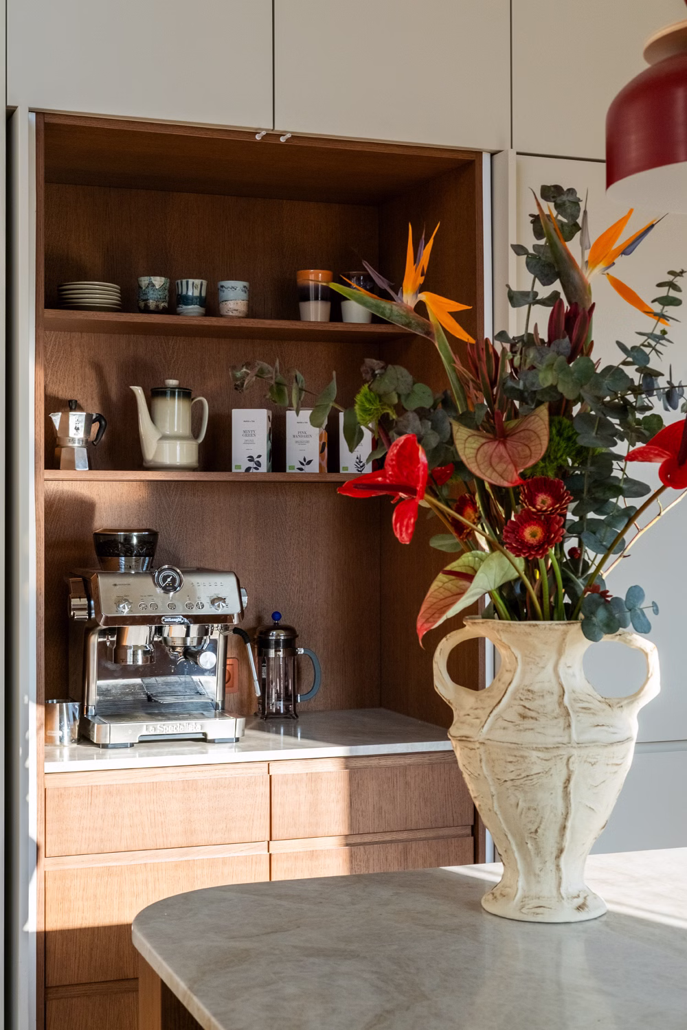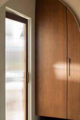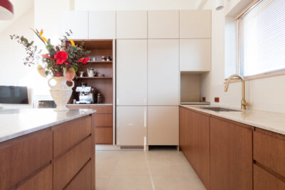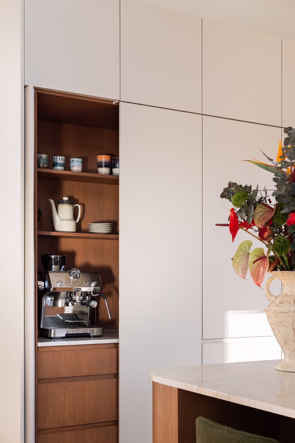 Głównym punktem strefy dziennej jest kuchnia, będąca studium balansu między geometrią a funkcją. Choć beżowe zabudowy stały się w ostatnim czasie rozwiązaniem niezwykle popularnym i wręcz opatrzonym, tutaj zyskały zupełnie nową dynamikę. Zgaszony odcień frontów stał się tłem dla wyrazistego dębu, który poprzez mocny kontrast nadaje beżowej płaszczyźnie charakteru i wizualnej głębi. Całość dopełnia blat wykonany z naturalnego kwarcytu, łączący trwałość z unikalnym rysunkiem kamienia. Uwagę przyciąga obła wyspa kuchenna, która nie tylko usprawnia komunikację, ale skrywa też personalny akcent w postaci półek na miski dla kotów właścicieli. W kuchenny ciąg wkomponowano również strefę kawową – dębową wnękę, która dzięki systemowi chowanych frontów może pełnić funkcję dekoracyjną lub zostać całkowicie ukryta, przywracając frontom ich minimalistyczną spójność.