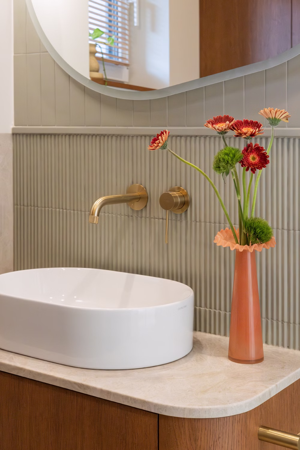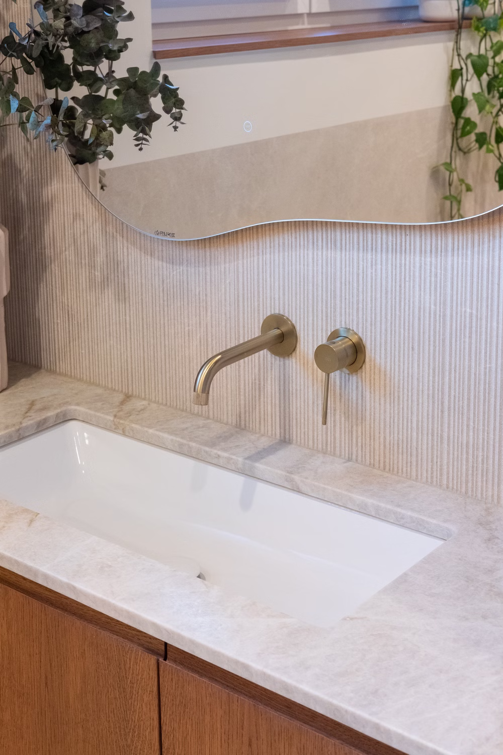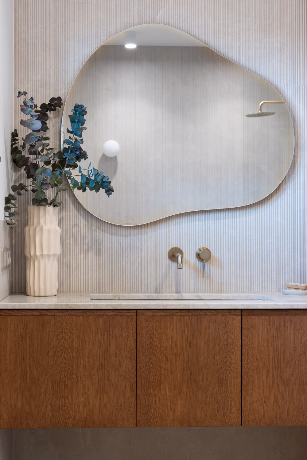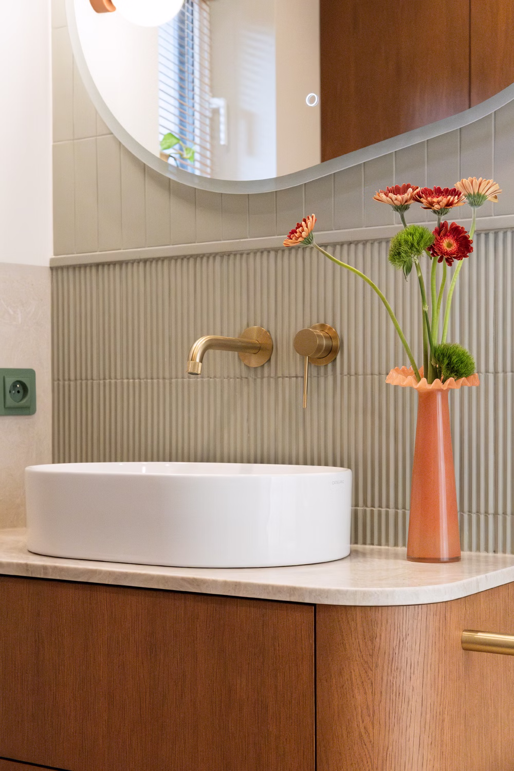 Głównym punktem strefy dziennej jest kuchnia, będąca studium balansu między geometrią a funkcją. Choć beżowe zabudowy stały się w ostatnim czasie rozwiązaniem niezwykle popularnym i wręcz opatrzonym, tutaj zyskały zupełnie nową dynamikę. Zgaszony odcień frontów stał się tłem dla wyrazistego dębu, który poprzez mocny kontrast nadaje beżowej płaszczyźnie charakteru i wizualnej głębi. Całość dopełnia blat wykonany z naturalnego kwarcytu, łączący trwałość z unikalnym rysunkiem kamienia. Uwagę przyciąga obła wyspa kuchenna, która nie tylko usprawnia komunikację, ale skrywa też personalny akcent w postaci półek na miski dla kotów właścicieli. W kuchenny ciąg wkomponowano również strefę kawową – dębową wnękę, która dzięki systemowi chowanych frontów może pełnić funkcję dekoracyjną lub zostać całkowicie ukryta, przywracając frontom ich minimalistyczną spójność.