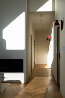 Strefa wypoczynkowa w pełni wykorzystuje imponującą architekturę domu. Dzięki wysokości sięgającej sześciu metrów, nad jadalnią mogła zawisnąć widowiskowa instalacja z trzech materiałowych lamp norweskiej marki Northern. W salonie dominuje monumentalna, biała bryła kominka, stanowiąca tło dla narożnika IWC Home oraz dębowego stolika kawowego od polskiej marki Tamo. Monochromatyczny spokój przełamują biżuteryjne detale, takie jak burgundowy stolik Hay z błękitną dekoracją oraz jaskrawozielony szklany kinkiet, który dynamicznie zmienia swój charakter pod wpływem światła. Dopełnieniem ogólnodostępnej części domu jest łazienka dla gości. Postawiono w niej na dekoracyjną ścianę z rzeźbiarskich płytek w odcieniu szałwii, którą ożywia kinkiet z koralową wstawką.