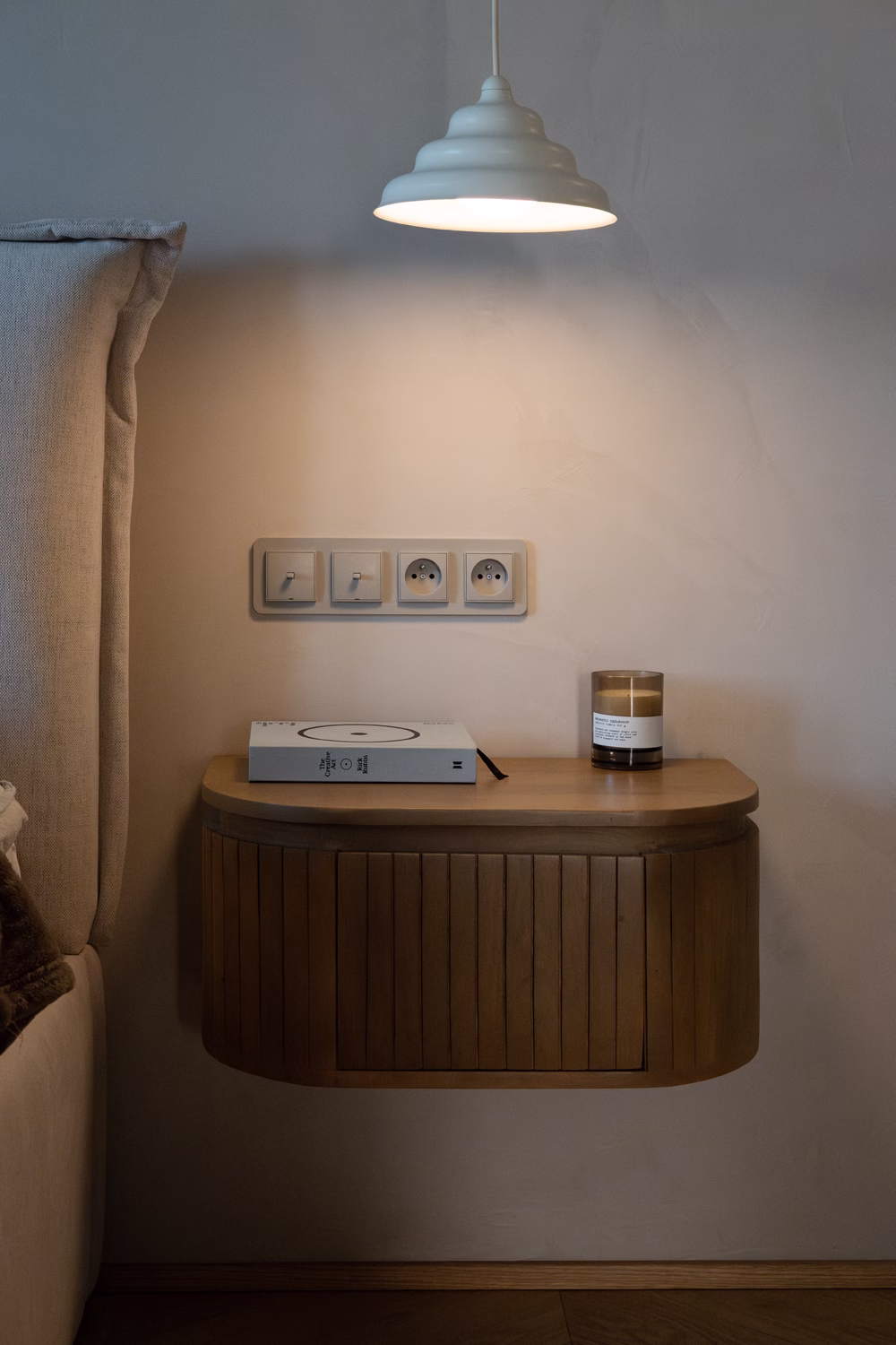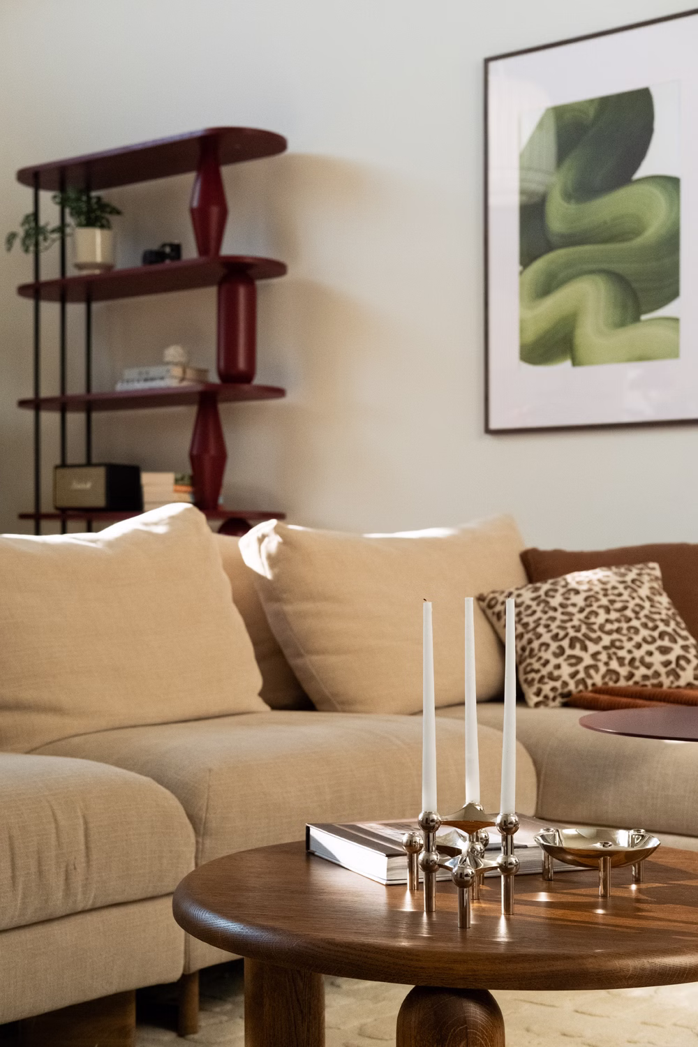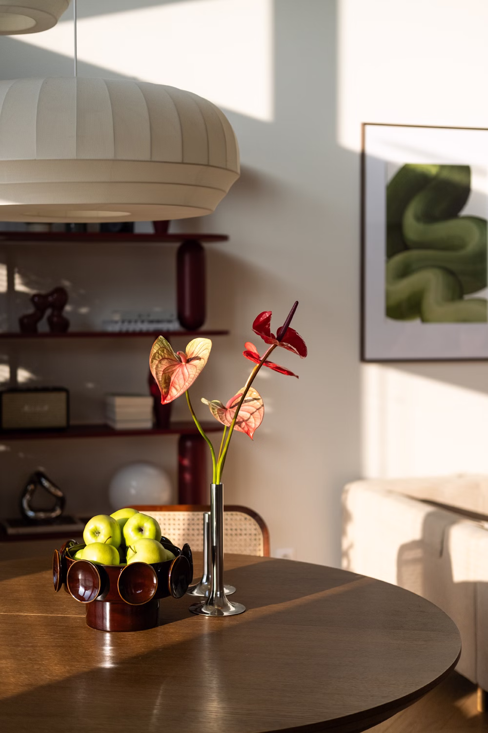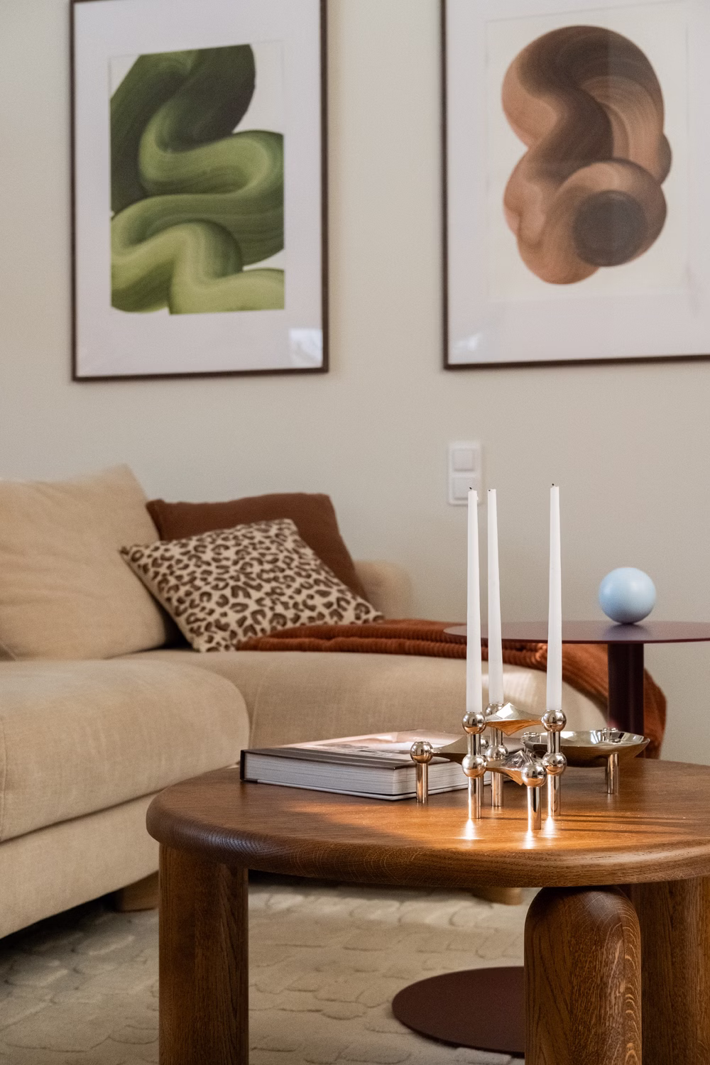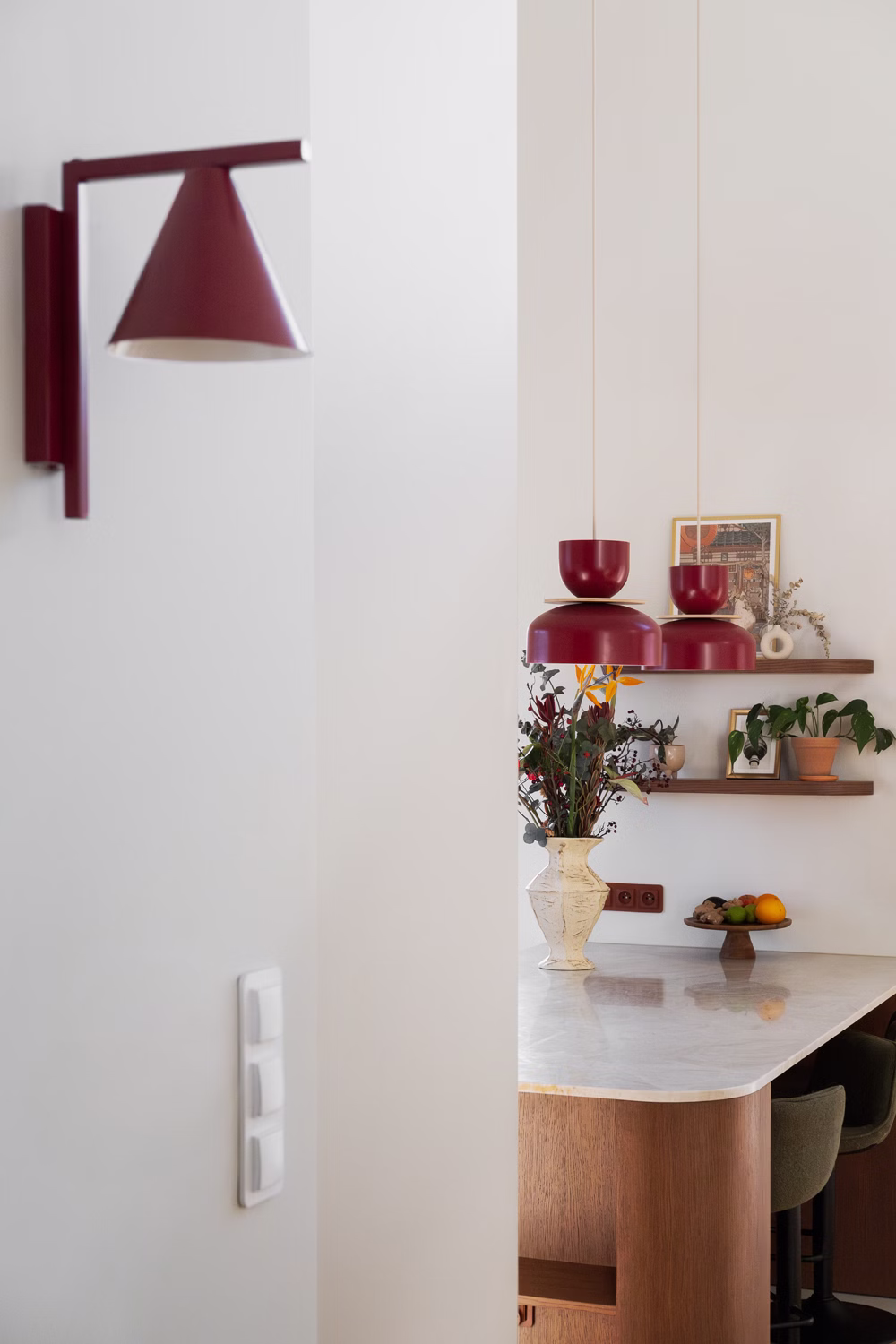 Fundamentem aranżacji stało się zestawienie jasnych, zgaszonych beżów ścian z ciepłym w odcieniu drewnem dębowym. Ta wyważona baza pozwoliła uniknąć chłodu, wprowadzając do środka naturalny rytm, który koresponduje z widokiem za oknem. Kolorystyka wnętrza – burgundy, brązy i zielenie – to bezpośrednia inspiracja barwami leśnego otoczenia, widoczna w oprawach oświetleniowych Artera, tekstyliach oraz grafikach autorstwa Nikodema Szpunara. Dbałość o detal przejawia się tu nawet w elementach osprzętu, gdzie wykorzystano dekoracyjne kontakty Karlik, idealnie wpisane w estetykę płaszczyzn.