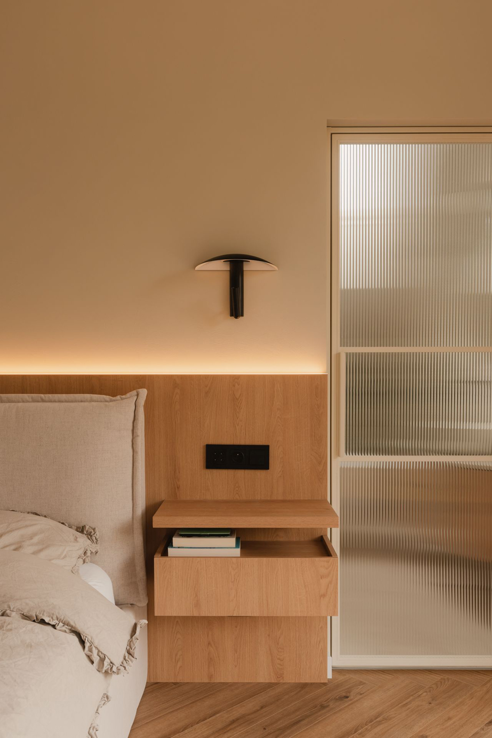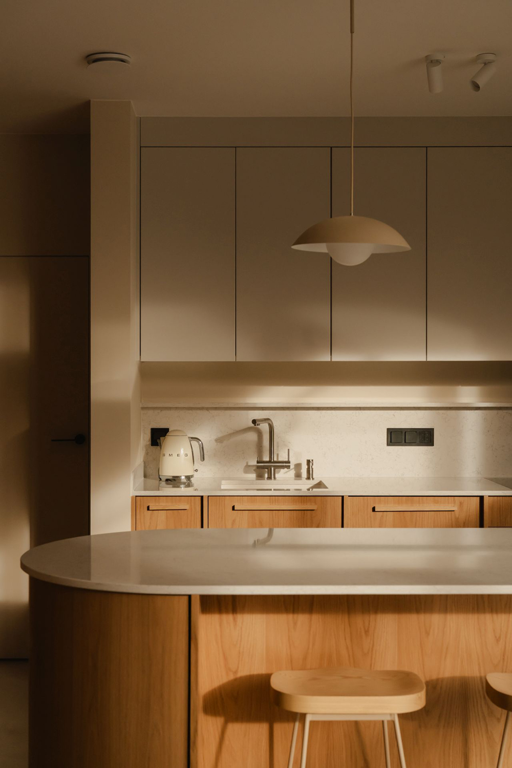 Założeniem Agaty Pierożyńskiej ze studia Habitat było stworzenie przestrzeni nowoczesnej, pozbawionej chłodu i dosłowności. Kluczowe znaczenie zyskały więc odpowiednie proporcje oraz materiały. Ściany utrzymano w odcieniu ciepłego beżu, natomiast biel pojawia się jedynie w subtelnych akcentach, pozwalając zachować miękkość i spójność aranżacji. Dużą ilość drewna w zabudowach meblowych zrównoważono wizualnie dzięki jednolitej posadzce z mikrocementu w kolorze kaszmiru. Tak skomponowana paleta, uzupełniona nastrojowym, rozproszonym światłem, buduje we wnętrzu atmosferę harmonii i naturalności.