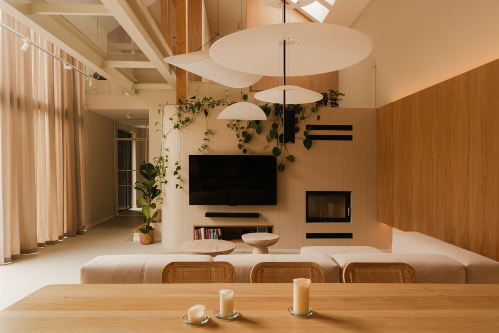 Bazą tej aranżacji są naturalne materiały: jasne drewno o wyraźnym rysunku słojów, miękkie tkaniny w odcieniach beżu i écru oraz mineralne powierzchnie blatów i posadzek. Stonowana paleta od samego początku buduje wrażenie wizualnego ładu, pozwalając pierwszoplanową rolę grać światłu dziennemu. Duże przeszklenia i dwukondygnacyjna przestrzeń jeszcze bardziej wzmacniają poczucie swobody, sprawiając, że domownicy naprawdę tu odpoczywają.