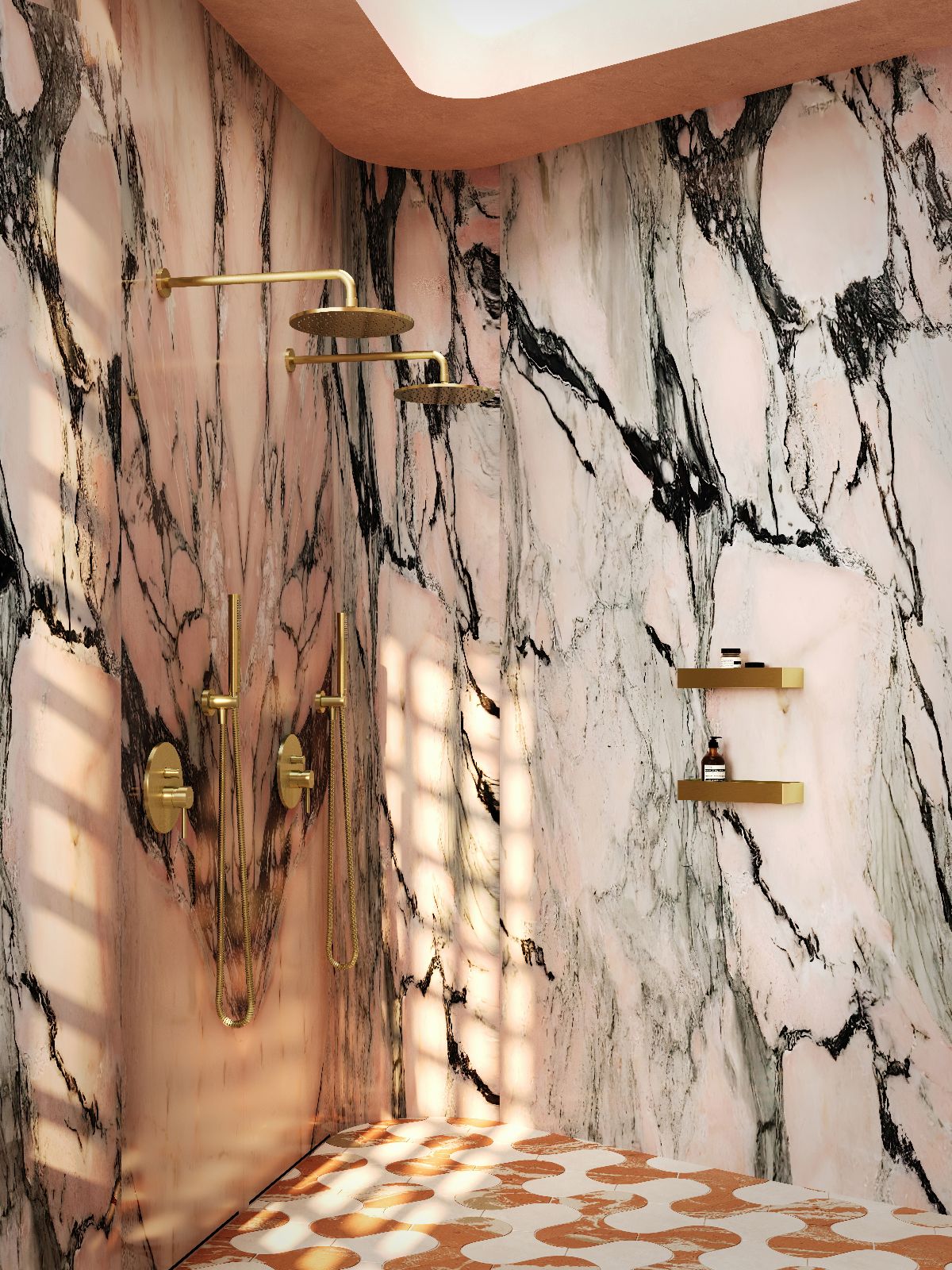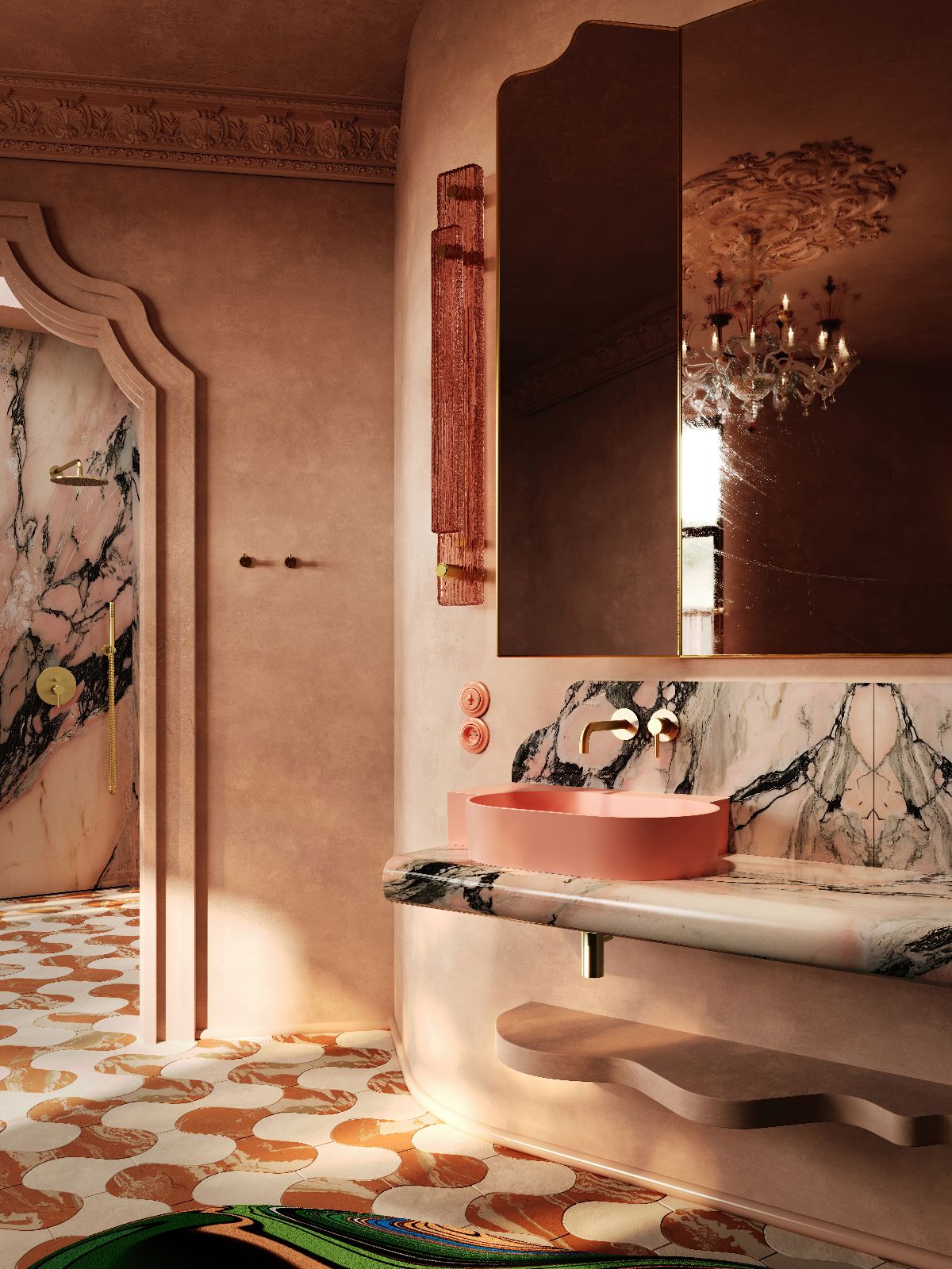 Motywem spajającym aranżację w duchu Hedonistic Mannerism jest odcień stonowanego różu i czerwieni: ciepły, nasycony oraz zakorzeniony w hiszpańskim pejzażu. Ukazuje się w muśniętych słońcem elewacjach, w fakturze starych murów i w szlachetnych marmurach – Rojo Alicante, którego głęboka czerwień z białym użyleniem snuje opowieść o południu Hiszpanii, oraz Calacatta Rose, w którym potężne, malarskie wzory rozlewają się po powierzchni kamienia niczym pociągnięcia pędzla na płótnie. Ta paleta, spotykając się z kolorystyką wanny i umywalek OVO M+, stała się impulsem całej aranżacji, nadając wnętrzu zakorzenienie w miejscu bliskim sercu projektantki Kristiny Busko, prowincji Alicante we wschodniej Hiszpanii.