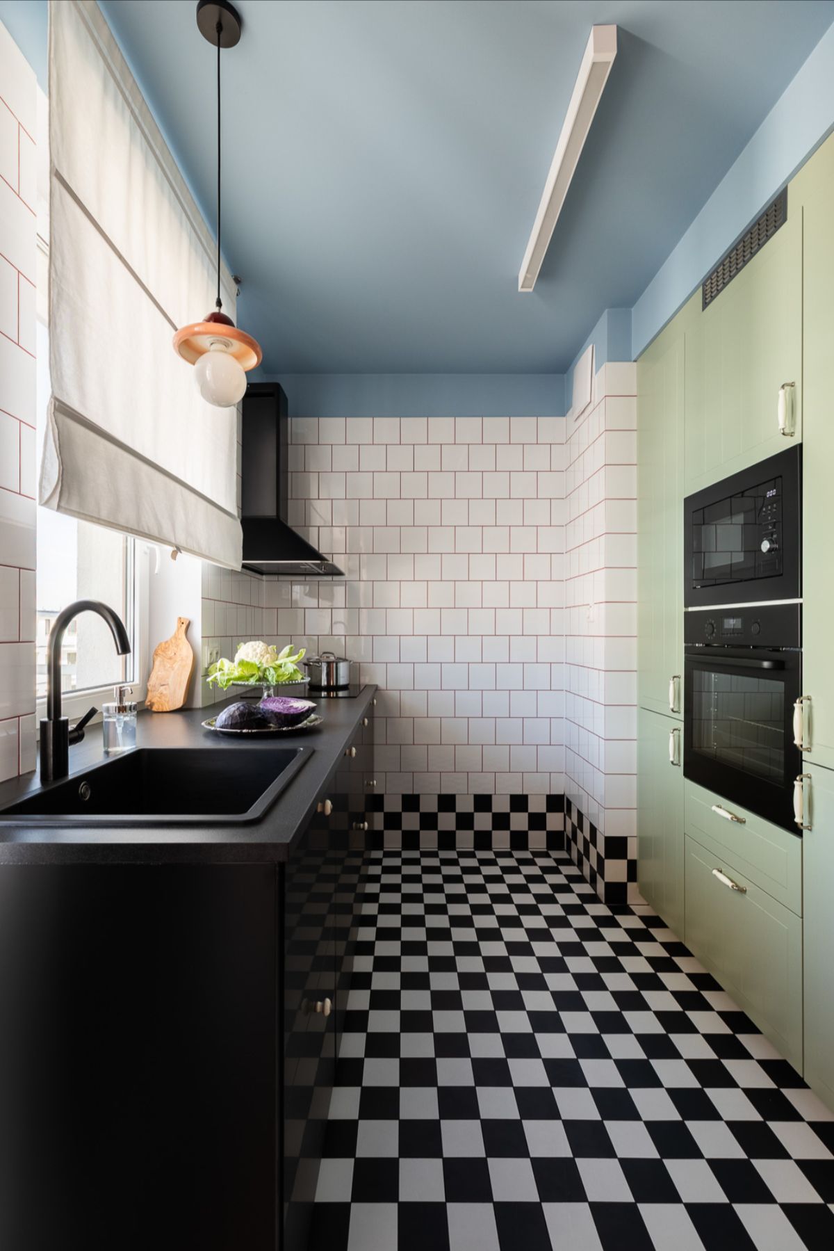 Strefa z kanapą jest lekka i nonszalancka jakby puszczała „oko” do mieszkańców dzięki zastosowaniu celowo przeskalowanej papierowej lampy HAY, zaczerpniętej ze skandynawskich wnętrz oraz kanapie Optisofa w pokryciu w beżową pepitkę i jutowemu dywanowi z IKEA. Kuchnia miała być lekkim tłem dla salonu, dlatego strefa robocza została zaprojektowana jako czarny monoblok mający być przedłużeniem szachownicy na posadzce z dodatkiem ceramicznych uchwytów odejmujących jej „powagi”. Wysoka zabudowa natomiast jest lekkim nawiązaniem kolorystycznym do zasłon i dzięki frezowanym w stylu retro frontom dodaje bardziej domowy vibe przełamując prostotę czarnej zabudowy. Płytki na podłodze i ścianach miały przywoływać skojarzenia z kuchniami w międzywojennych willach, które stanowią ogromną część zabudowy Sulejówka – jest to ukłon w stronę historii lokalizacji mieszkania.