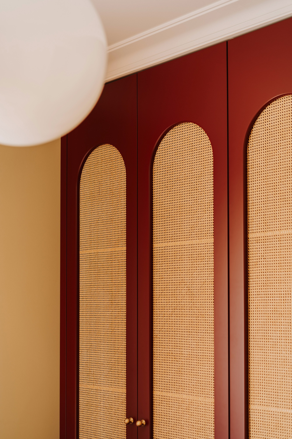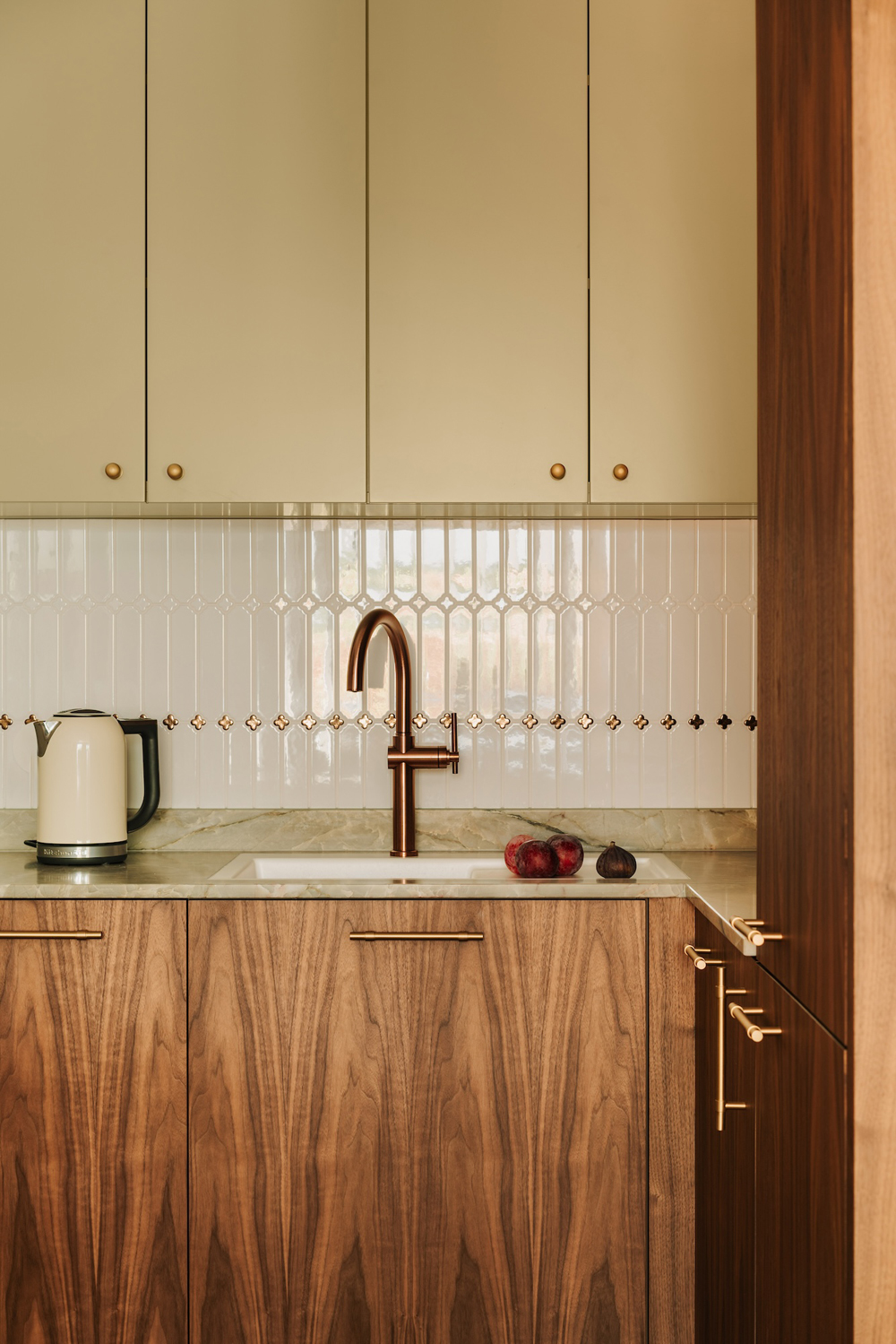 Układ mieszkania zachował dwie oddzielne sypialnie, przestronny salon z aneksem kuchennym oraz wygodne strefy przechowywania. Kuchnia została zaprojektowana „na miarę”. To funkcjonalna i wykończona szlachetnymi materiałami przestrzeń, w której chce się odpoczywać. Zabudowy meblowe oraz kuchnia zostały wykonane przez firmę Biurokoncept, co pozwoliło na idealne dopasowanie formy do potrzeb domowników i stylistyki wnętrza. Całość uzupełnia dekoracyjna mozaika marki Raw Decor, która stanowi wyrazisty, biżuteryjny akcent nad blatem roboczym. Półwysep kuchenny oraz stół w części jadalnianej pełnią również funkcję miejsca do pracy, z widokiem na ogród i taras, który w chłodniejszych miesiącach staje się dodatkowym pokojem, a latem chroni wnętrze przed słońcem.