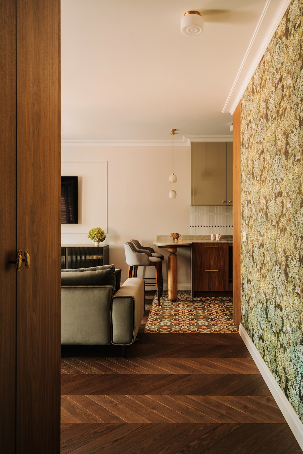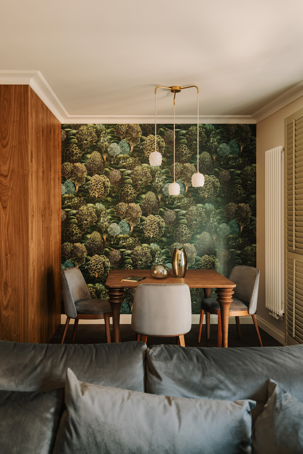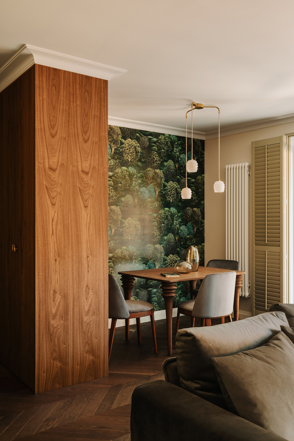 Wyrafinowany klimat części dziennej podkreślają krzesła i hokery włoskiej marki (Calligaris), wprowadzające do wnętrza nutę współczesnego designu. Ich lekka, nowoczesna forma doskonale kontrastuje z klasyczną bazą projektu, dębową podłogą ułożoną w jodłę francuską, orzechowymi fornirami oraz kamiennymi blatami. We wnętrzu dominują głębokie zielenie, oliwkowe ściany oraz tapety o roślinnych i baśniowych motywach. Tapety oraz sztukaterie pochodzą od firmy Arcydom i już od progu budują charakter wnętrza, nadając mu elegancki, lekko stylizowany wyraz. Motywy zwierzęce, w tym delikatna tapeta z sowami w pokoju dziecka, subtelnie nawiązują do pasji mieszkańców i wprowadzają element narracji.