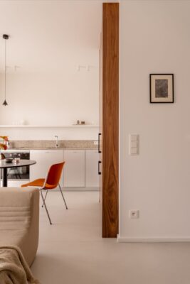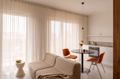 Mieszkanie w Krakowie o powierzchni 40 metrów kwadratowych to projekt, w którym udało się połączyć minimalizm, funkcjonalność i wyrazisty charakter. Neutralna baza kolorystyczna – biel, beże i ciepłe kremy – otwiera przestrzeń, a naturalne drewno i wyselekcjonowane materiały wprowadzają przytulność i elegancję. Podłogę wykończono mikrocementem, który dzięki swojej jednolitej, matowej strukturze nadaje całości nowoczesny, loftowy sznyt, a przy tym doskonale współgra z minimalistyczną koncepcją wnętrza.
