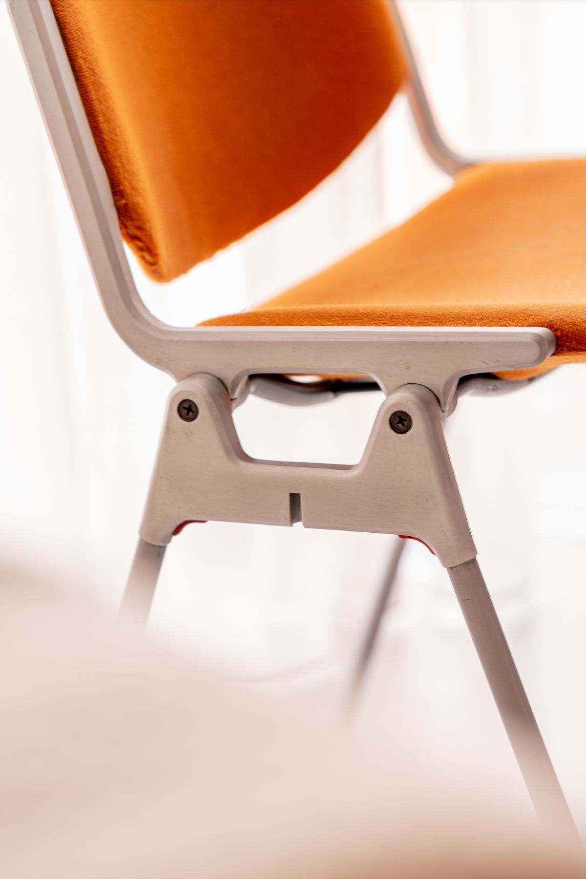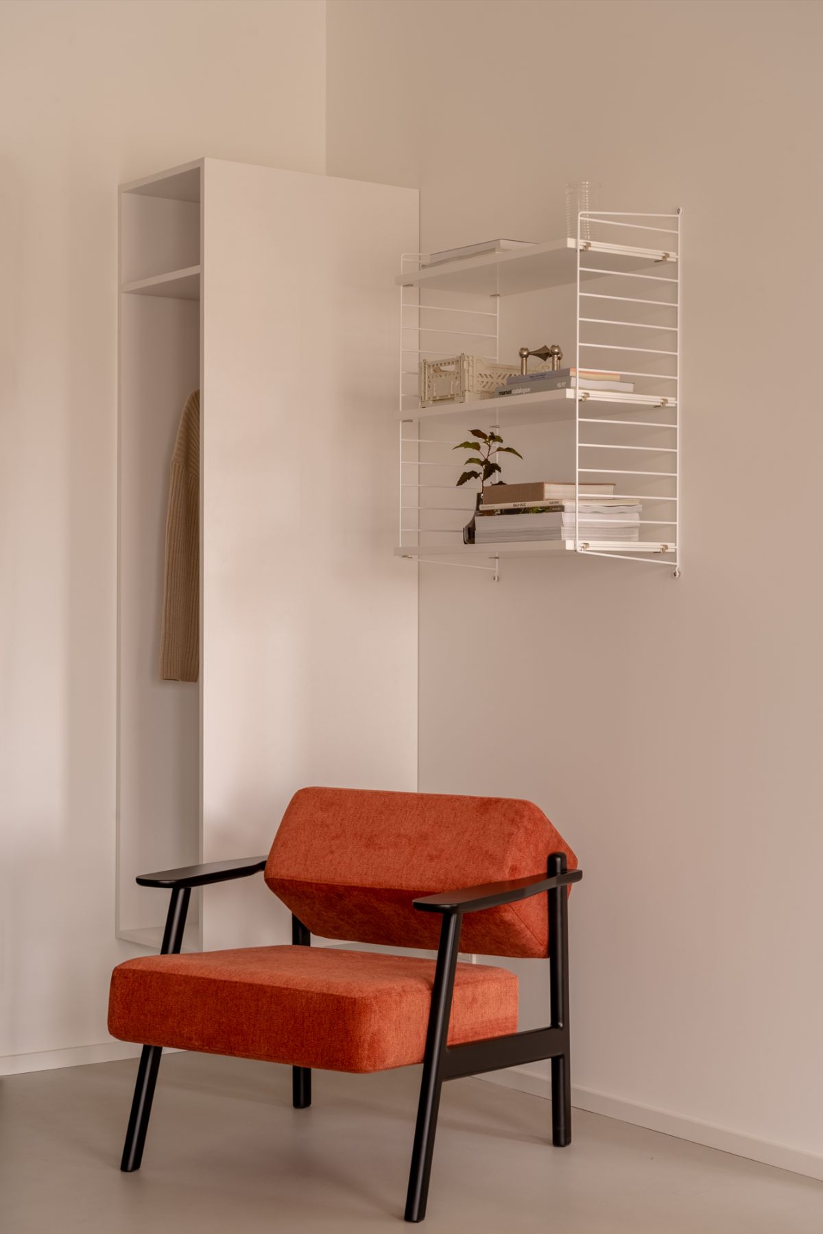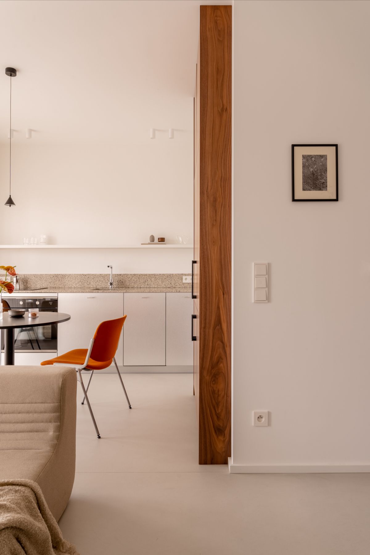 Centralnym punktem strefy dziennej jest okrągły stół w czerni, zestawiony z ikonami designu – pomarańczowymi krzesłami DSC 106 projektu Giancarlo Piretti dla Castelli, które wnoszą do wnętrza energię i ponadczasowy charakter. Nad stołem zawieszono lampę polskiej marki Chors, której subtelna forma wyznacza strefę jadalnianą i podkreśla minimalistyczny charakter aranżacji.