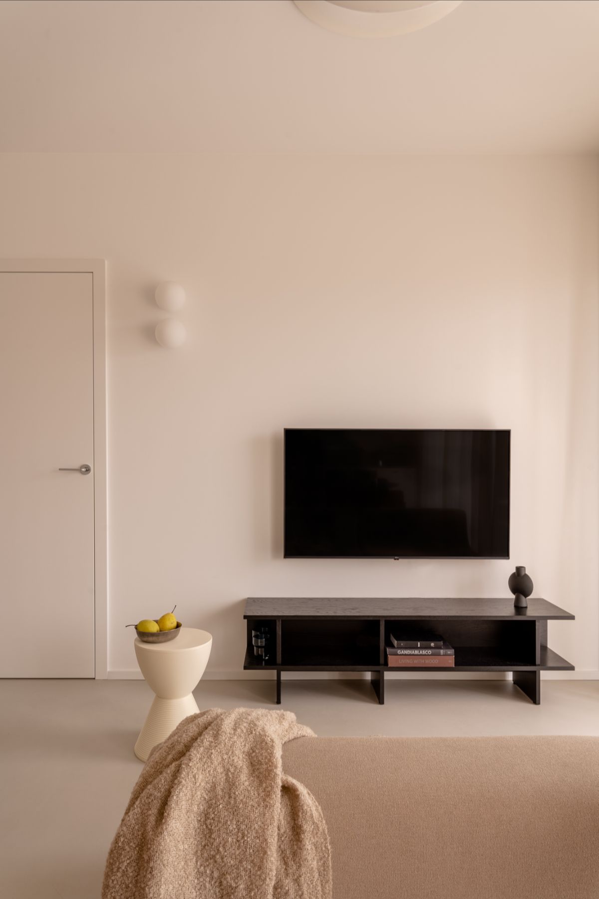 Całość spina starannie zaprojektowane oświetlenie, które równocześnie porządkuje przestrzeń i nadaje jej nastroju. Subtelna gra światła i cienia podkreśla faktury materiałów, wydobywa detale i pozwala w pełni docenić spokojny, a zarazem wyrazisty charakter mieszkania.