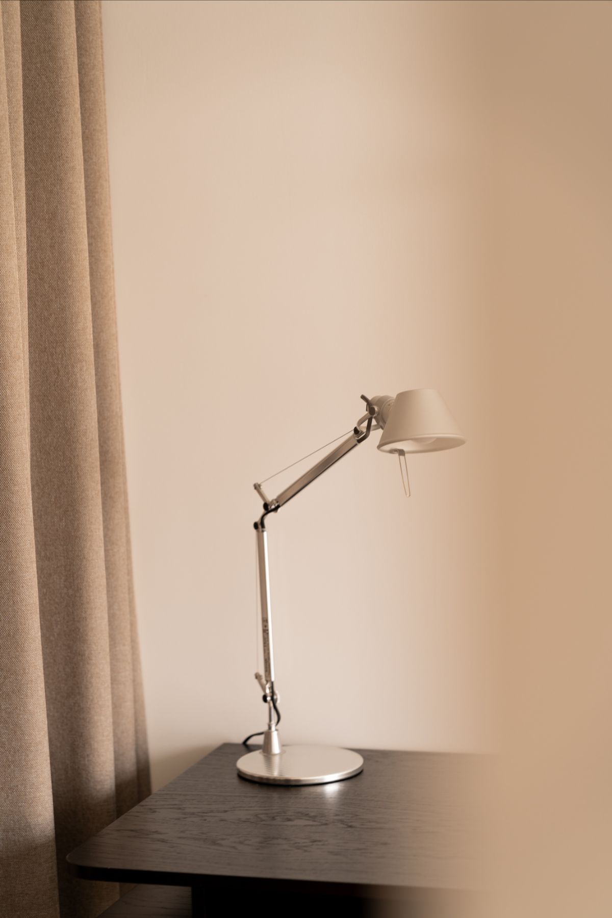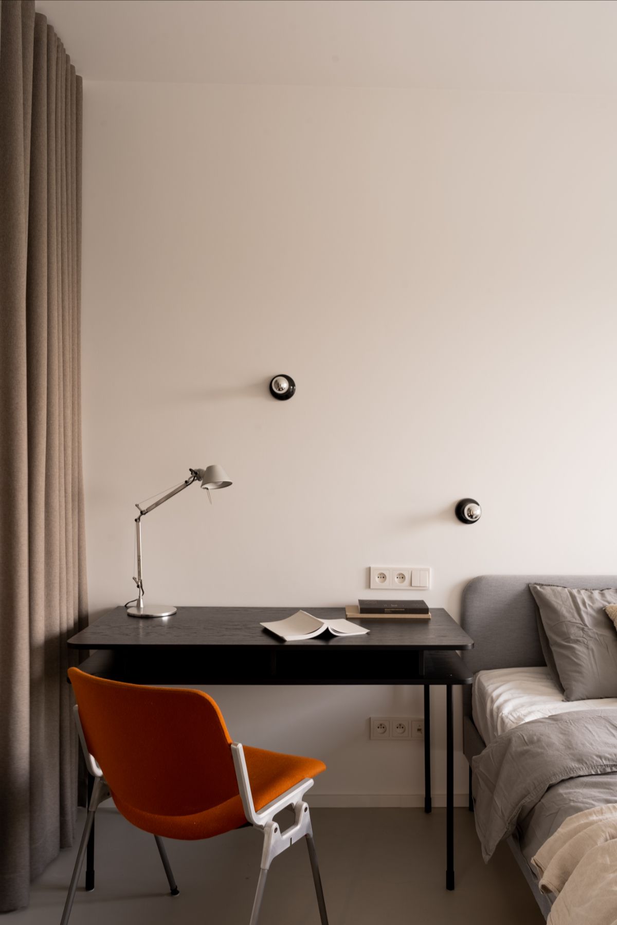 Sypialnia oraz garderoba zostały zaaranżowane w sposób elastyczny. Garderoba powstała w systemie Elfa, ukryta za lekką zasłoną, co umożliwia dopasowanie przestrzeni do codziennych potrzeb. Biurko oraz szafka RTV zostały zaprojektowane indywidualnie pod tę realizację – dopasowane wymiarowo i stylistycznie, stanowią integralny element wnętrza.