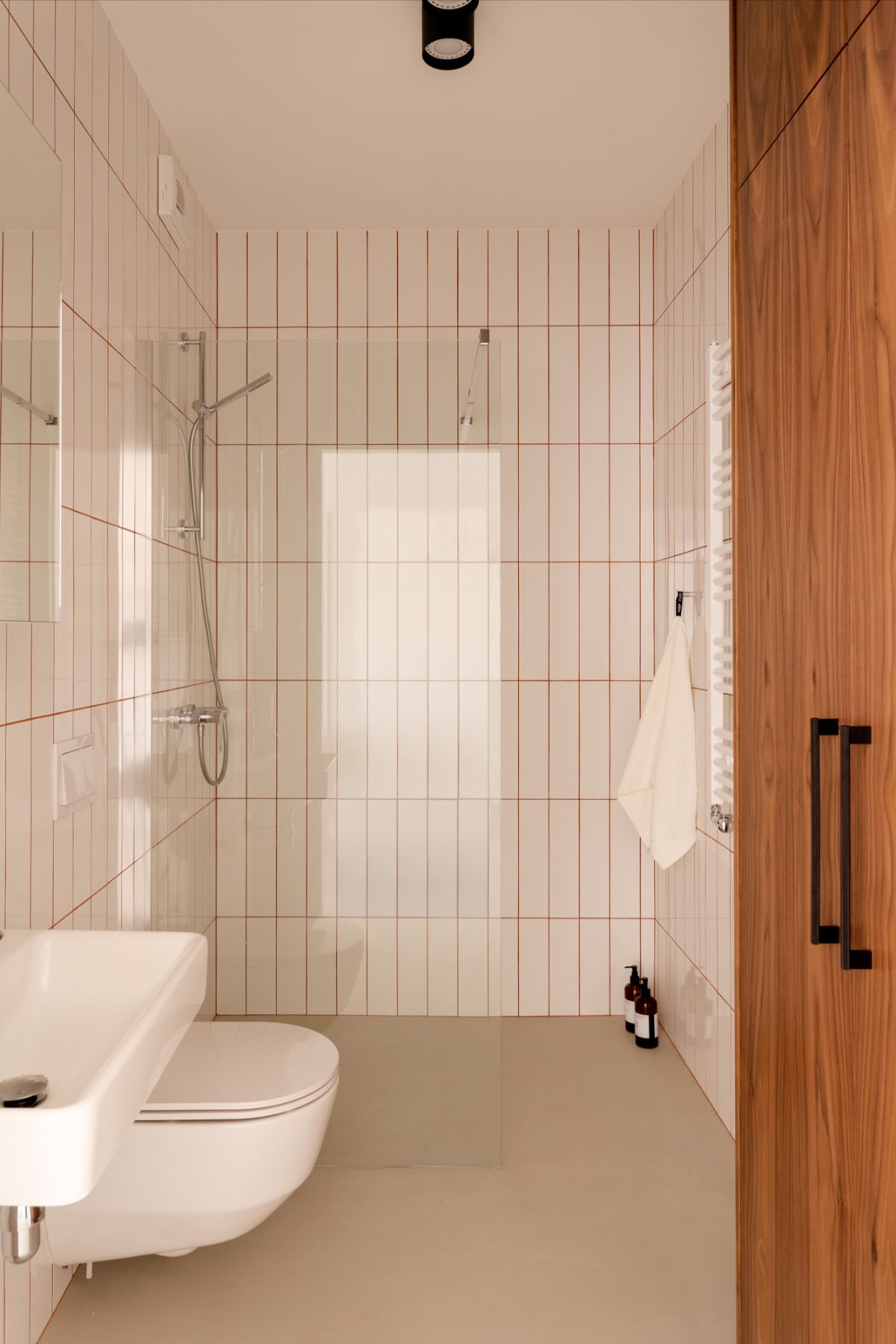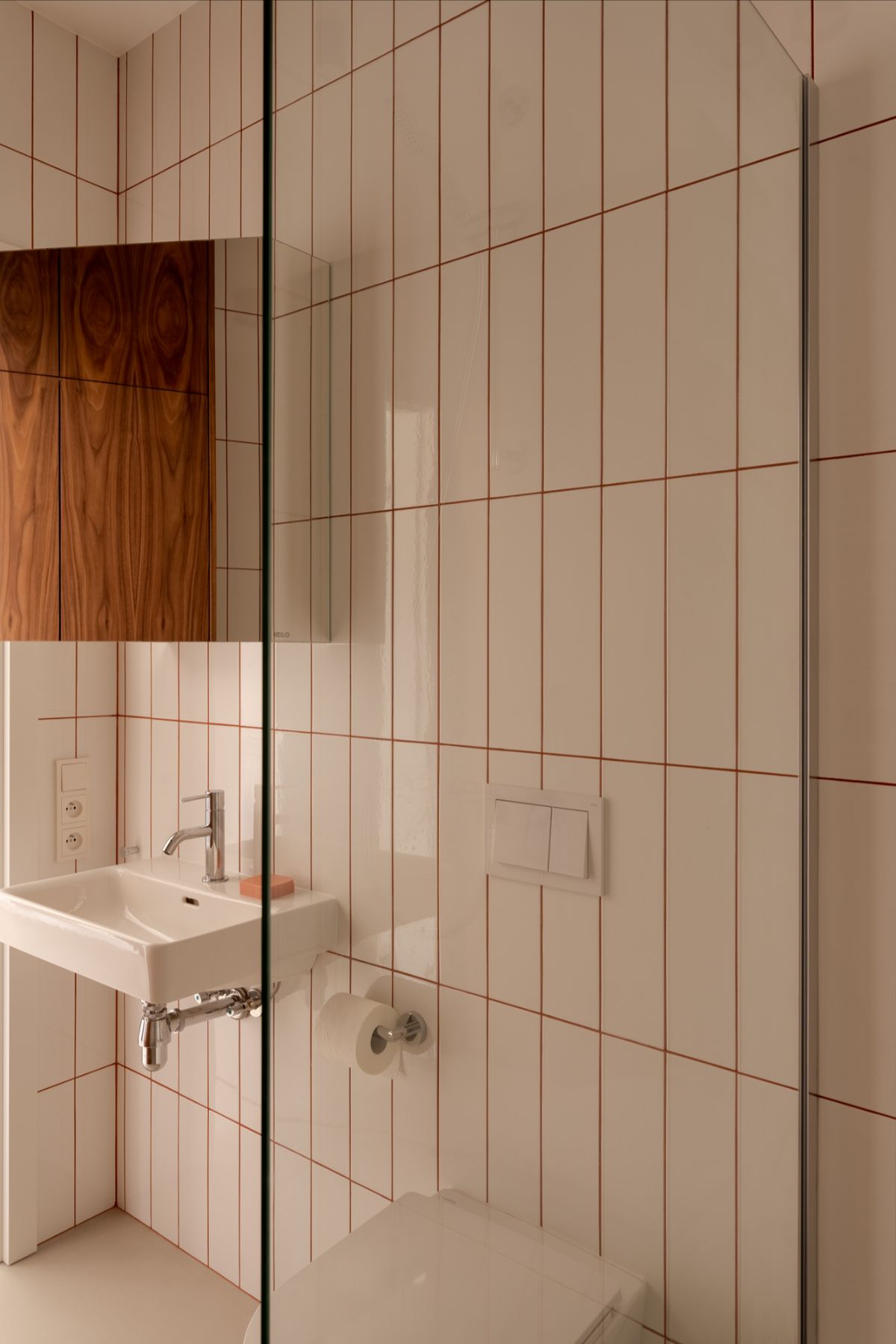Łazienka utrzymana jest w rytmie jasnych płytek, przełamanych pomarańczową fugą, która nadaje całości świeżości i podkreśla geometryczny układ kafli. Chromowana armatura dodaje elegancji i wprowadza klasyczną nutę do minimalistycznej aranżacji.
