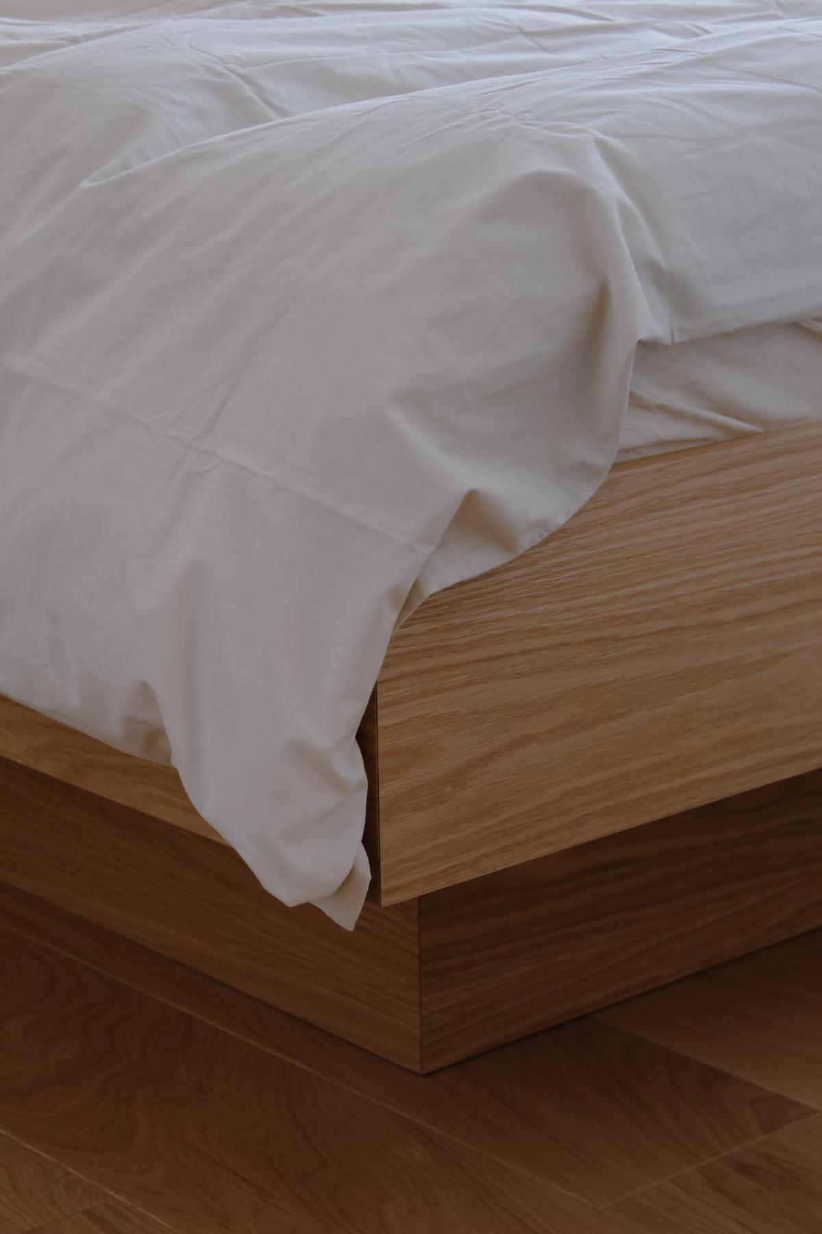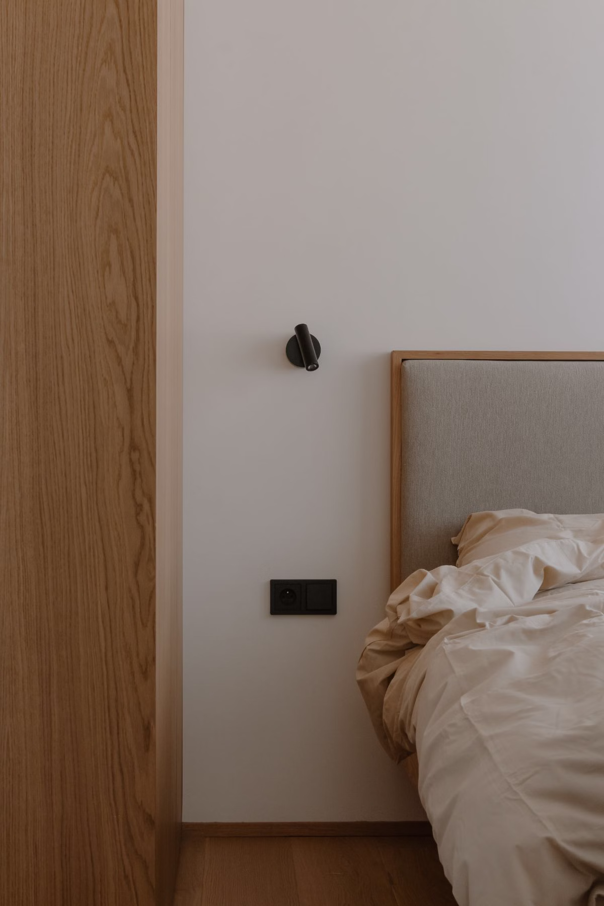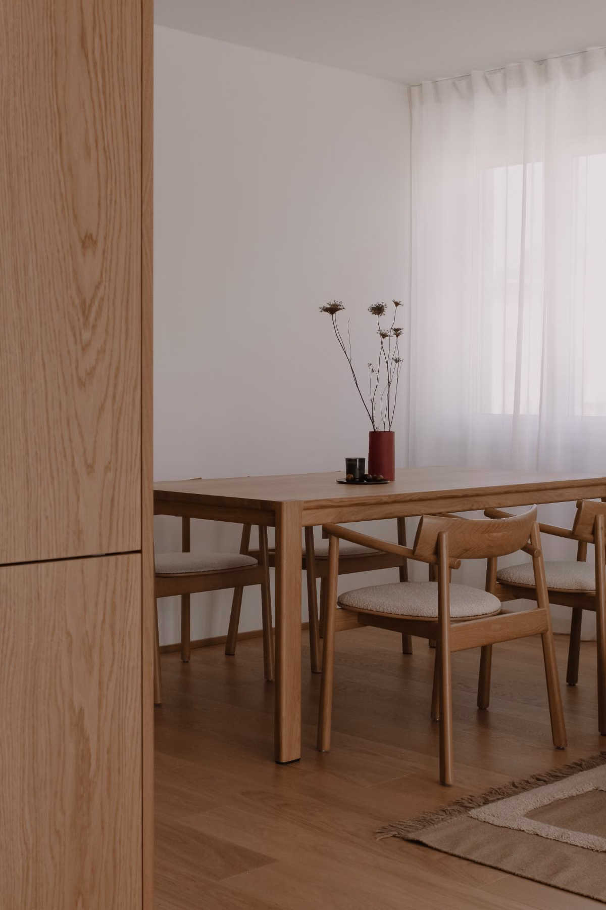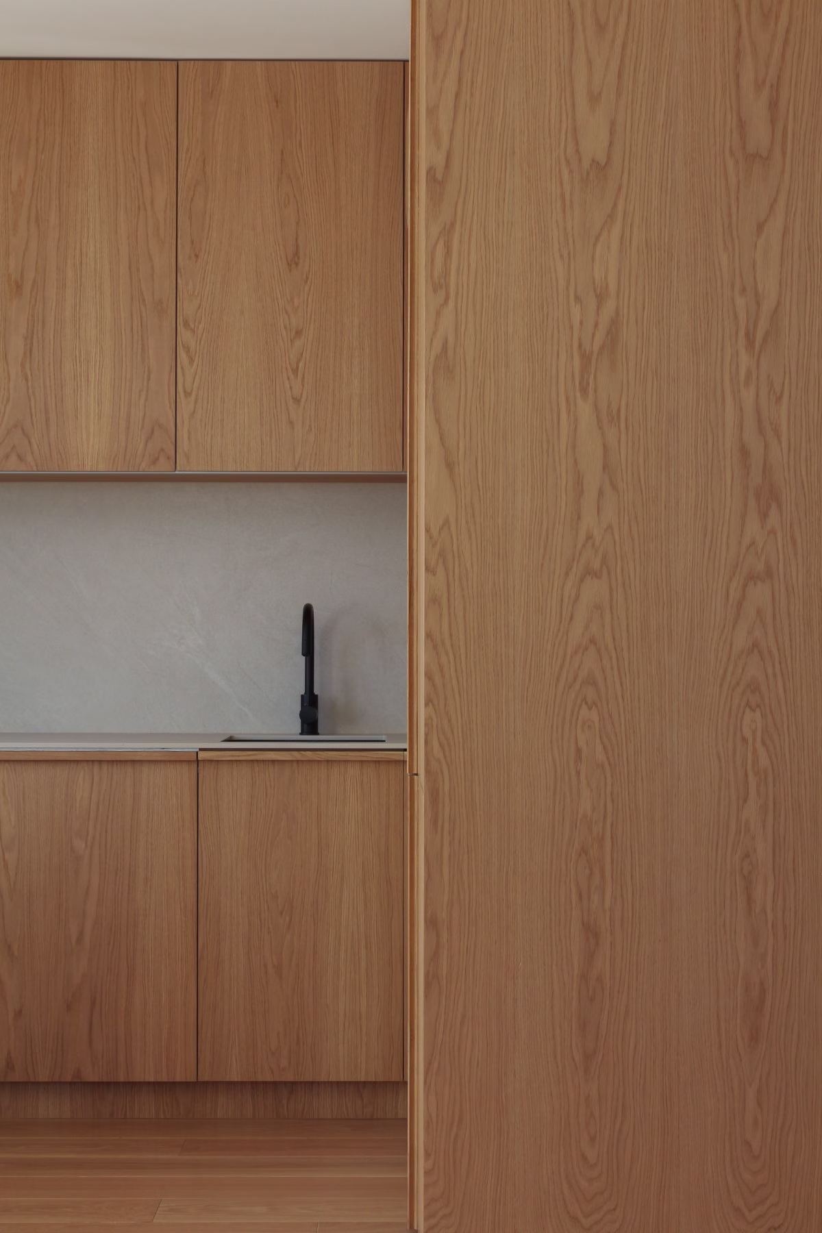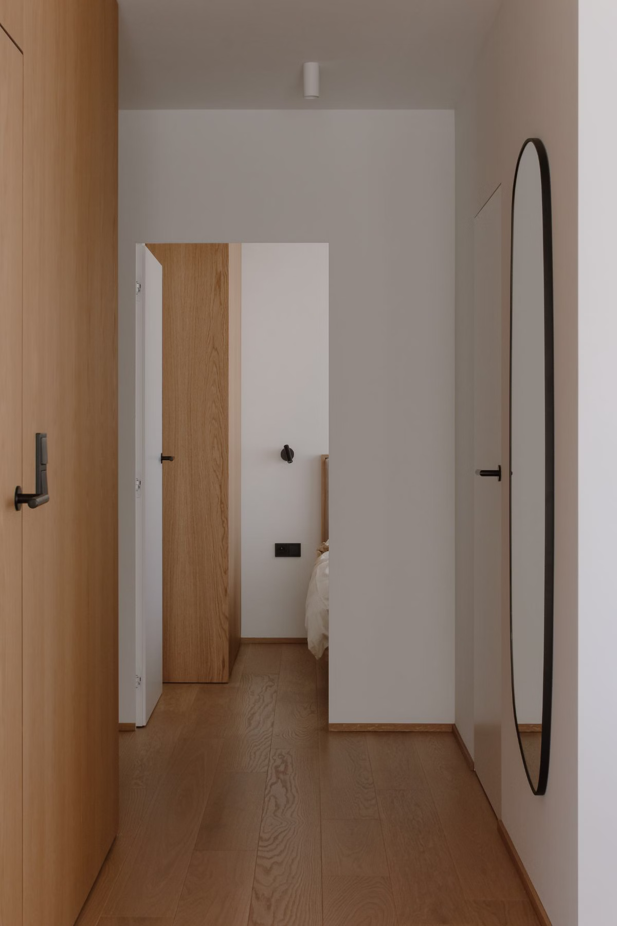 Głównym materiałem wykorzystanym we wnętrzu jest drewno w postaci podłóg, fornirowanych zabudów i mebli. Ważnym elementem jest zabudowa, która zaczyna się przy wejściu i prowadzi przez salon do kuchni, skrywając w sobie szafy, łazienkę oraz małą spiżarnię. Jest to element, który łączy te pomieszczenia, tworząc w mieszkaniu spójną przestrzeń. Kuchnia, szafy we wszystkich pomieszczeniach oraz łóżko zostały wykonane na wymiar. Całość dopełniają dopracowane detale, takie jak indywidualnie zaprojektowane proste, drewniane uchwyty i listwy przypodłogowe.