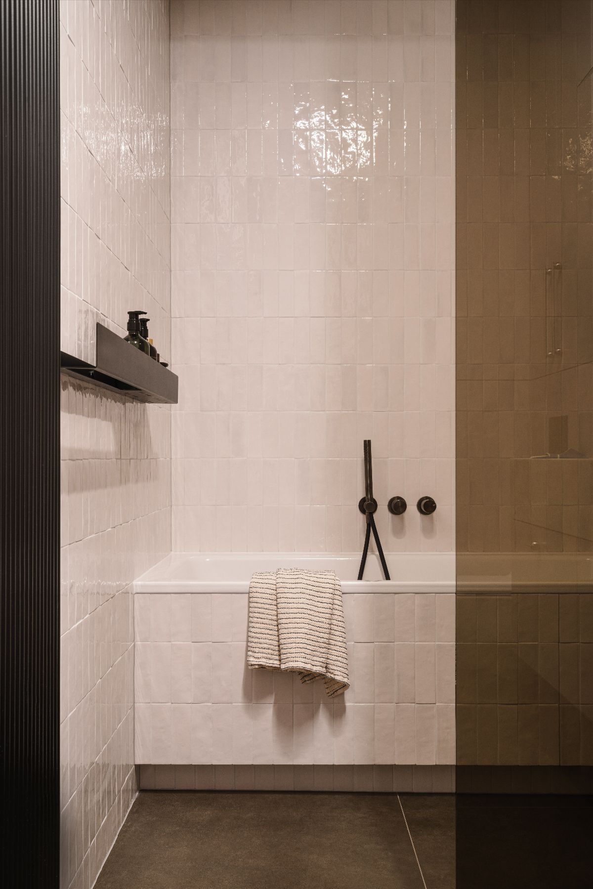 Łazienka została zaprojektowana jak prywatna strefa relaksu. Baza z błyszczących płytek o nieregularnej strukturze delikatnie odbija światło, tworząc subtelną grę faktur. Zestawienie jasnych powierzchni z grafitową armaturą, ciemnym gresem i dodatkami sprawia, że przestrzeń wydaje się zarazem szlachetna i graficzna – niemal jak wycięta z kadru filmu o architekturze. Luksusowy akcent wprowadza umywalka z beżowego kamienia – masywna i na wskroś elegancka. Minimalistyczna forma wanny i kabiny prysznicowej z przyciemnianego szkła sprzyjają wyciszeniu, a w połączeniu z miękkim światłem tworzą nastrój domowego SPA.