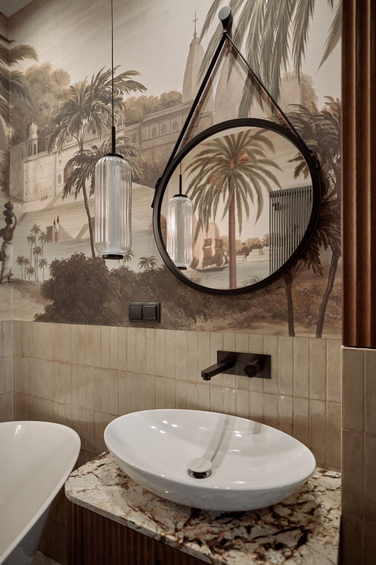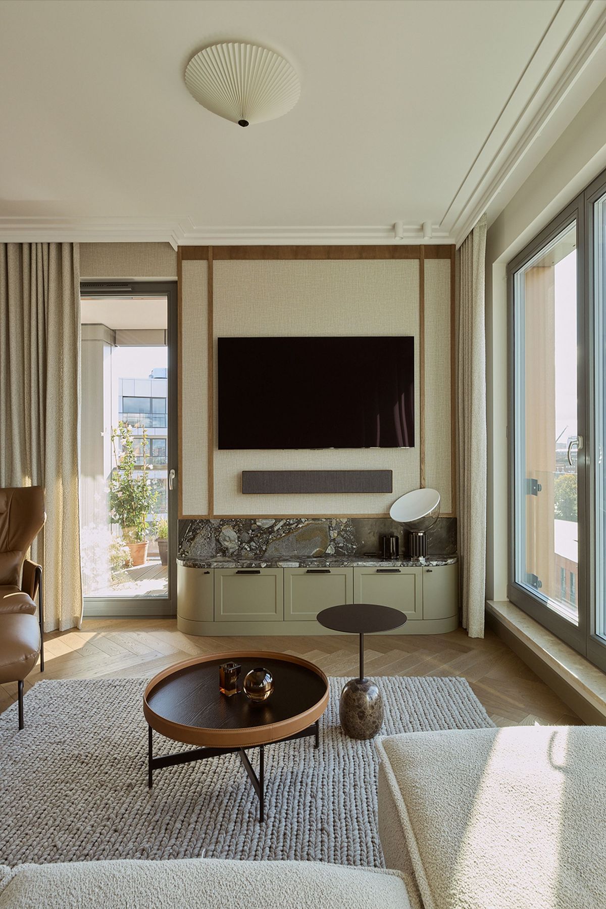 Już od pierwszego kroku przyszłych mieszkańców i gości wita subtelna gra światła odbijanego w lustrzanych powierzchniach. W holu znalazła się smukła skórzana ławka, inspirowana latami 50. W części prywatnej apartamentu zastosowano egzotyczne tapety, które nadają wnętrzu nieco kolonialnego charakteru. Miękkie tkaniny, ciężkie zasłony i stonowane barwy tworzą tu idealne warunki do wypoczynku. Połączona z sypialnią łazienka, wykończona wielkoformatowymi płytami inspirowanymi trawertynem, wzmacnia wrażenie luksusu. W apartamencie znajdziemy również kompaktowy gabinet, idealny dla osób pracujących zdalnie. Korytarz zaprojektowano tak, by zyskać dodatkową zabudowę, w której sprytnie ukryto pralnię, co uwalnia przestrzeń w łazienkach i zwiększa komfort korzystania z mieszkania.