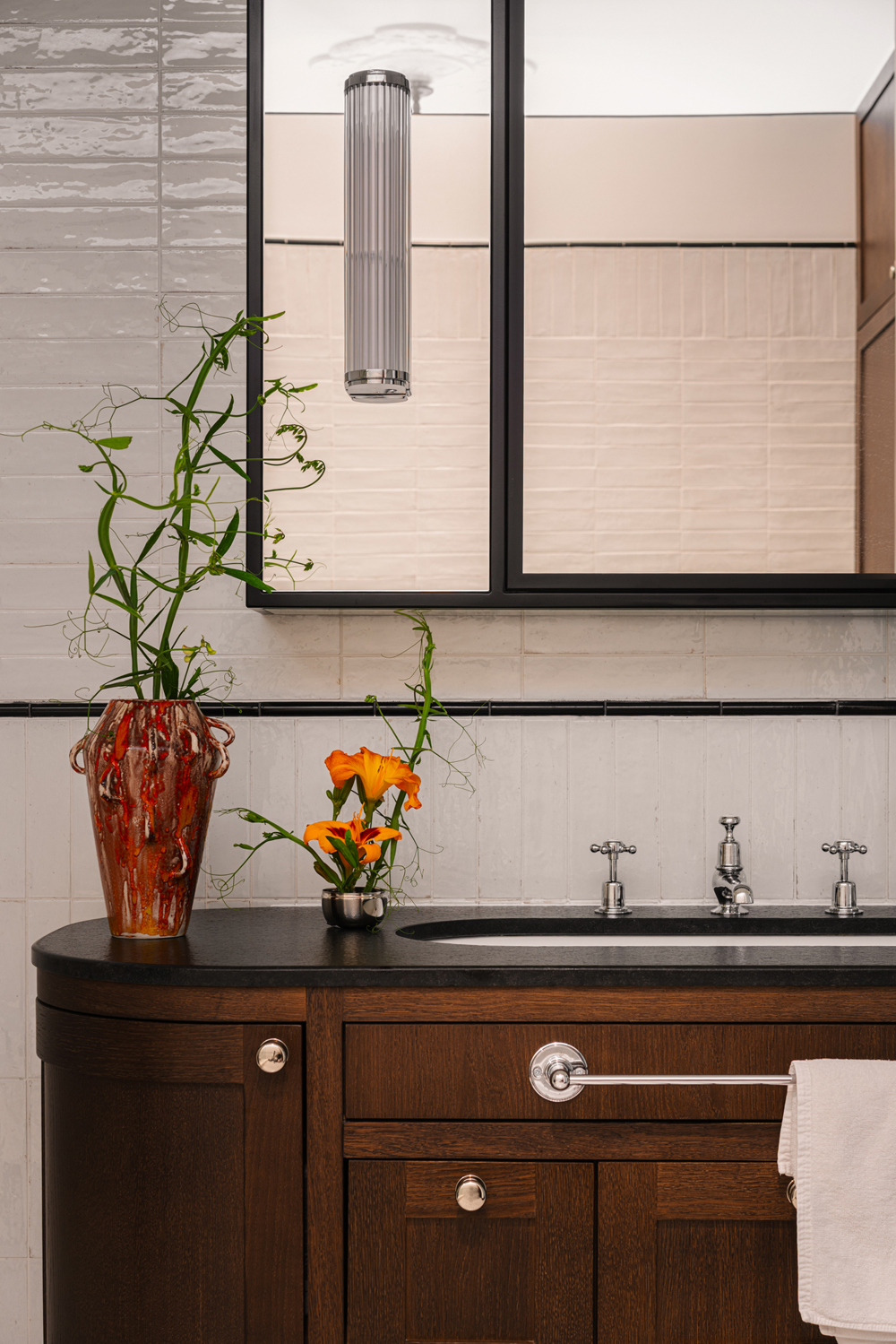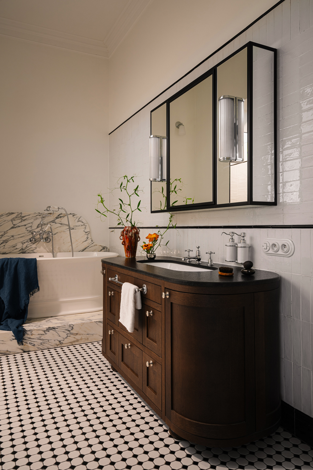 Mieszkanie o powierzchni 88 m² Maria Jachalska projektowała dla pana Emila – prawnika, kolekcjonera książek i miłośnika dobrego designu. Wymagającego, lecz wrażliwego na piękno i secesyjną estetykę, z którym udało jej się znaleźć wspólny język. Dzięki temu układ funkcjonalny apartamentu w dużej mierze pozostał bez zmian. Kluczowe okazały się natomiast subtelne, lecz znaczące interwencje – doświetlenie kuchni i łazienki oraz powiększenie tej drugiej kosztem sypialni, co pozwoliło stworzyć pełnoprawny salon kąpielowy. Dziś jest on jednym z najmocniejszych punktów realizacji, a zarazem naturalnym przedłużeniem przyjętej koncepcji estetycznej, obecnej w całym apartamencie – pełnej obłych kształtów, łagodnie zaokrąglonych mebli, miękkich linii zabudów i subtelnych, florystycznych akcentów. Motywów charakterystycznych dla secesji, zinterpretowanych jednak w nowoczesny, wyważony sposób.