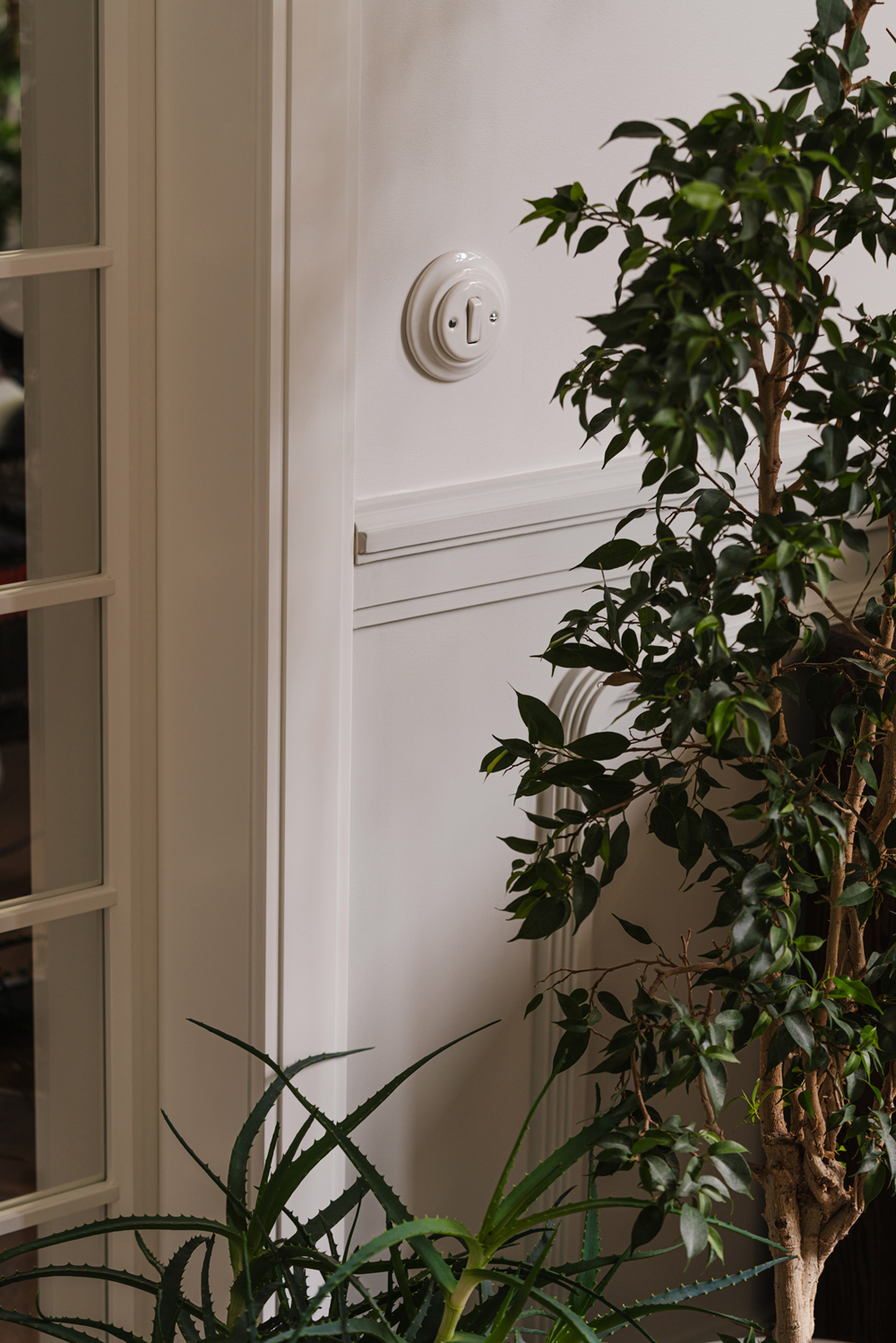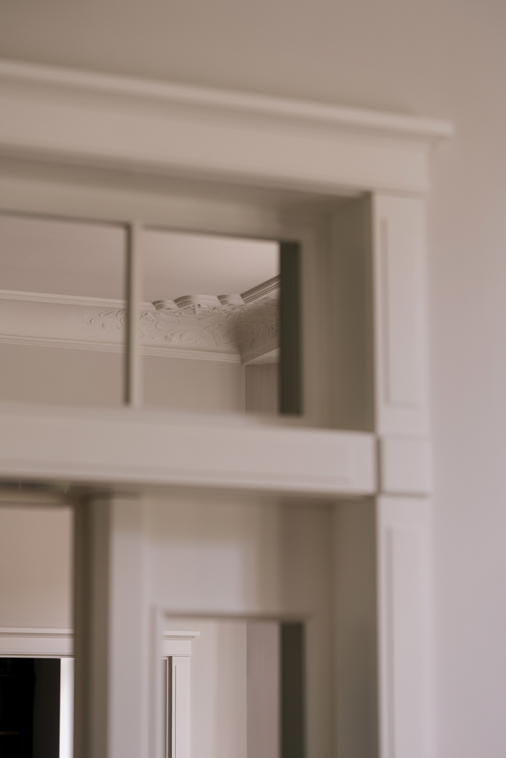 Kiedy spoglądamy na przejście pomiędzy kuchnią a salonem, nie zdajemy sobie sprawy, że oto patrzymy na jedno z największych wyzwań realizacyjnych, przed jakimi stanęła architektka. Projekt początkowy zakładał umieszczenie tu metalowo-szklanych drzwi w stylu art déco, jednak efekt pracy wykonawcy znacznie odbiegał od pierwotnej wizji. Zamiast kurczowo trzymać się pierwotnych założeń, Maria Jachalska pozwoliła, by projekt w naturalny sposób ewoluował. Tak powstało łukowe przejście wykończone sztukaterią, wykonane przez lokalnego rzemieślnika. Co istotne – promień łuków dokładnie odpowiada zaokrągleniom kuchennych zabudów, dzięki czemu całość zyskała spójność i lekkość.