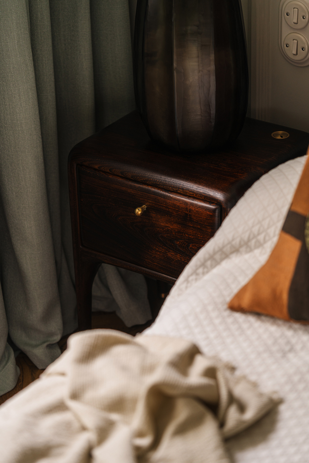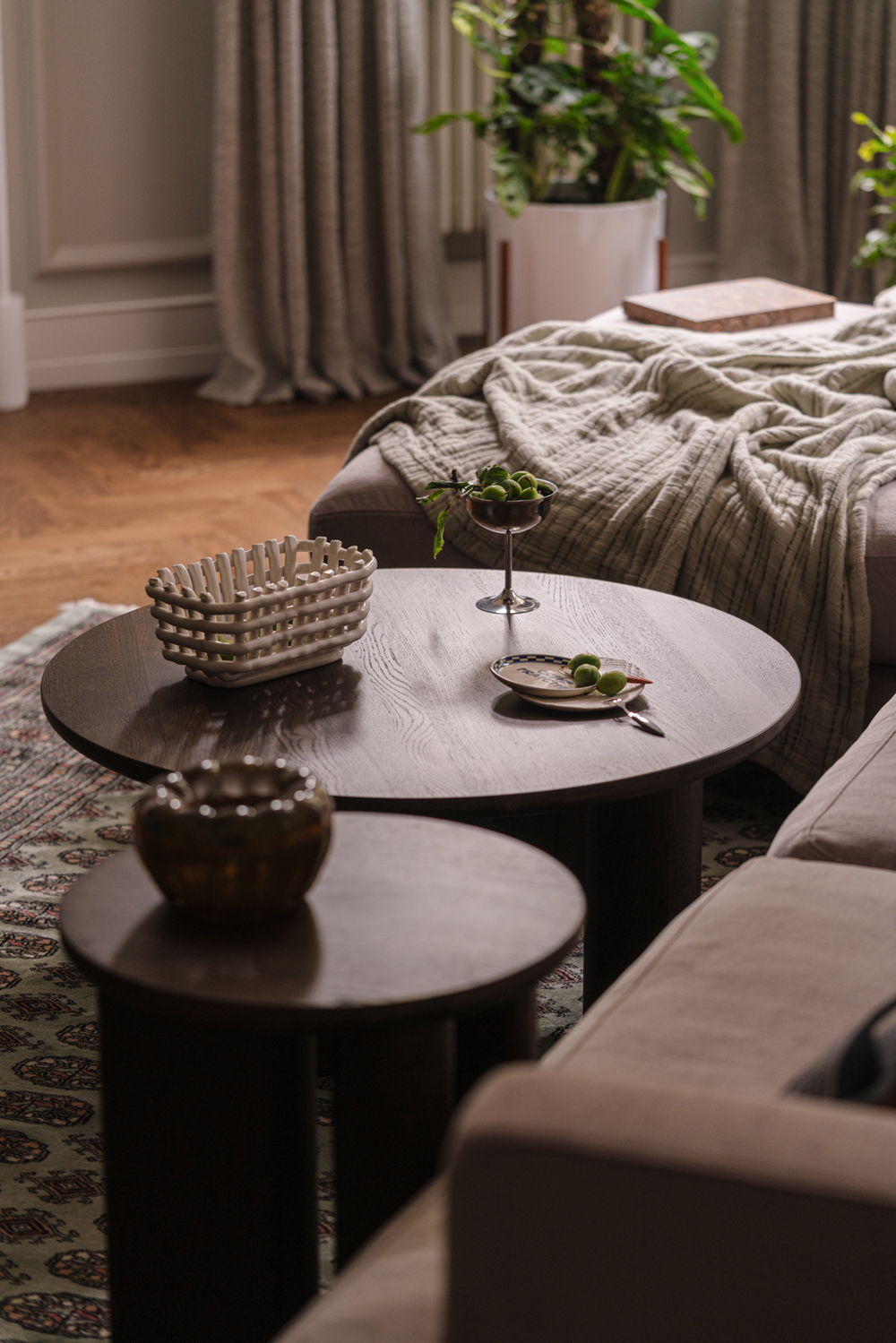 Już od progu uwagę zwraca drewniana szafa z zaokrąglonym bokiem – detal, który subtelnie zapowiada stylistykę całego apartamentu. Salon z wykuszem otwiera się na zieleń Parku Wilsona, dzięki czemu krajobraz niemal „wchodzi” do wnętrza. Centralnym punktem strefy wypoczynkowej jest wygodna sofa Brandon marki Sits, zestawiona z okrągłymi stolikami oraz szafką RTV Olaio Caravela, inspirowaną estetyką mid-century modern. Szczególną uwagę zwracają zachowane sztukaterie, które stały się naturalnym łącznikiem między historyczną tkanką budynku a nowym wyposażeniem. Zamiast dominować, wnętrze dyskretnie podąża za architekturą kamienicy, subtelnie ją podkreślając.