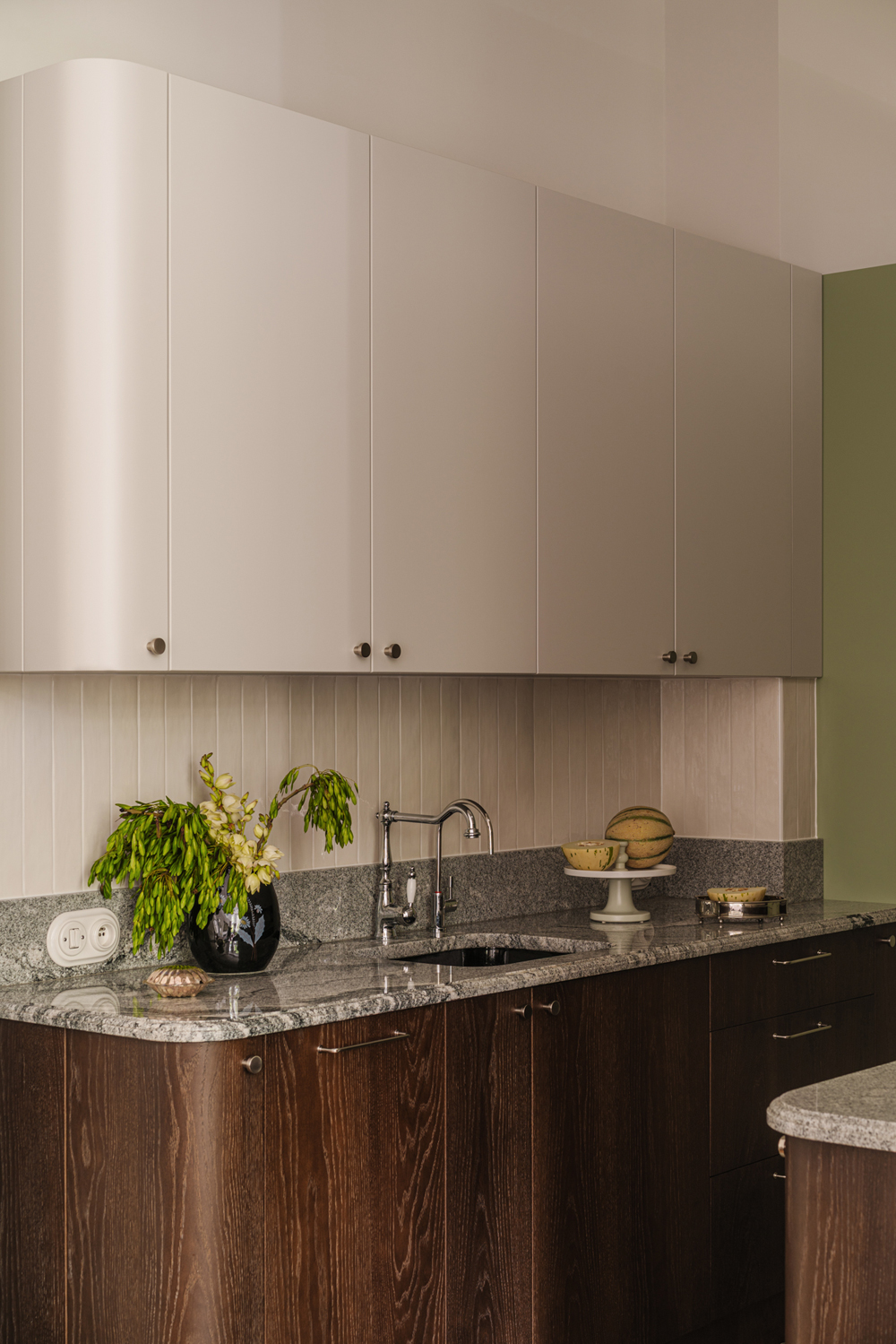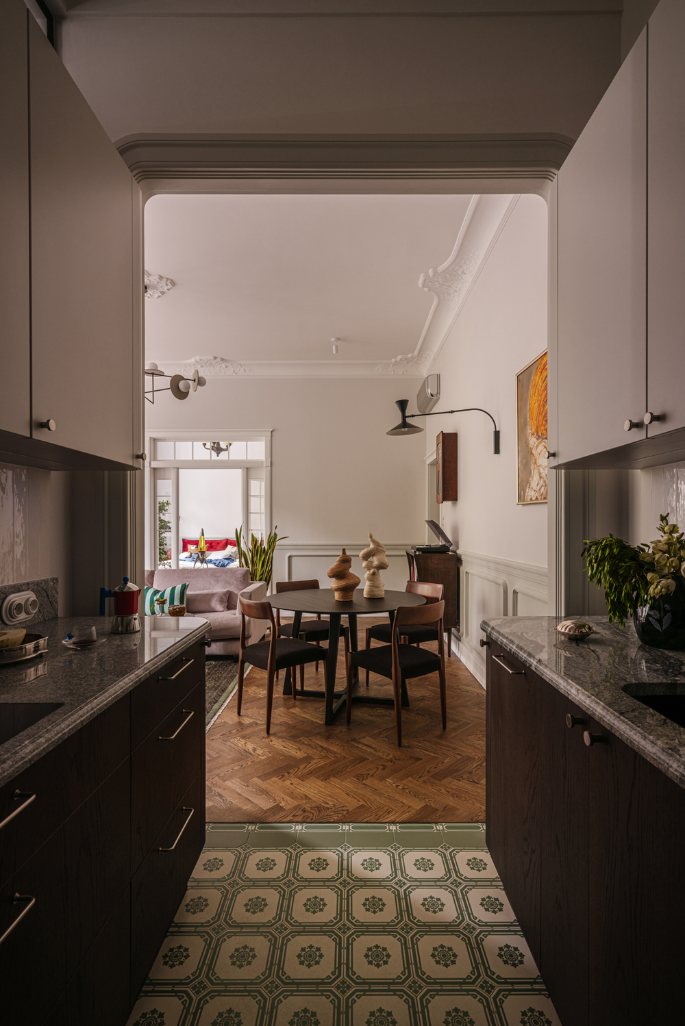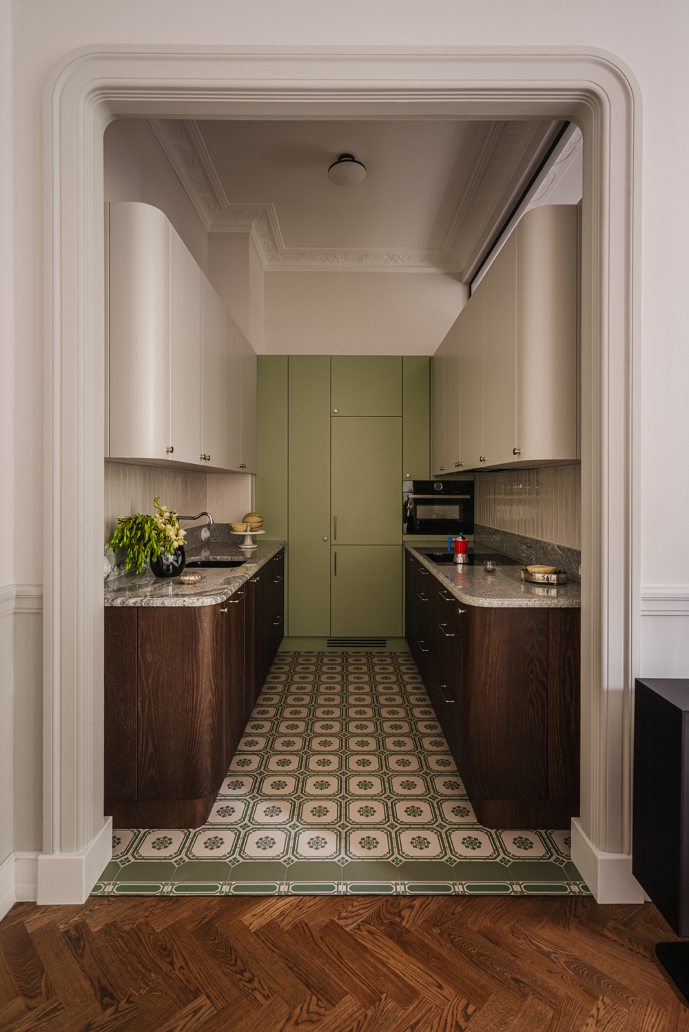 Tuż za przejściem rozciąga się kuchnia, która wyraźnie pokazuje, z jaką konsekwencją architektka przełożyła secesyjne inspiracje na język współczesnych materiałów i kolorów. Część zabudowy utrzymana jest w odcieniu oliwki – obecnym również na mozaikowych płytkach Ceramiche Grazia Old England oraz w subtelnych tonach kamienia na blatach. Górne szafki w kolorze złamanej bieli rozjaśniają przestrzeń i harmonijnie wpisują się w całość wnętrza, natomiast dolna zabudowa z ciemnego drewna dodaje kuchni elegancji i głębi.