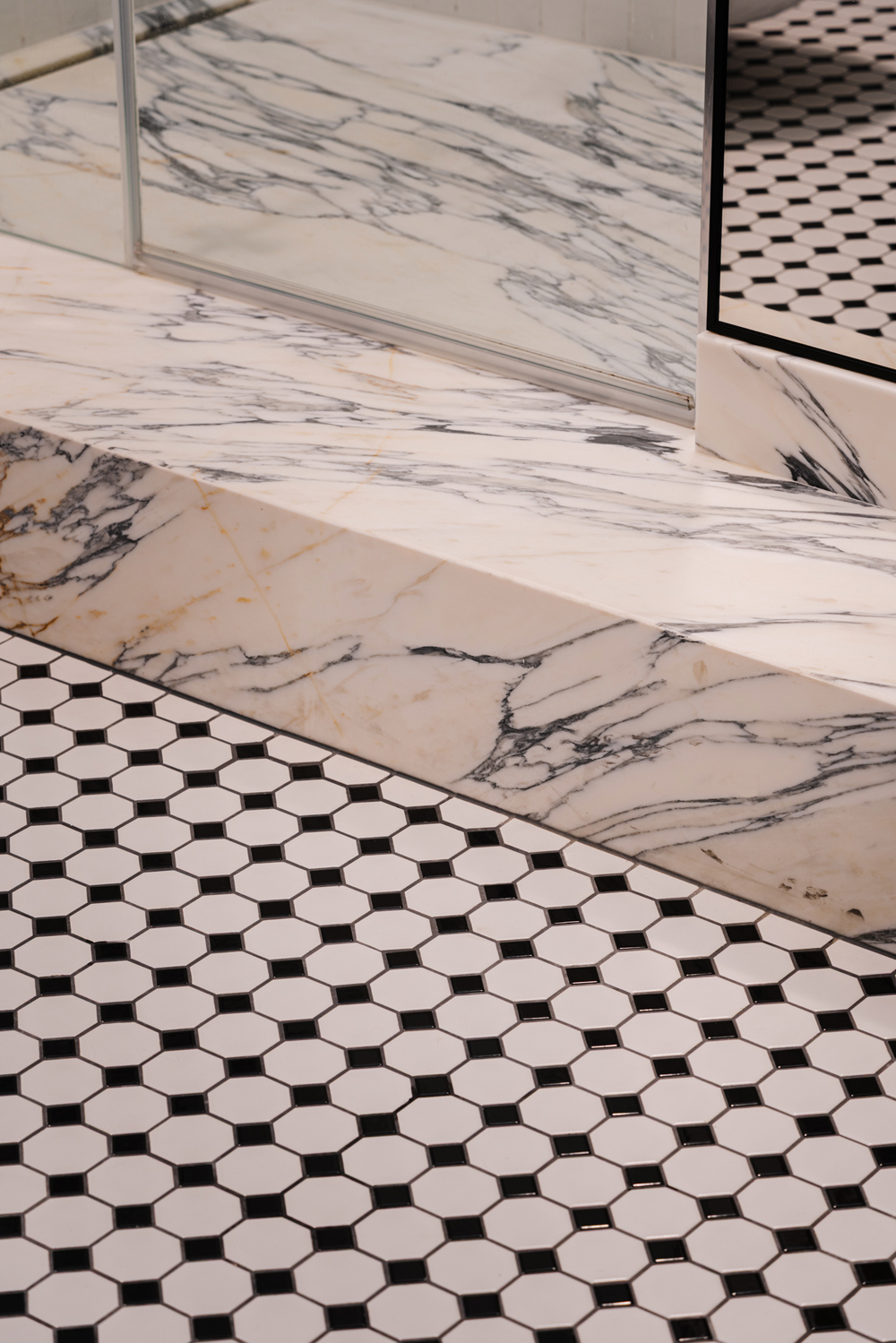 Inwestorowi szczególnie zależało na stworzeniu salonu kąpielowego – miejsca, które będzie sprzyjać wyciszeniu. Centralnym punktem stała się wolnostojąca wanna ustawiona na podeście z marmuru statuario corchia, którego naturalny rysunek i nieregularny układ żył tworzą subtelną grę form. Jasne, szlachetne powierzchnie kamienia architektka zestawiła z eleganckimi akcentami armatury oraz dyskretnym, punktowym oświetleniem, budując atmosferę intymności i spokoju. Kluczową rolę odgrywa tu światło dzienne, wprowadzone do wnętrza dzięki doświetleniom – rozwiązaniu, które diametralnie zmieniło komfort korzystania z tej przestrzeni.