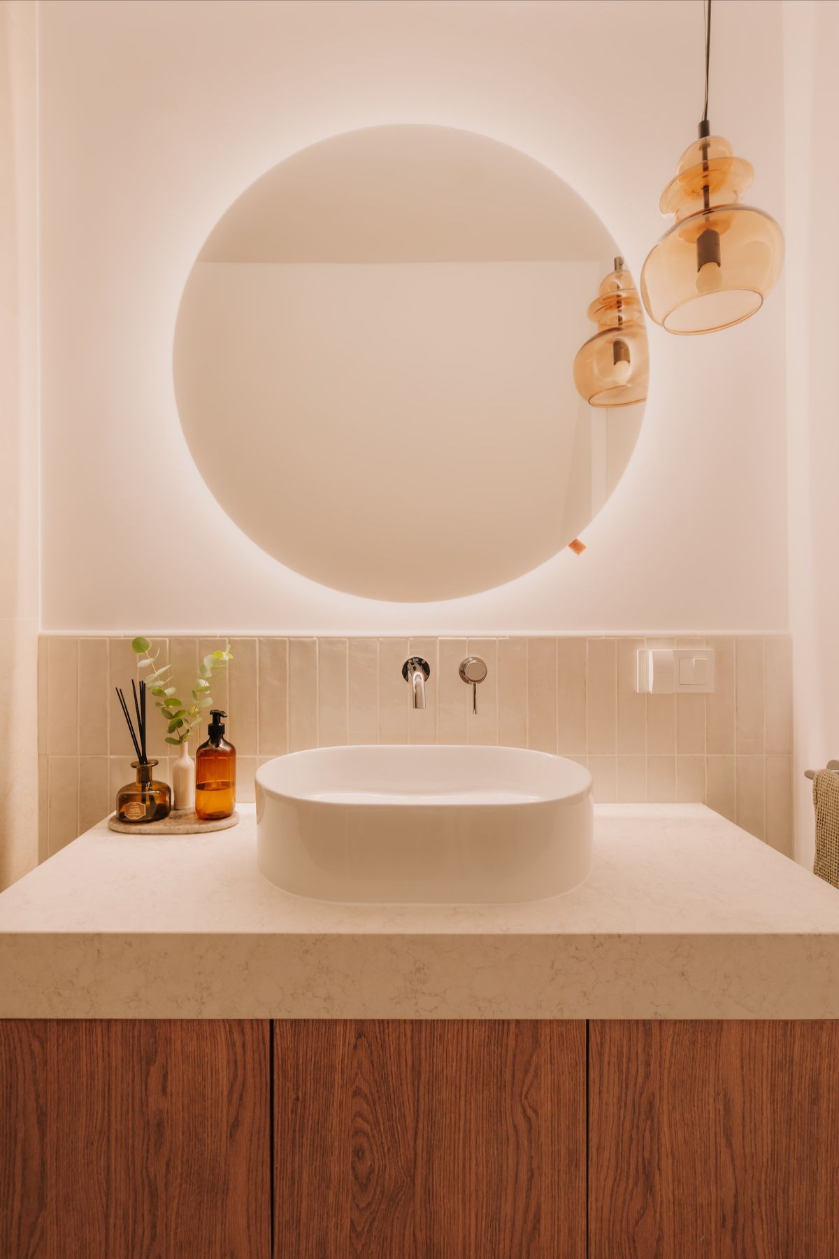 Kuchnię wykończono w kolorze orzecha włoskiego, a całość dopełniają fronty górnych szafek w delikatnym beżu i blat z jasnego konglomeratu. Takie połączenie materiałów i kolorów nadaje wnętrzu szlachetności i ponadczasowego charakteru. Podłogi w całym mieszkaniu pokryto panelami winylowymi ułożonymi w klasyczną jodełkę, co dodatkowo podkreśliło inspiracje stylem mid-century modern. Ściany pozostawiono w bieli, która stała się neutralnym tłem dla dekoracyjnych akcentów. Dyskretnie zastosowana sztukateria wprowadza do wnętrza subtelną grę światła i cienia, nadając mieszkaniu wyrazistości, ale bez zbędnej dekoracyjności. W całym apartamencie uwagę zwracają także starannie dobrane detale – od oświetlenia Nordlux, przez meble, aż po osprzęt elektryczny Kontakt-Simon.