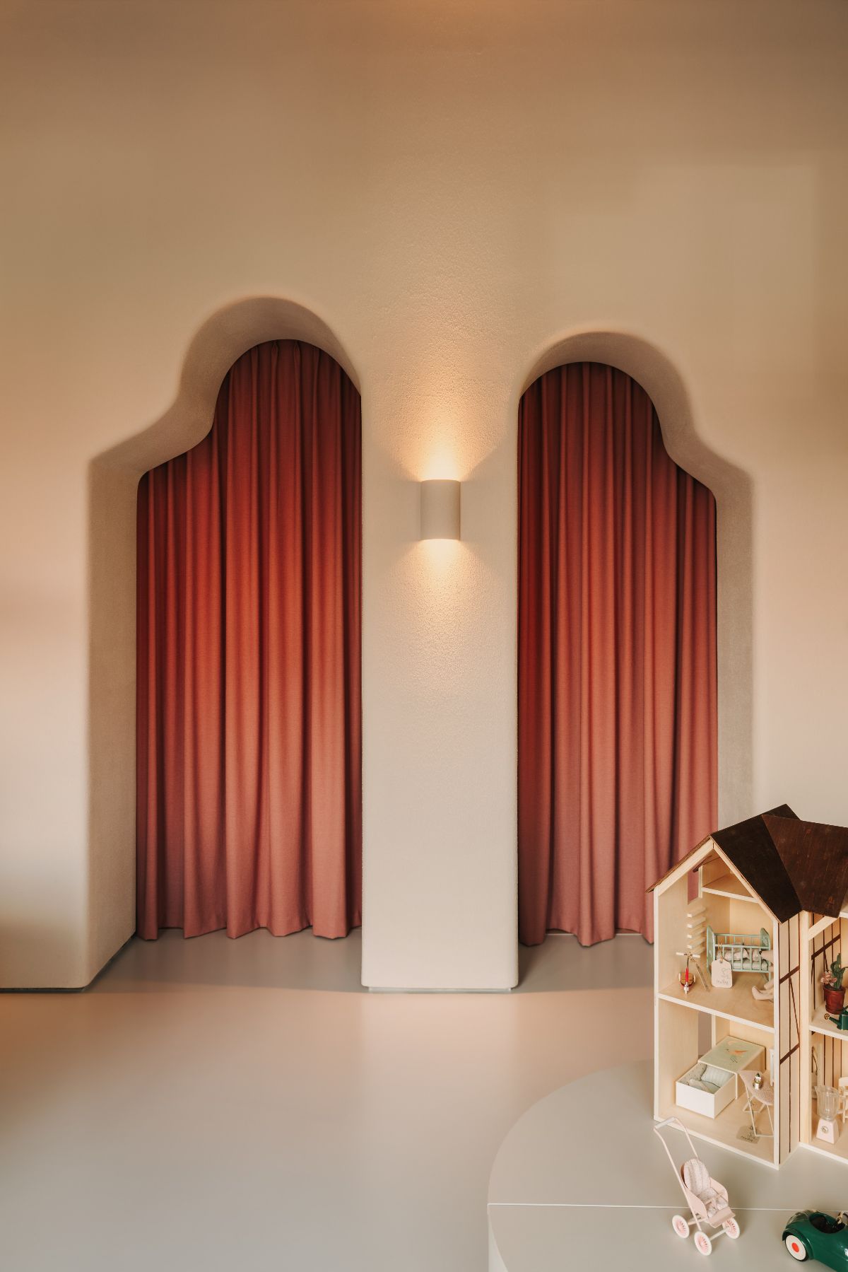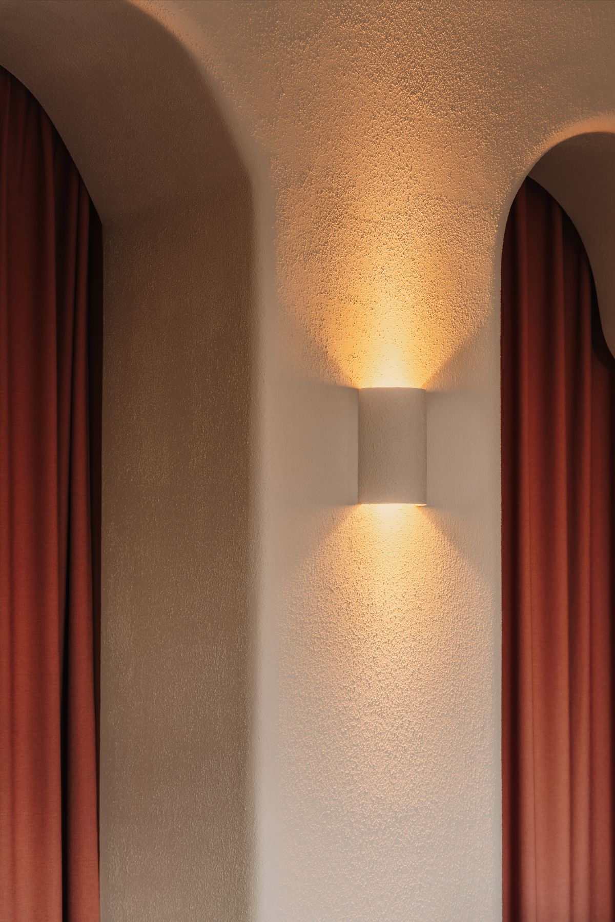 Na wprost wejścia uwagę przyciąga dekoracyjna ściana ze strukturalnym tynkiem i organicznymi otworami, które zastępują klasyczne drzwi. Ściana pełni funkcję przegrody oddzielającej zaplecze, magazyn i toaletę. Zasłony w odcieniach ceglasto-różowych podkreślają miękki, przyjemny charakter wnętrza.