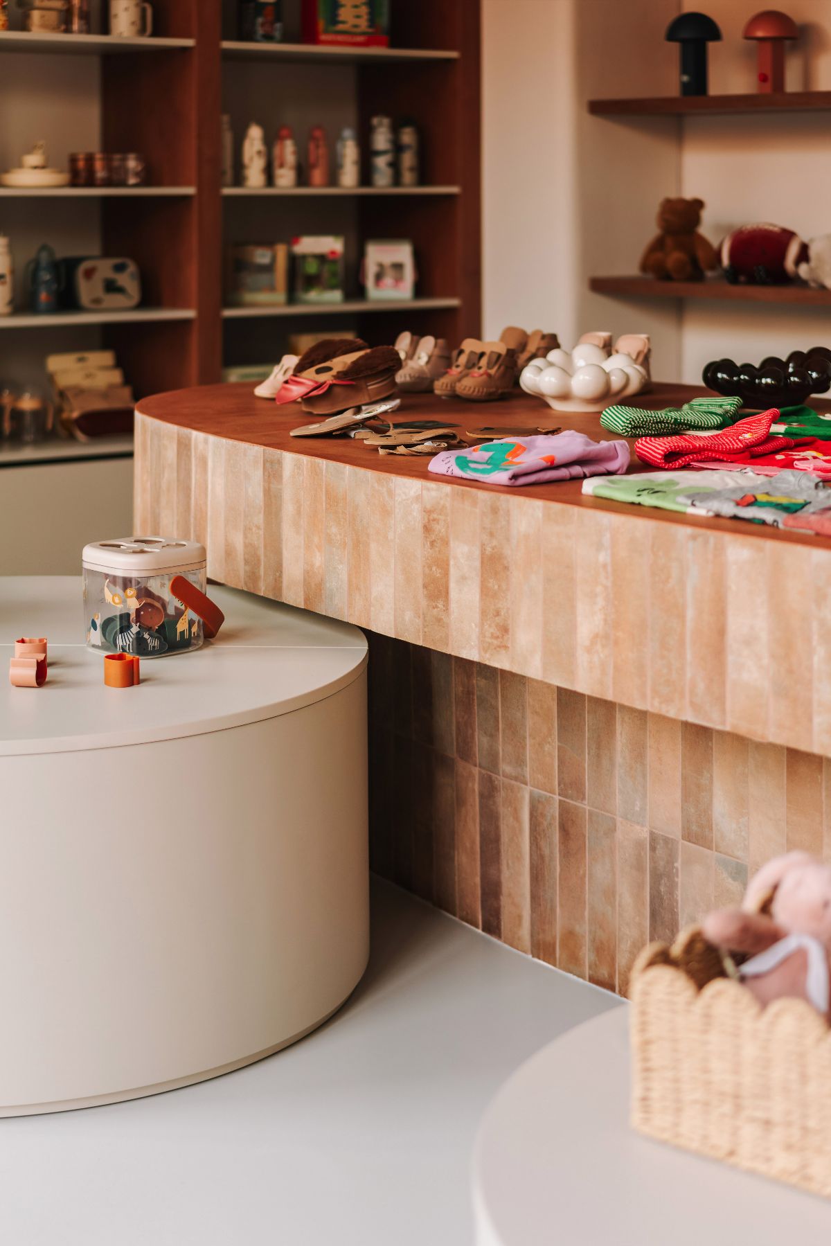 – Projekt mini bébé oparty jest na naturalnych, ciepłych materiałach takich jak cegła licowa w kolorze wpadającym w róż, mikrocement, na strukturach tynku, tkaninach o wyraźnym splocie i drewnianych elementach. Wszystko to buduje wrażenie spokoju i rękodzielniczego charakteru. Centralne miejsce zajmują wymurowana lada i stół ekspozycyjny o organicznych kształtach. Dzięki elastycznemu układowi ekspozycji, showroom można też łatwo przearanżować, zgodnie z sezonowością czy nowymi kolekcjami. Sklep stacjonarny nie tylko eksponuje asortyment, ale też wspiera opowieść o jakości i designie, które stoją za marką – mówią projektanci.