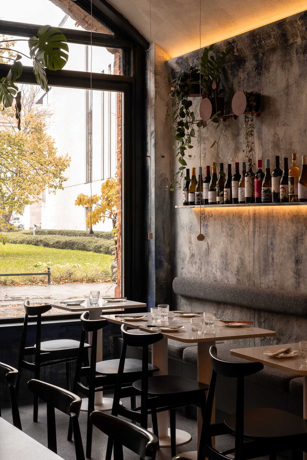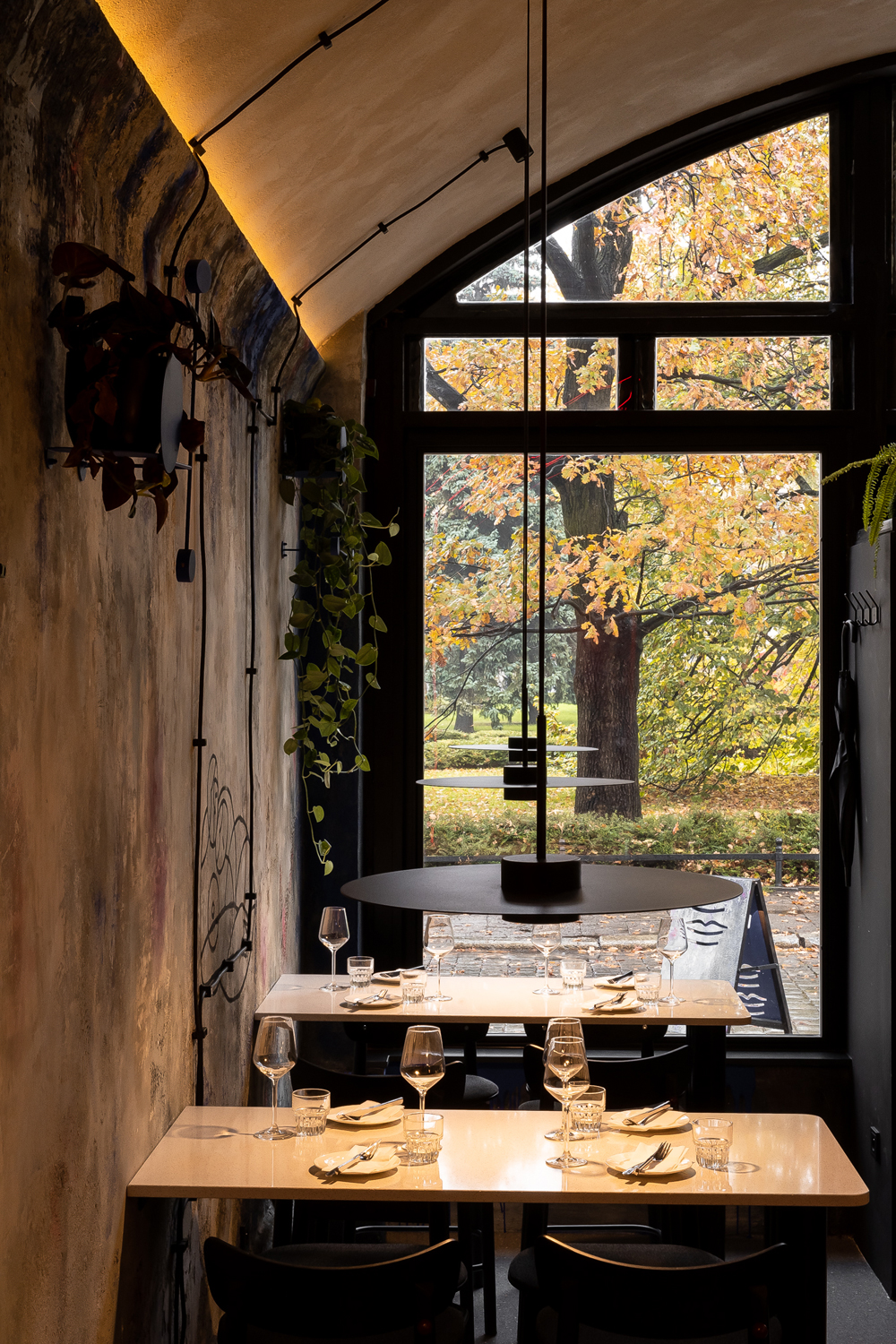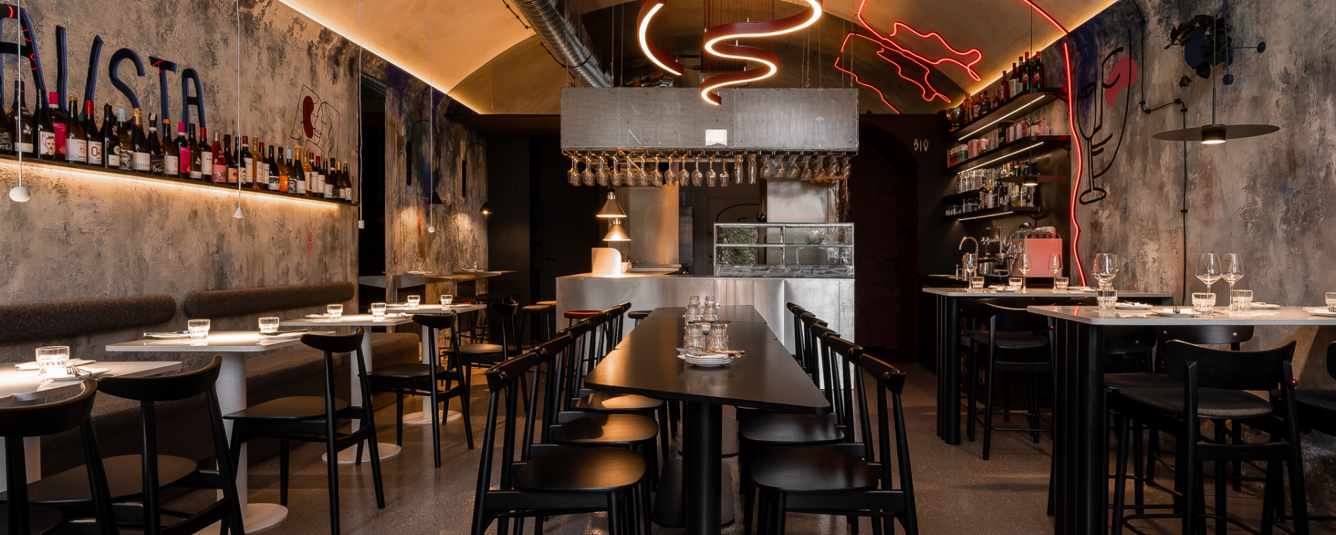 Wystrój wnętrza zbudowano na zasadzie silnego kontrastu. Surowy, industrialny charakter ścian i stalowych elementów konstrukcyjnych został zestawiony z elegancją mebli i wykończenia. To połączenie sprawia, że autentyczna, historyczna tkanka nasypu zyskuje nowoczesny, szykowny wymiar. Stalowe elementy pojawiają się w różnych odsłonach – od tych bardziej surowych (półki, nadwieszenia), po szlachetne i wykończone (bar).