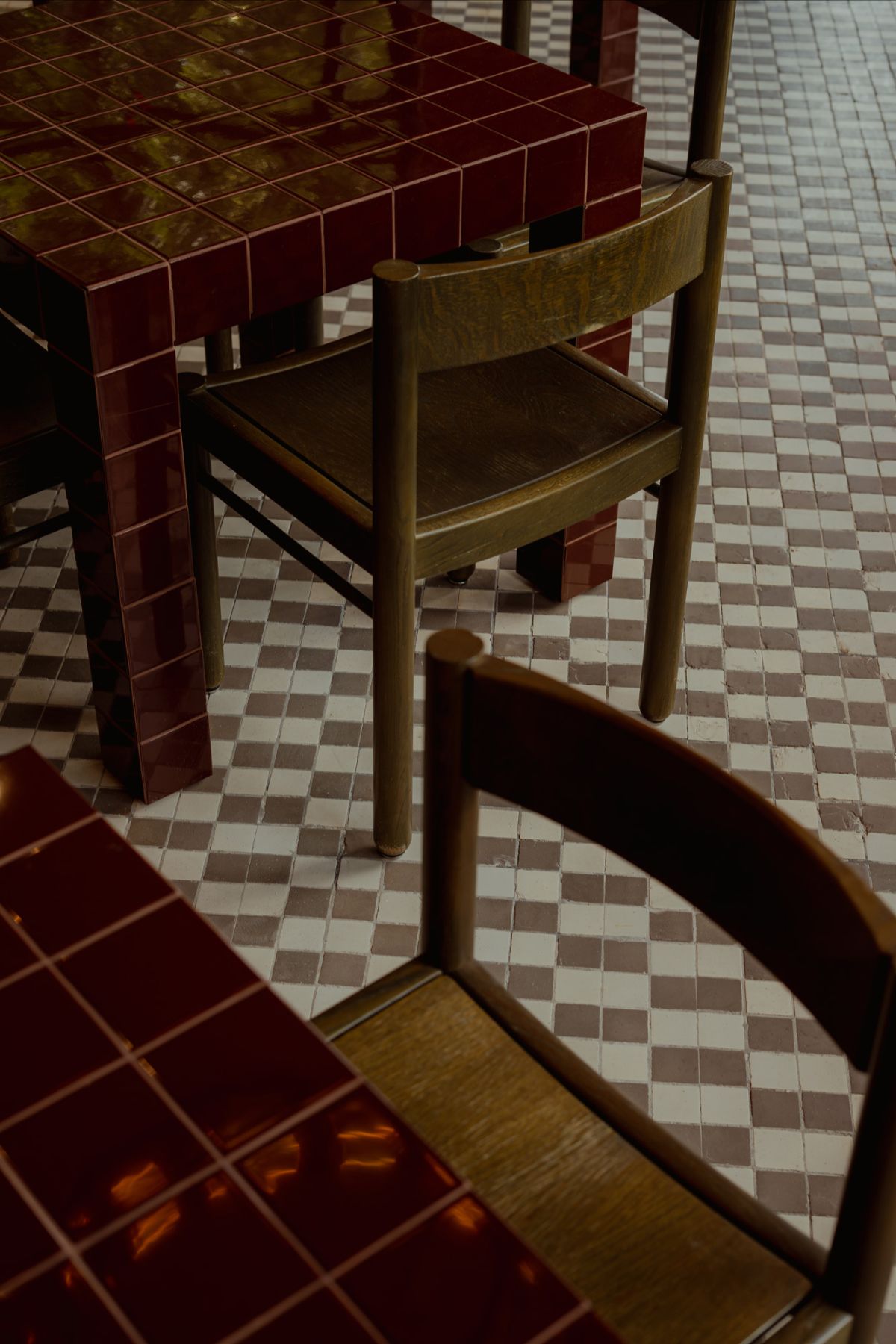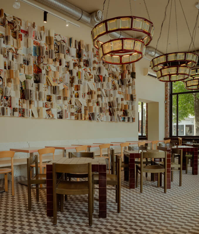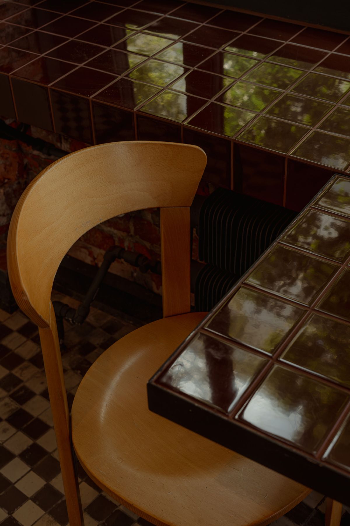 Oryginalne krzesła dostarczył „Krześlarz”, specjalista od wyszukiwania mebli z drugiej ręki. Techniczne oświetlenie pochodzi z Aqform – to modele wycofane ze sprzedaży, które dzięki temu projektowi uniknęły utylizacji. Wysokie wnętrze dopełniły trzy monumentalne lampy z luksferów, wykonane przez warsztat Różne Rzeczy.
