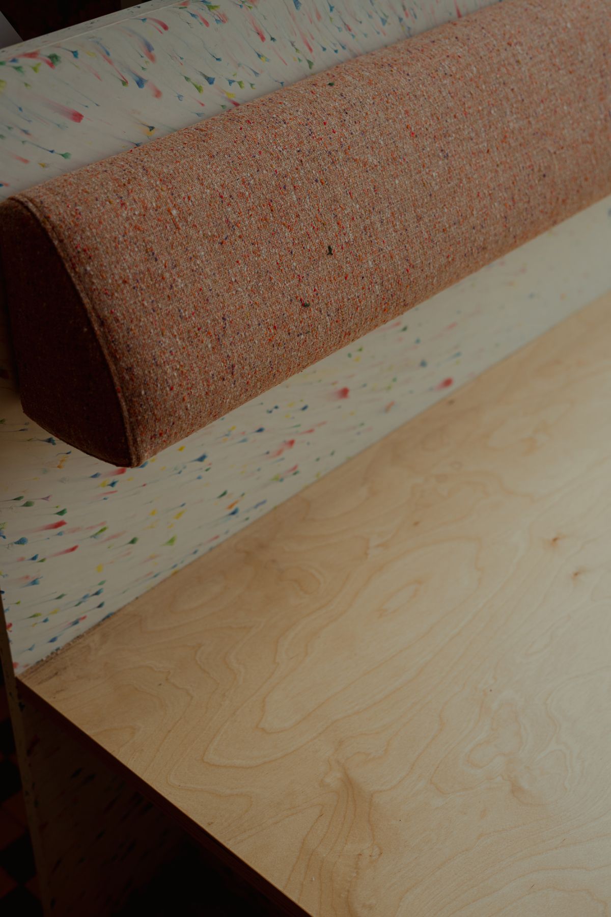 Meble również powstały z materiałów z odzysku. Stoliki, parapety i wyposażenie łazienki wykonano z płytek z lat 80. i 90. zakupionych na OLX. Kanapy zbudowano z płyt Boomplastic – powstających z przetopionych kapsli PET. Tapicerowane oparcia uszyto z tkaniny marki Dekoma, również wyprodukowanej w procesie recyklingu.