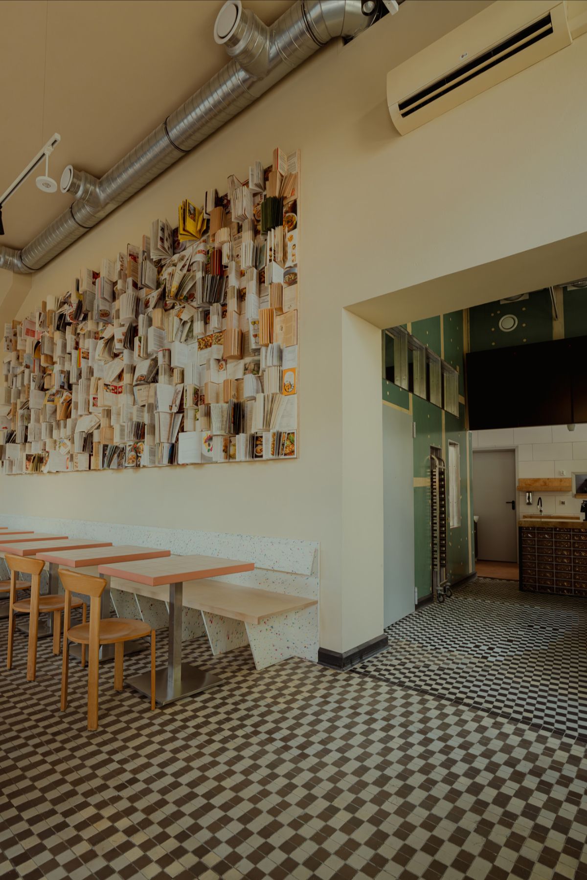 Szczególnym wyzwaniem była sześciometrowa ściana. Początkowo planowano odsłonić na niej duże logo, jednak projektanci zaprosili do współpracy Easy’ego – warszawskiego artystę street artu. To on zaproponował instalację stworzoną ze zużytych książek kucharskich. Obok nowego logotypu stała się ona wyjątkowym, charakterystycznym elementem wnętrza.