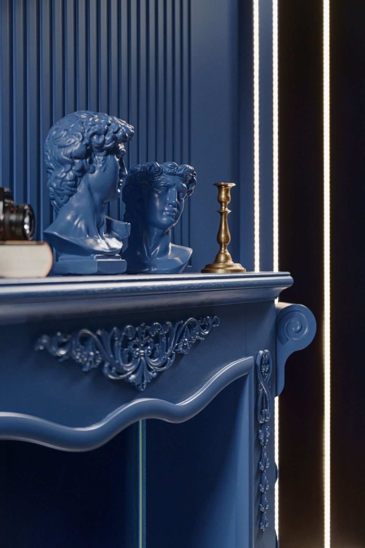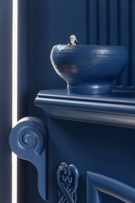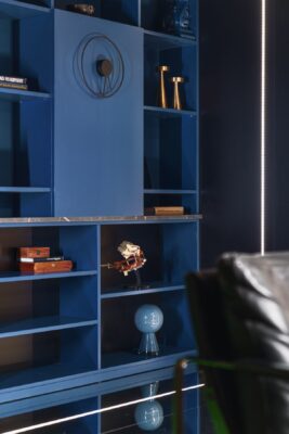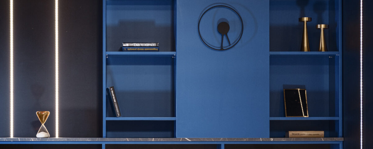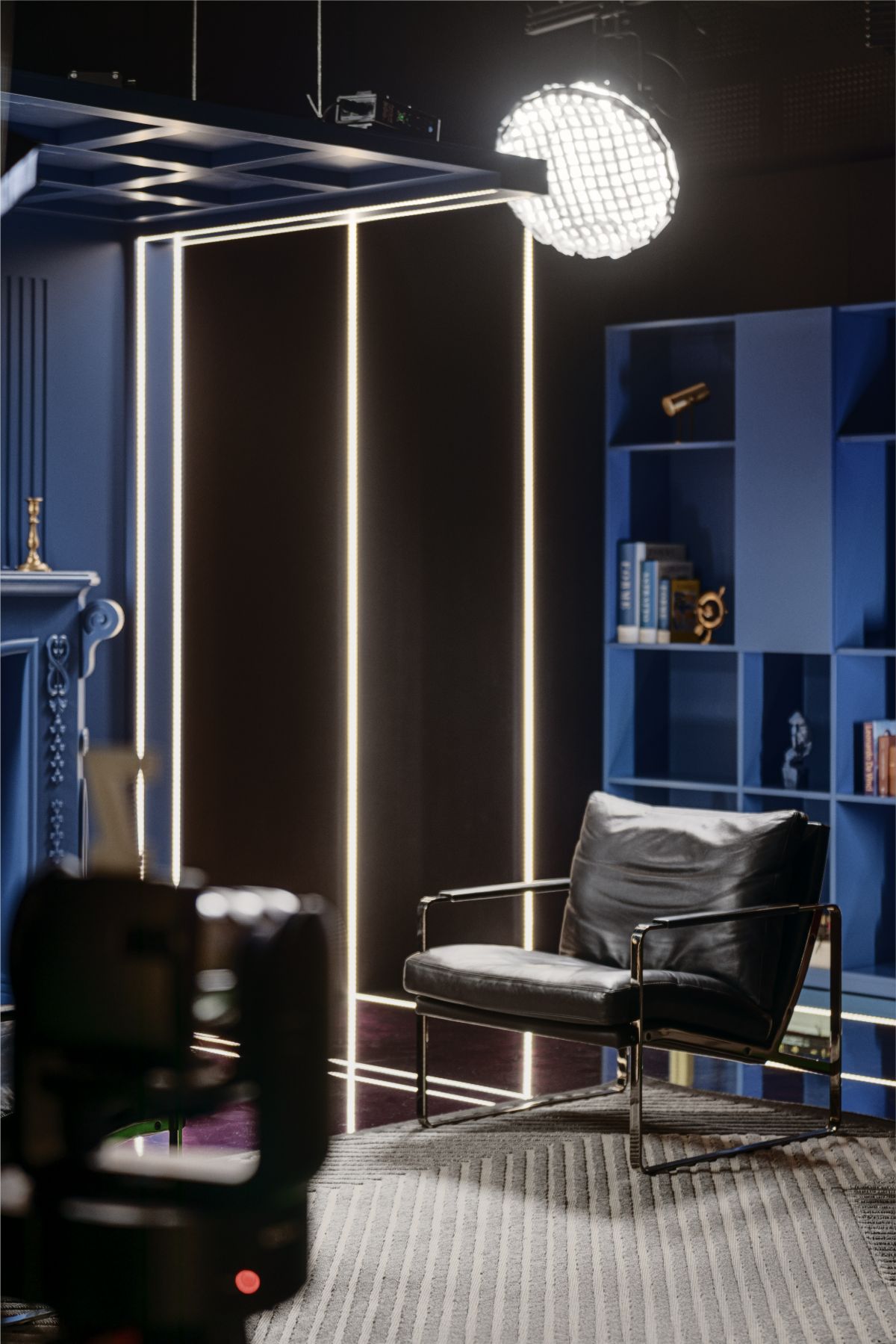 Studio „Didaskalia” to zaledwie 30 metrów kwadratowych, a mimo to – robi wrażenie. Wszystko za sprawą scenografii, gry światłem i nieoczywistych zestawień. Uwagę przykuwa głęboki niebieski kolor, który stał się znakiem rozpoznawczym tej realizacji. – Ten kolor pojawił się już w pierwszej wersji studia i był dla widzów rozpoznawalny. Chcieliśmy stworzyć jego naturalne rozwinięcie – swoisty upgrade – tłumaczy architekt.