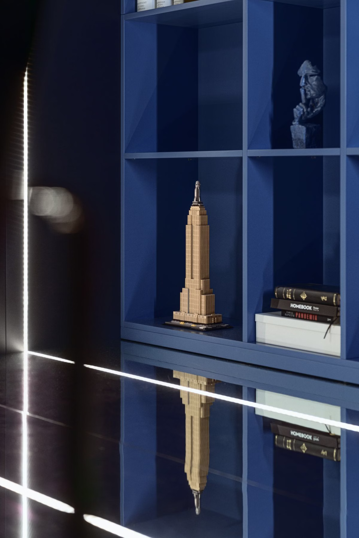 Na niebieskim tle wyróżniają się klasyczne popiersia – to nie tylko dekoracja, ale symboliczne nawiązanie do kanonu wartości: prawdy, dobra i piękna. Obok pojawiają się świeczniki, pudełka po kubańskich cygarach czy miniatura Empire State Building – każdy detal ma znaczenie, każdy opowiada historię. Linie świetlne, jakby żywcem przeniesione ze statku Enterprise, wzmacniają futurystyczny klimat, a lustrzana podłoga nadaje całości niemal odrealnionego wymiaru. – To przestrzeń, którą część osób uważa za generowaną komputerowo. Tymczasem wszystko zostało wykonane fizycznie – zbudowaliśmy studio w dwa dni. Elementy, jak linie na dywanie czy nawis sufitowy, powstały w naszej pracowni – mówi Sikora.