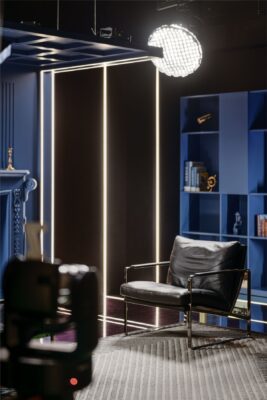 Projekt „Didaskalia” różni się zasadniczo od wnętrz mieszkalnych. Tutaj kluczowe są kadry, praca światła i finalny obrazek, który zobaczy widz. Wszystko musi być podporządkowane kamerze – fotel nie może zasłaniać tła, a ono samo powinno być zróżnicowane, nie monotonne. – Wizualizacje do takich projektów są zupełnie inne niż w przypadku restauracji czy mieszkań. Tutaj wszystko projektujemy od kadru – finalny obrazek to punkt wyjścia – zaznacza architekt.