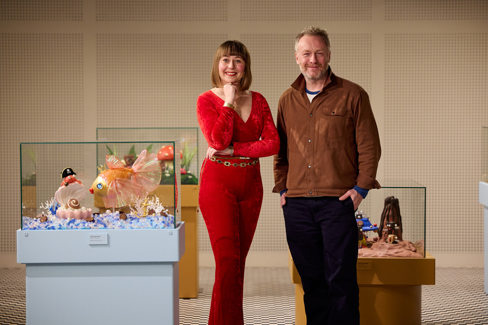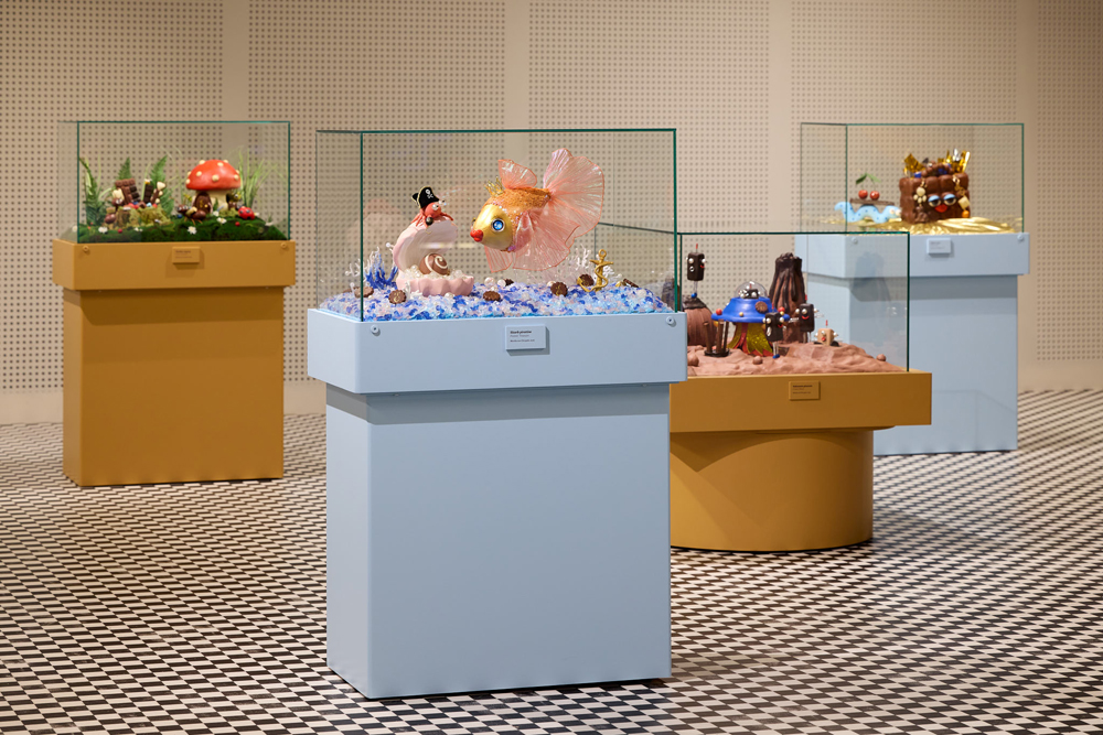 W centrum wystawy znajdują się dioramy stworzone specjalnie dla muzeum Fabryka Czekolady E.Wedel. Pierwsza z nich, „Zakochana Para”, wykorzystuje czekoladę jako język uczuć – przedstawia dwa wafelki w wersji sceny balkonowej z „Romea i Julii” – romantycznej, teatralnej i wzruszającej. „Słodkie zapasy” to świat drobnych leśnych istot, które zamiast zwykłych jagód znajdują w trawie… wedlowskie czekoladki. Nastaje radość, wspólnota i obietnica zimy, która wcale nie musi być chłodna. W „Skarbie piratów” perłowa pralinka ukazana jest jako skarb oceanu, strzeżony przez kraba pirata zakochanego w złotej rybce. To baśń pełna blasku i nostalgii za tropikalnymi przygodami. „Kakaowa Planeta” to międzygwiezdna podróż pianek Ptasie Mleczko®, które odkrywają kosmiczny krajobraz zbudowany z czekoladowych skał i gejzerów kakao. Ostatnia diorama, „Choco Coco”, to surrealistyczna wariacja inspirowana Elsą Schiaparelli. Elegancka torebka z kostek czekolady, praliny na salonach – to bogaty świat mody w miniaturowej formie.