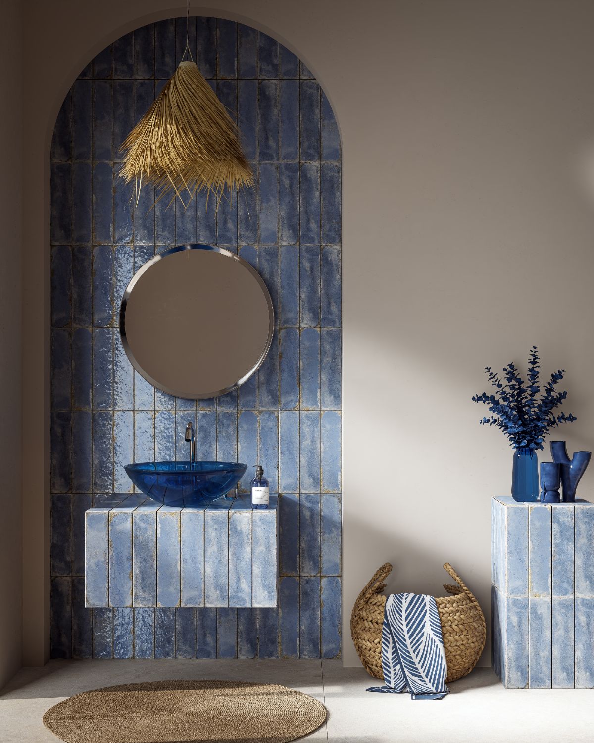 Wymiary cegiełek (7,4 × 30 cm) sprzyjają kreatywnej zabawie z układem. Palette można układać klasycznie w cegiełkę, w jodełkę, pionowo lub z przesunięciem, tworząc rytmiczne kompozycje, które podkreślą charakter przestrzeni. To format, który świetnie odnajduje się zarówno na całych powierzchniach, jak i w formie akcentów dekoracyjnych.