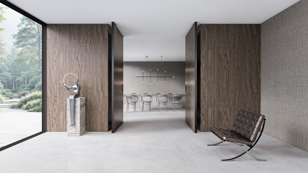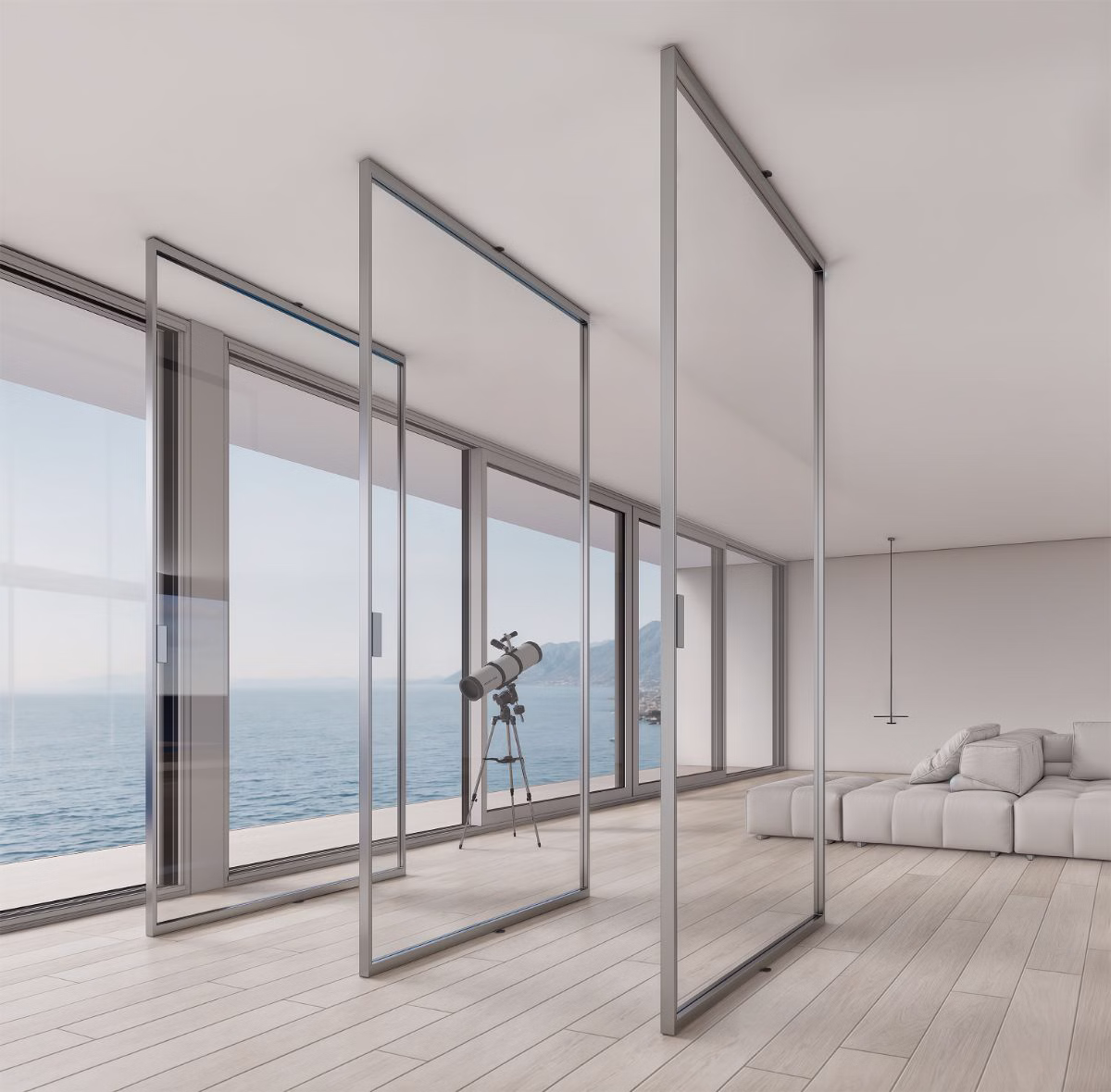 System występuje w dwóch odsłonach: PIVOT ALU z aluminiową konstrukcją, oferującą dowolne wykończenia – od forniru i spieku kwarcowego, po beton architektoniczny, lakier, tapetę czy farbę oraz PIVOT GLASS, czyli pełne przeszklenia z możliwością personalizacji podziałów i dodania aluminiowych szprosów.